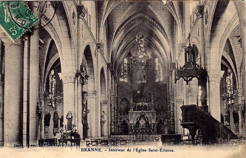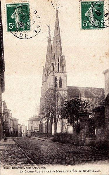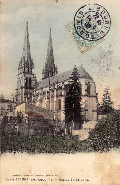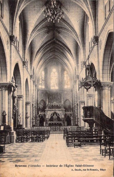 L'église Saint-Étienne et Sainte-Luce de Branne a été édifiée sur l'emplacement d'un ancien bâtiment détruit en 1859. Sous l'impulsion de l'abbé Lapeyre, qui trouva à son arrivée une église vétuste, la reconstruction fut engagée avec le soutien du cardinal Donnet. La construction fut presque entièrement financée par les dons des paroissiens et par l'abbé lui‑même. Pierre‑Paul Courau fournit les plans de la nouvelle église ; les vitraux sont l'œuvre de Joseph Villiet et les peintures du chevet sont attribuées à Ricaud. Les travaux commencèrent en 1862 et l'édifice fut consacré en 1878.