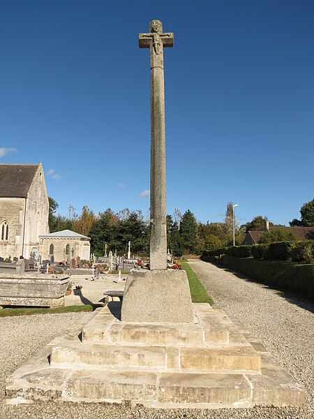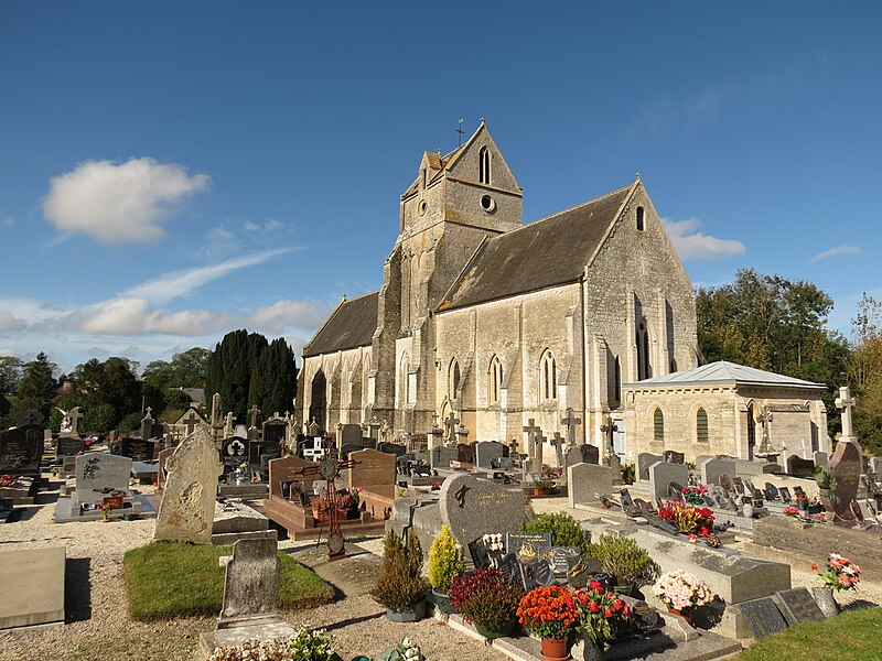 La tour-clocher, percée de lancettes géminées au rez-de-chaussée et pourvue d'arcatures aveugles au premier étage, comporte des oculus à huit lobes et des lucarnes sous le toit en bâtière; son aspect et la disposition des ouvertures la rapprochent des églises voisines de Vaucelles, Cussy, Barbeville et Étréham.