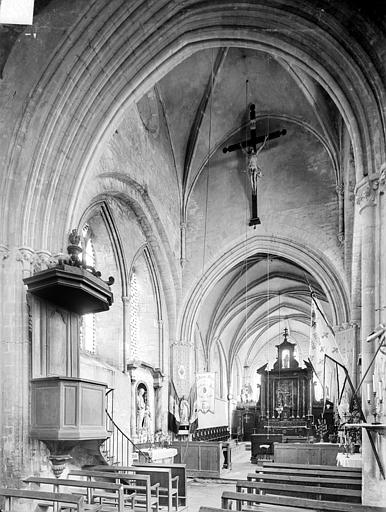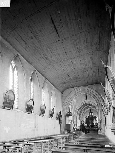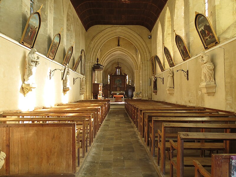 La nef compte quatre travées, éventuellement prolongées par l'assise sous le clocher, et semble avoir été bâtie en même temps que la tour-clocher; elle est éclairée par des lancettes géminées, au nombre de huit côté sud et de sept côté nord. La nef est couverte de lambris et le sol est pavé de schiste du sud de Caen et de calcaire de Creully. L'assise du clocher, plus étroite en raison de l'épaisseur des murs porteurs, est voûtée d'ogives quadripartites dont les nervures retombent sur des colonnes à culs-de-lampe ornés de visages masculins à l'ouest et féminins à l'est, et dont les chapiteaux portent des motifs végétaux.