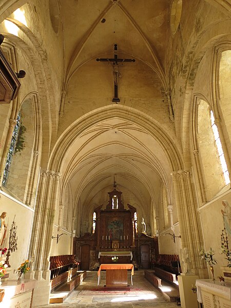 Le chœur, la partie la plus ancienne, date du XIIIe siècle et comprend trois travées voûtées d'ogives sexpartites, disposition peu ordinaire en Normandie. Chaque travée est éclairée par une paire de fenêtres composées principalement de deux lancettes séparées par un meneau et surmontées d'un oculus; le chevet, divisé par quatre contreforts, reprend ce même schéma avec une baie centrale plus large. Entre la première et la seconde travée, deux colonnettes reposent sur des culs-de-lampe sculptés de têtes amaigries et chevelues.