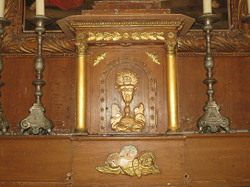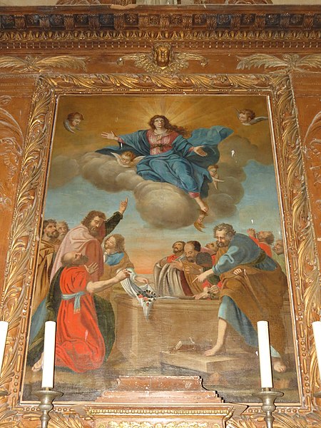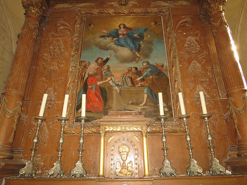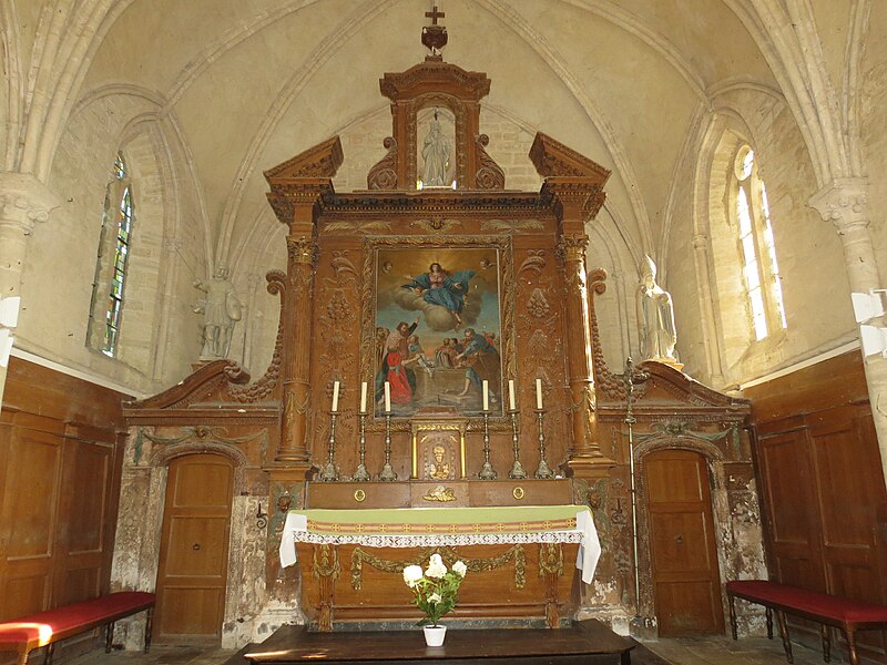 Le maître-autel, de la seconde moitié du XVIIIe siècle et de style Louis XVI, est en pierre, plâtre et bois; il présente la forme d'un tronc de pyramide inversé et une décoration de consoles, guirlandes et d'un médaillon portant les cœurs de Jésus et de Marie. Le retable en pierre taillée, du XVIIe siècle, porte au centre un tableau de l'Assomption de la Vierge et une inscription mentionnant l'année 1677; il est encadré de colonnes corinthiennes, de draperies et d'ornements sculptés, et couronné par une niche abritant une statue du Christ rédempteur. L'ensemble autel-retable-tableau a été classé monument historique en 1975, et les trois statues qui l'ornent ont été classées en 1982; le tableau de l'Adoration des bergers, une huile du XVIIe siècle, est classé depuis 1917.