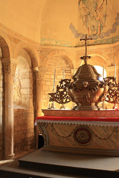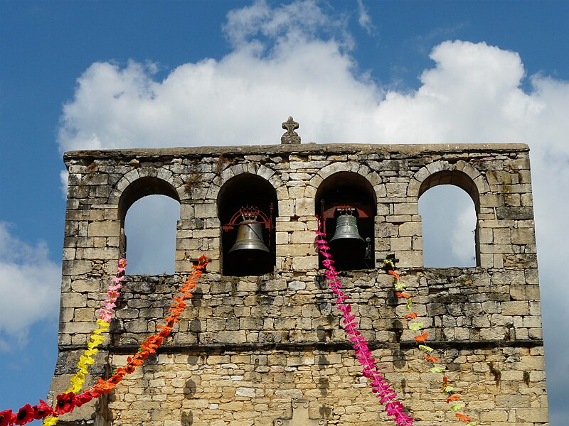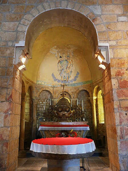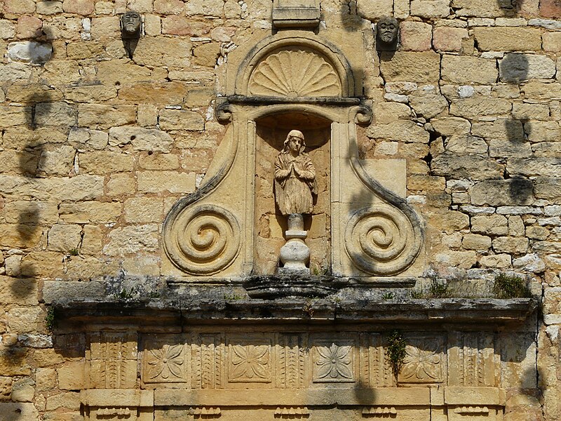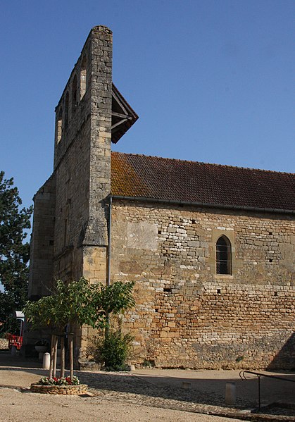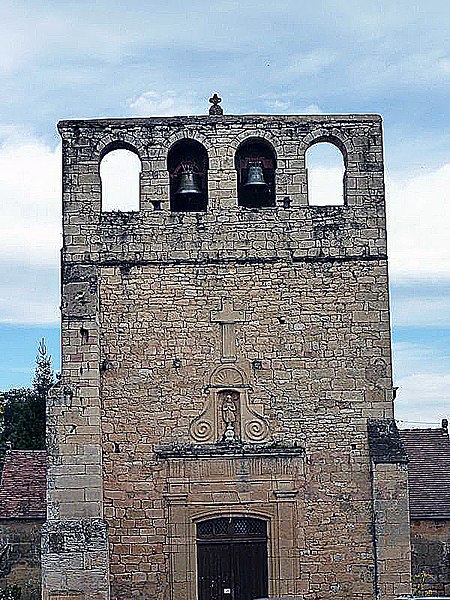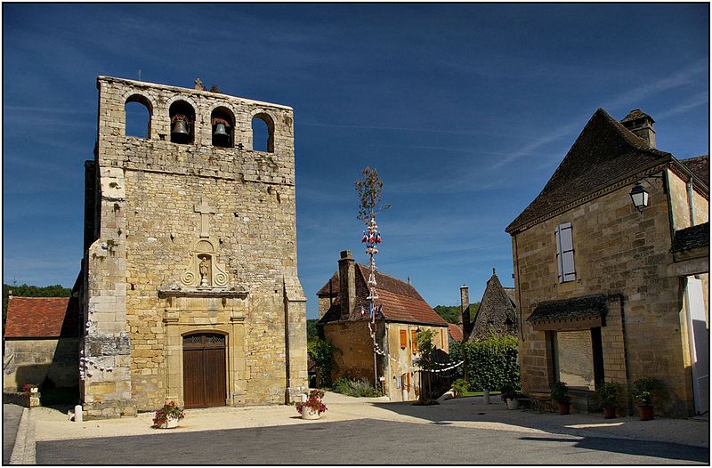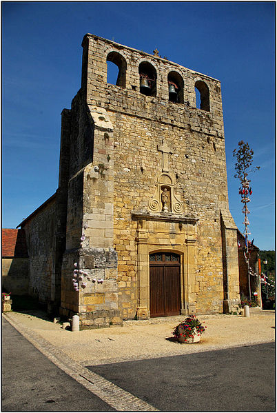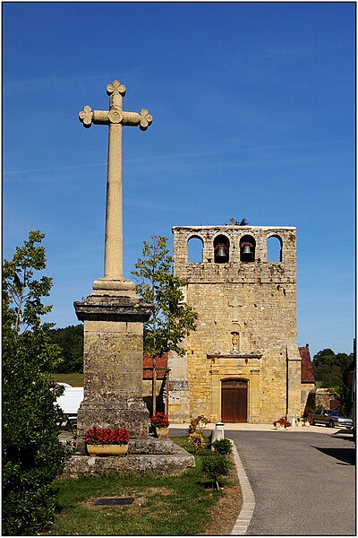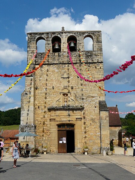 L'église Saint-Eutrope de Meyrals, située dans le bourg près de la route départementale 35, est un édifice roman principalement édifié au XIIe siècle. Elle a été donnée au prieuré de Saint-Cyprien en 1293 et est dédiée à saint Eutrope, premier évêque de Saintes au IIIe ou IVe siècle. L'église n'est pas orientée selon l'axe est-ouest habituel mais selon un axe nord-est/sud-ouest. De la construction romane subsistent le clocher-mur ouest, la nef, le chœur et l'abside demi-circulaire. Au XVe ou XVIe siècle, les seigneurs de Beynac firent bâtir la chapelle sud, dite de la Vierge, qui servit de chapelle funéraire. Aux XVIIIe et XIXe siècles, des transformations ont modifié l'édifice : la sacristie a été aménagée au XVIIIe siècle au nord du chœur, les baies et le portail ouest ont été remaniés et le clocher remis en état en 1843, puis une chapelle nord dédiée à saint Joseph a été construite en 1865. Le portail ouest, reconstruit au XVIIIe siècle après un incendie survenu vers 1587 pendant les guerres de Religion, est encadré de pilastres et surmonté d'une niche ouvrant sur la nef. Les murs latéraux conservent cependant des baies romanes primitives. Le chœur s'ouvre sur une abside ornée d'une arcature composée de neuf arcs retombant sur dix colonnes à chapiteaux à décor végétal. Après l'effondrement du toit en lauzes de la nef en 1907, la couverture a été remplacée par une toiture en tuiles, tandis que la lauze subsiste au-dessus du chœur. L'église fait l'objet d'une protection au titre des monuments historiques depuis le 3 juillet 2007.