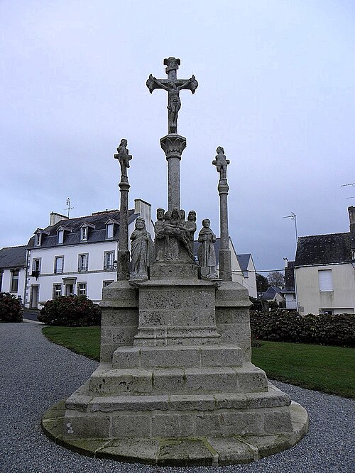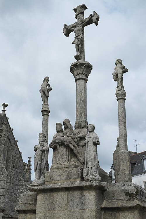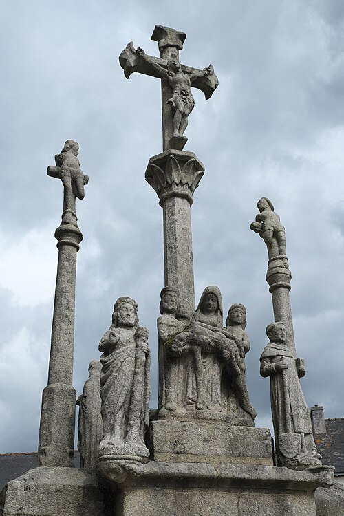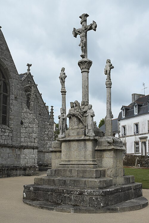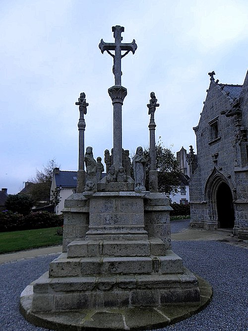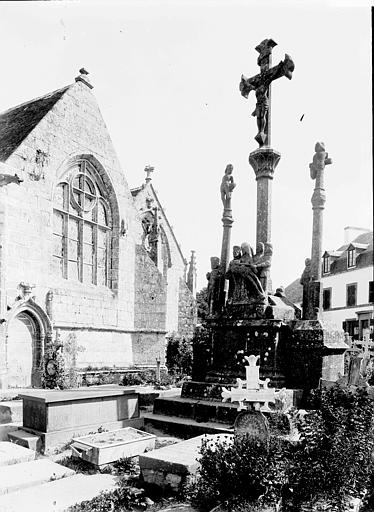 L'église Saint-Fiacre de Guengat (Finistère) est implantée au sein d'un enclos paroissial. Sa construction remonte aux XVe–début du XVIe siècle et l'édifice a été remanié aux XVIIIe et XIXe siècles. La chute de la flèche a entraîné en 1706 la reconstruction ou la restauration des pignons, notamment ceux des chapelles sud. Le clocher a été reconstruit en 1892 par Jean‑Marie Abgrall, qui a également participé à la restauration du calvaire au XIXe siècle. L'église et le calvaire sont classés monuments historiques par arrêté du 22 juillet 1914. L'ossuaire, construit en 1557, présente deux baies en accolade et porte l'inscription « 1557 RESPICE FINEM ». Plusieurs inscriptions anciennes figurent encore sur le site, dont une datée de 1706. La grande fenêtre du chevet et d'autres verrières conservent des vitraux anciens; la maîtresse-vitre, datée de 1571, retrace des scènes de la Passion, et certaines baies contiennent des panneaux provenant d'une église antérieure. L'intérieur livre un mobilier et des décors remarquables : statues, un groupe du baptême du Christ, un groupe de la Crucifixion, des poutres et des sablières sculptées — ces dernières attribuées à Ian Hamoun et représentant des scènes de la vie quotidienne. Les gisants d'Hervé de Saint‑Alouarn et de son épouse Marie de Trégain (1426) y sont également conservés. Un petit calvaire du XVe siècle se trouve dans le cimetière de l'enclos. Le porche, de style gothique flamboyant, est surmonté d'une chambre ouverte par une fenêtre sur la façade, et l'ensemble présente un plan intérieur assez irrégulier.