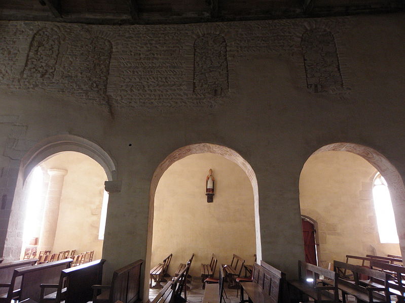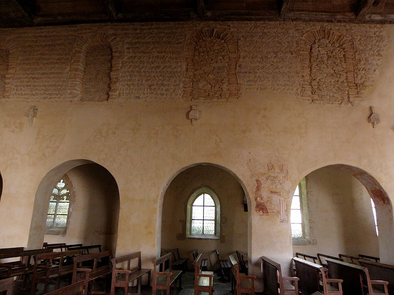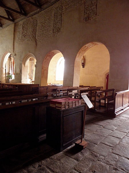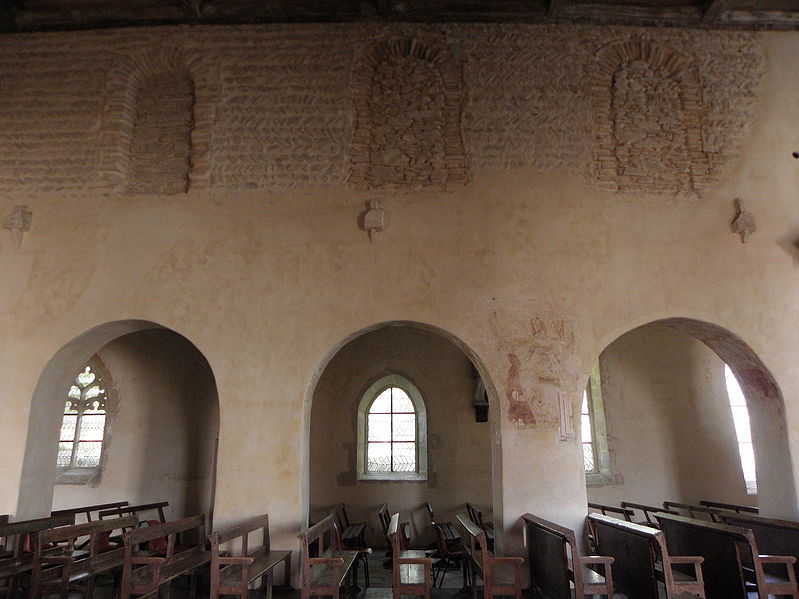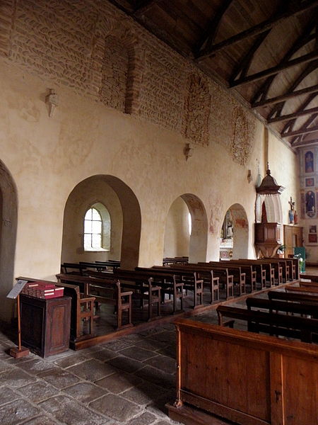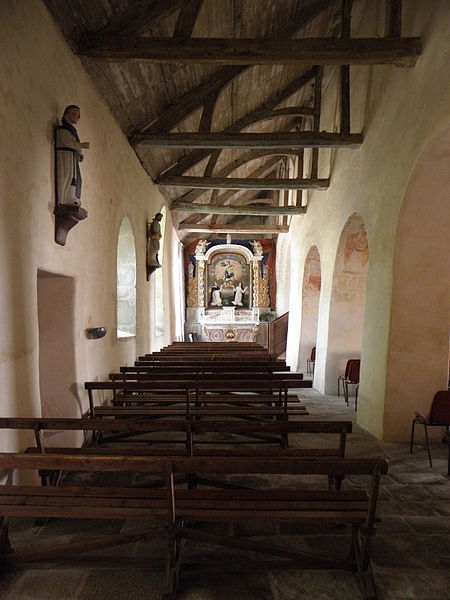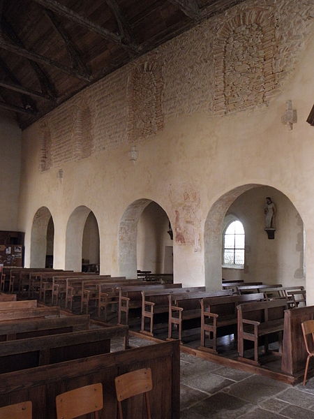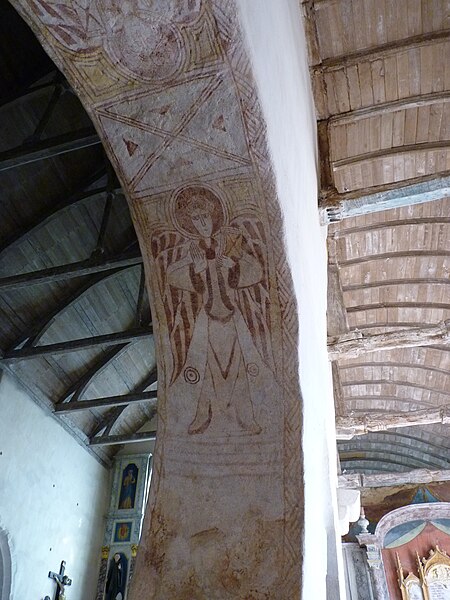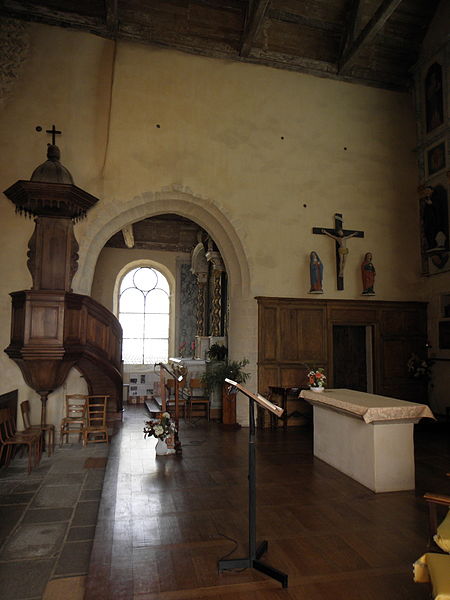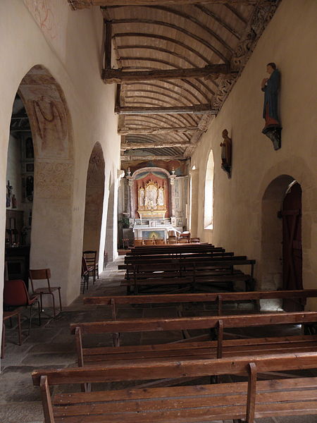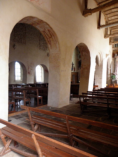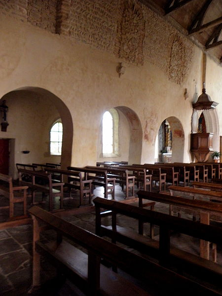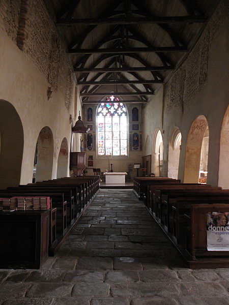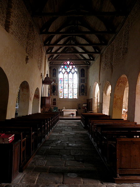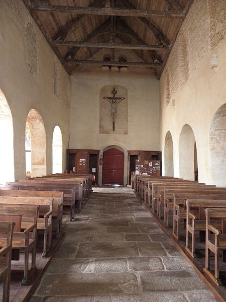 La nef romane, composée de cinq travées et flanquée de bas-côtés, est couverte d'une charpente ; ses arcades en plein cintre retombent directement sur des piliers carrés dépourvus d'imposte. Au-dessus, le mur nu était percé de grandes fenêtres peu ébrasées montant jusqu'aux cintres ; ces baies ont été murées lors de la reconstruction qui a rehaussé la couverture des bas-côtés, alors que la nef était à l'origine largement éclairée par des collatéraux plus bas. On note la présence d'un appareillage en opus sicatum dans la maçonnerie de la façade occidentale ; ces dispositions, caractéristiques du premier art roman, plaident pour une datation autour ou plutôt avant l'an 1000. Sous l'enduit ont été découvertes, à l'intrados des grandes arcades, des fresques romanes ainsi que des peintures gothiques et du XVIIe siècle. Les peintures romanes représentent des anges et des saints en pied accompagnés d'inscriptions, insérés dans un décor géométrique et végétal, et comprennent une très rare représentation de saint Michel psychopompe avec un apport stylistique byzantin. Elles sont sans équivalent par leur style, semblent indépendantes des écoles régionales qui ont produit les autres peintures bretonnes, et ont été exécutées avec une gamme de pigments très réduite ; leur stylisation rappelle à plusieurs égards les sculptures de chapiteaux romans, notamment celles de l'église Saint-Pierre-et-Saint-Paul de Fouesnant. La datation de ces peintures fait l'objet d'un débat : elles sont placées par divers auteurs entre le IXe et le XIIe siècle, certains estimant un début du XIe siècle, d'autres les rattachant au XIIe, tandis qu'une hypothèse propose des couches anciennes du Xe siècle retouchées au XIIe siècle.