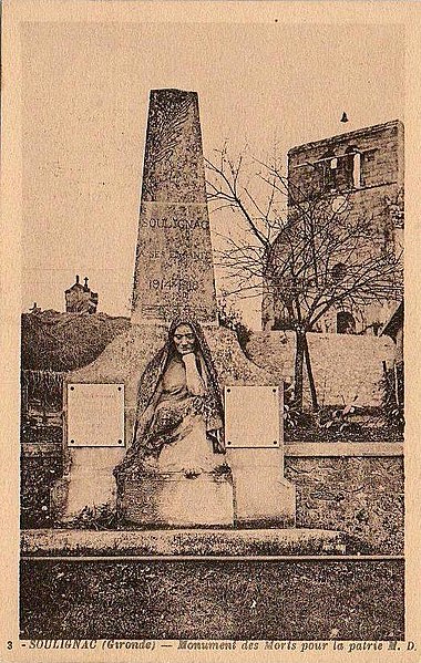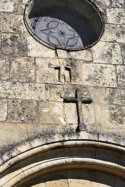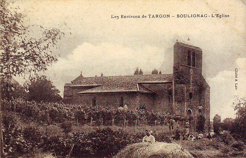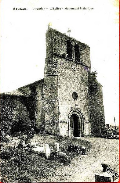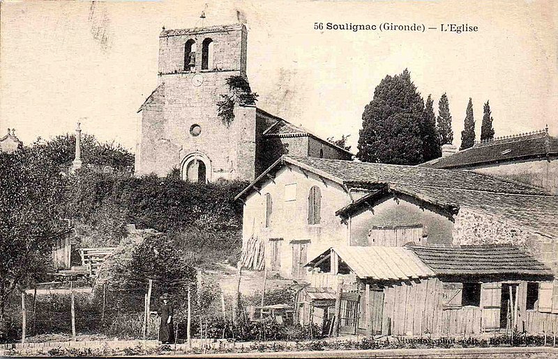 Située au sommet d’un promontoire au cœur du bourg de Soulignac (Gironde), l’église Saint-Genès présente un chevet plat et une nef en trois travées, l’ensemble étant couvert de voûtes sur ogives tandis que les bas-côtés ne sont pas voûtés. La façade ouest est dominée par un clocher-mur rectangulaire percé de deux baies pour les cloches et soutenu aux angles par des contreforts montés en biais ; le contrefort sud porte un cadran canonial probablement datable du XVIIe siècle. Les fondations et certaines pierres du chevet témoignent d’une origine romane ancienne, hypothèse déjà avancée par Léo Drouyn en raison de fenêtres étroites, de la nef non voûtée d’origine et des marques de tâcherons; des fouilles récentes ont confirmé ces assises romanes. De l’édifice roman subsistent des pierres du chevet portant des marques de tâcherons et trois reliefs remployés sur la façade : un orant habillé, rapproché d’œuvres du début du XIIe siècle, et deux sculptures très dégradées, dont l’une est illisible et l’autre, de style tardif du XIIe siècle, représente une figure humaine aux attributs symboliques souvent interprétés comme une allégorie de la libido. Le sanctuaire et la nef ont été remaniés au XVIe siècle, tandis que deux bas-côtés encadrant la nef primitive ont été ajoutés sans doute au XVIIe siècle. À l’intérieur, on note des fonts baptismaux du XVe siècle et une chaire de pierre du XVIIe siècle dont la cuve est ornée de motifs géométriques. Une restauration de l’édifice a été achevée en 1853. L’église Saint-Genès a été inscrite au titre des monuments historiques dans son ensemble par arrêté du 21 décembre 1925.