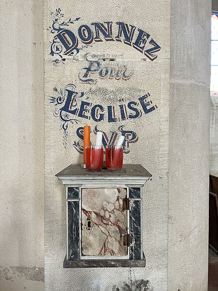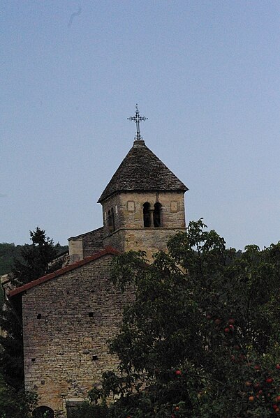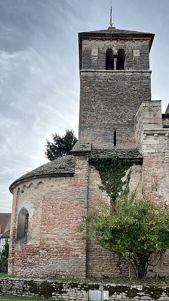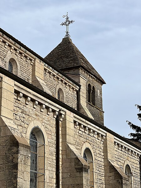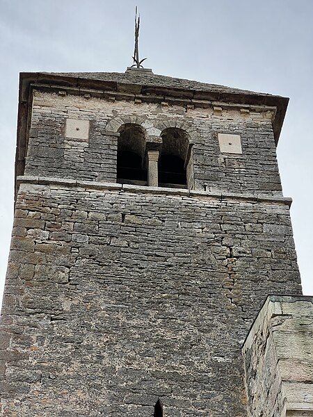 Le clocher, de section carrée et attribué au XIIe siècle, comporte un étage de beffroi percé de baies jumelles reposant sur des colonnettes médianes et est coiffé d'une pyramide basse. Il abrite une cloche unique installée vers 1950, en remplacement de celle qui s'était fêlée le 11 novembre 1918 après avoir été actionnée pendant 35 ans par le père Douez. L'ancienne cloche, datée de 1710 et dont les parrains et marraines étaient mentionnés, a été expédiée le 27 mars 1950 à la fonderie Paccard d'Annecy‑le‑Vieux pour être fondue et servir à la fabrication de la cloche nouvelle.