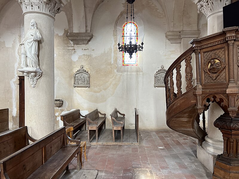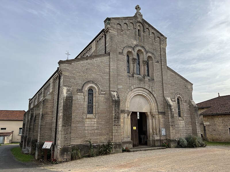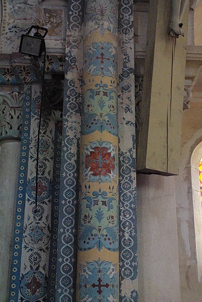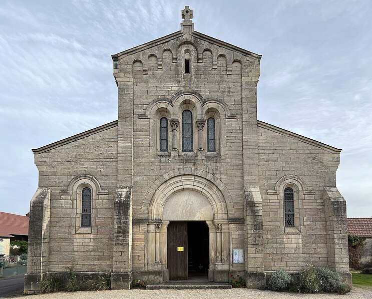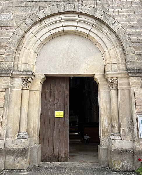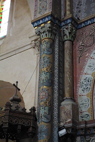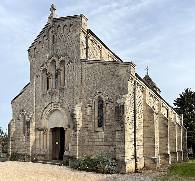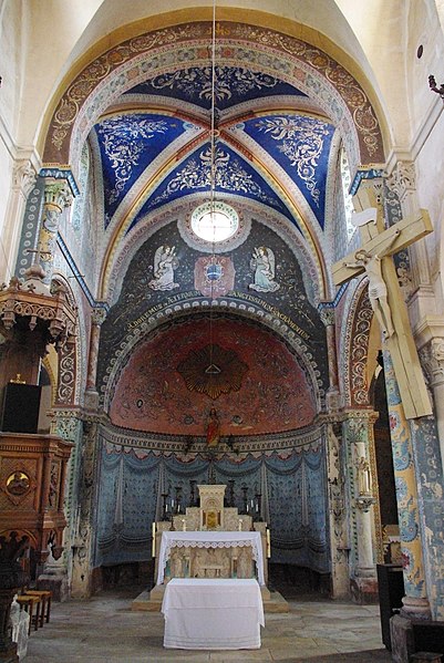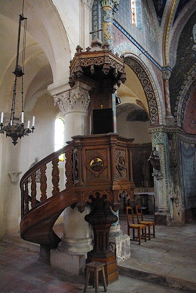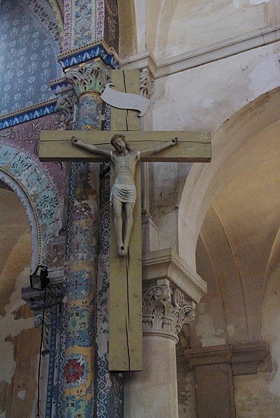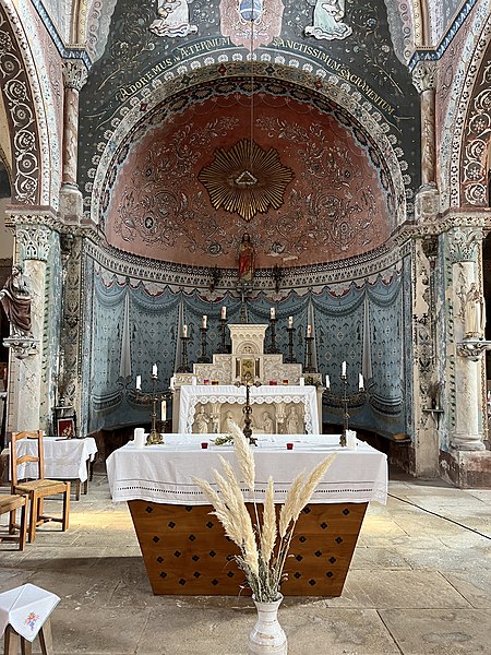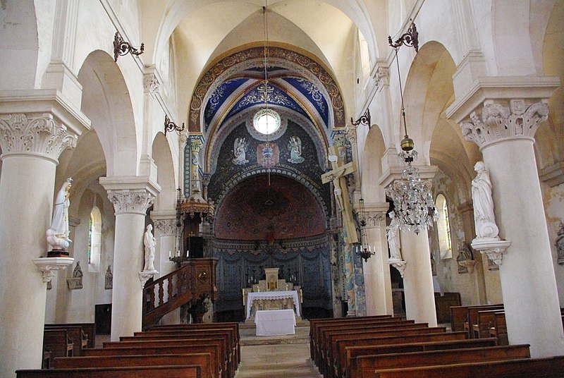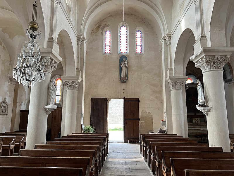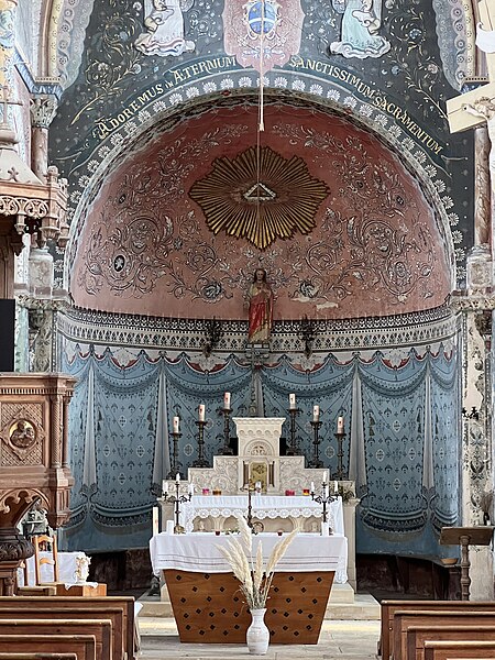 Le bâtiment présente un plan original : une nef moderne flanquée de bas‑côtés dont la dernière travée forme le chœur, suivie d'une abside moderne pourvue d'absidioles. Le nouveau chœur conserve des peintures murales de la fin du XIXe siècle ; sur un fond bleu turquoise deux anges thuriféraires encadrent les armoiries du pape Léon XIII accompagnées de l'inscription latine Adoremus in aeternum sanctissimum sacramentum. Des tentures en trompe‑l'œil entourent l'abside et le cul‑de‑four montre, sur fond rouge vif, le triangle trinitaire irradié d'or. Les parties romanes subsistantes, probablement du XIIe siècle sauf la travée sous clocher et l'abside qui paraissent plus anciennes, comprennent le clocher avec la travée qui le soutient et une abside en hémicycle ornée extérieurement d'arcatures lombardes retombant sur des modillons sculptés ; cet espace sert aujourd'hui de sacristie.