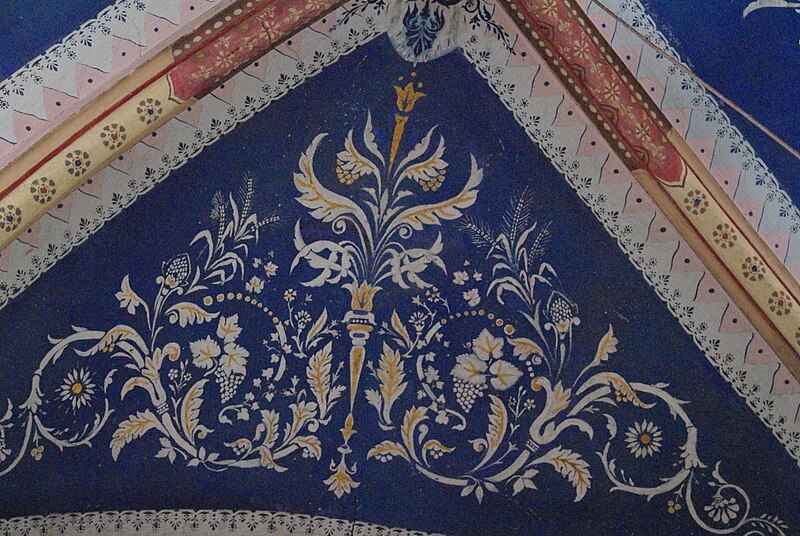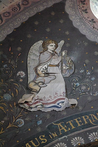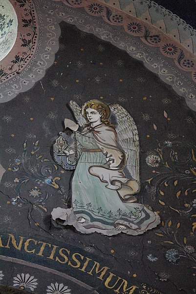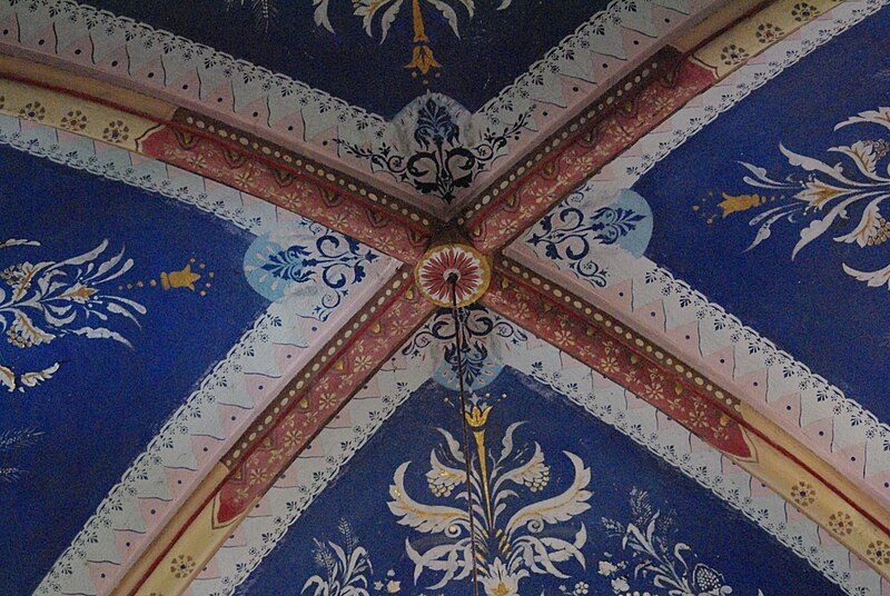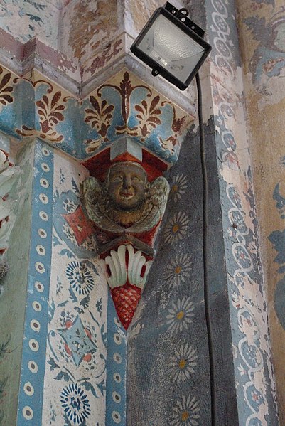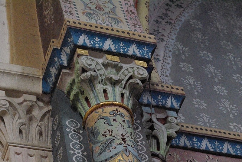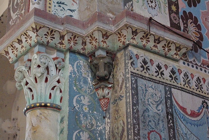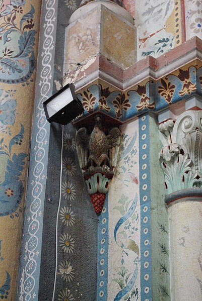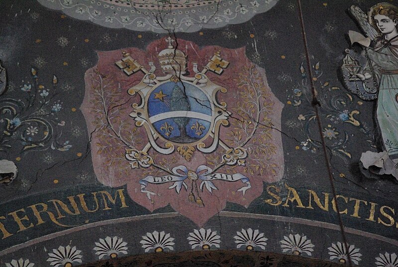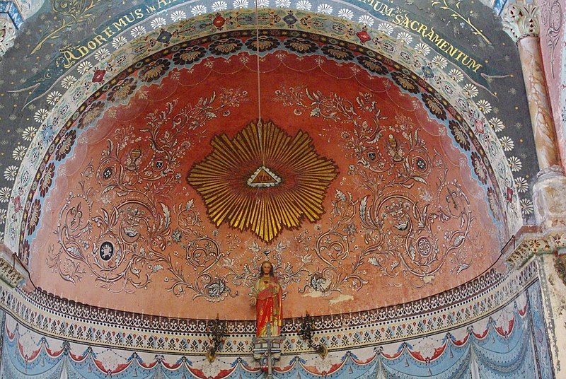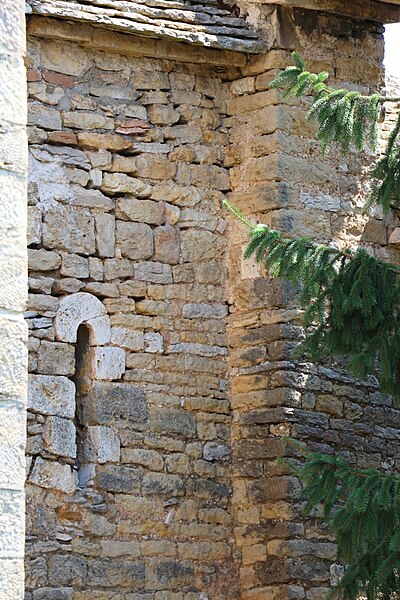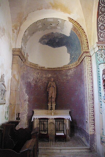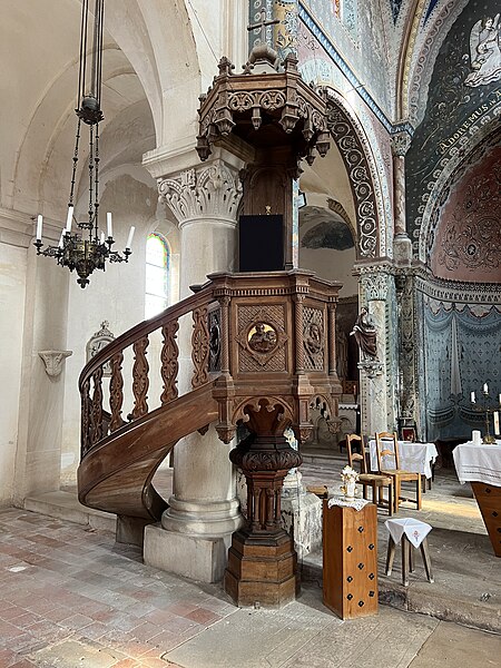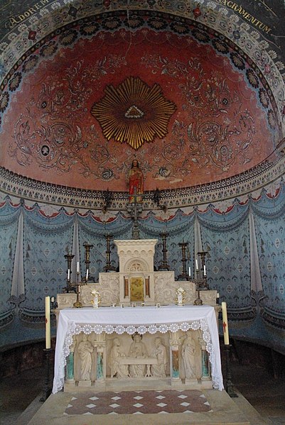 Le bâtiment présente un plan original : une nef moderne flanquée de bas‑côtés dont la dernière travée forme le chœur, suivie d'une abside moderne pourvue d'absidioles. Le nouveau chœur conserve des peintures murales de la fin du XIXe siècle ; sur un fond bleu turquoise deux anges thuriféraires encadrent les armoiries du pape Léon XIII accompagnées de l'inscription latine Adoremus in aeternum sanctissimum sacramentum. Des tentures en trompe‑l'œil entourent l'abside et le cul‑de‑four montre, sur fond rouge vif, le triangle trinitaire irradié d'or. Les parties romanes subsistantes, probablement du XIIe siècle sauf la travée sous clocher et l'abside qui paraissent plus anciennes, comprennent le clocher avec la travée qui le soutient et une abside en hémicycle ornée extérieurement d'arcatures lombardes retombant sur des modillons sculptés ; cet espace sert aujourd'hui de sacristie.