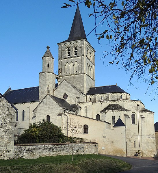 La collégiale Saint-Georges, située à Faye-la-Vineuse (Indre-et-Loire), est une église romane du XIIe siècle, classée au titre des monuments historiques depuis 1931. Elle remplace une construction plus modeste fondée en 1039 par Nivée, épouse d'Aymery Ier de Loudun, et a subi d'importants dommages lors des guerres de religion de 1562 et 1593. Jadis entourée d'un cloître et de bâtiments conventuels, l'église présente une nef de trois travées, un transept, un chœur de deux travées et une abside en cul-de-four prolongée par un déambulatoire auquel s'ouvrent trois chapelles rayonnantes. De chaque côté de l'arc triomphal, des passages latéraux mettent en communication la nef et la première travée de chaque croisillon. Les chapiteaux du chœur sont richement sculptés, figurant notamment des animaux fantastiques et des chevaliers. La nef a fait l'objet de restaurations importantes au XIXe siècle : toutes les bases des colonnes sont modernes et certaines sculptures ou moulurations anciennes ont disparu, tandis que certaines voûtes, particulièrement dans le déambulatoire, semblent dater des XVIIe ou XVIIIe siècles. Une crypte exceptionnelle s'étend sous le chœur et le déambulatoire ; accessible par deux escaliers, elle mesure environ 15 m sur 11 m, comporte une nef centrale de deux travées entourée d'un déambulatoire, une partie centrale voûtée en berceau et des chapelles voûtées correspondant à celles de l'église supérieure. Cette crypte, datée du XIe siècle, a conservé des chapiteaux romans historiés représentant des scènes bibliques — cortège et adoration des mages —, des combats de cavaliers et peut‑être le départ en croisade. Le clocher, implanté sur la croisée du transept, présente au premier étage sur chaque face trois arcatures aveugles en arc brisé et, au second étage, deux baies plein cintre jumelées. Malgré des restaurations discutables au XIXe siècle, l'édifice conserve des caractéristiques architecturales et sculpturales remarquables. La mise en lumière de l'église a été réalisée par l'agence Neo Light.