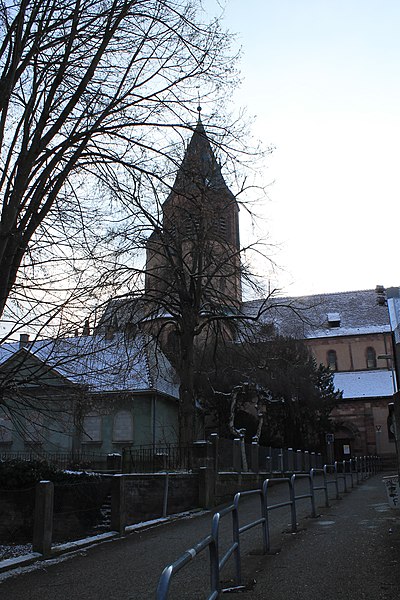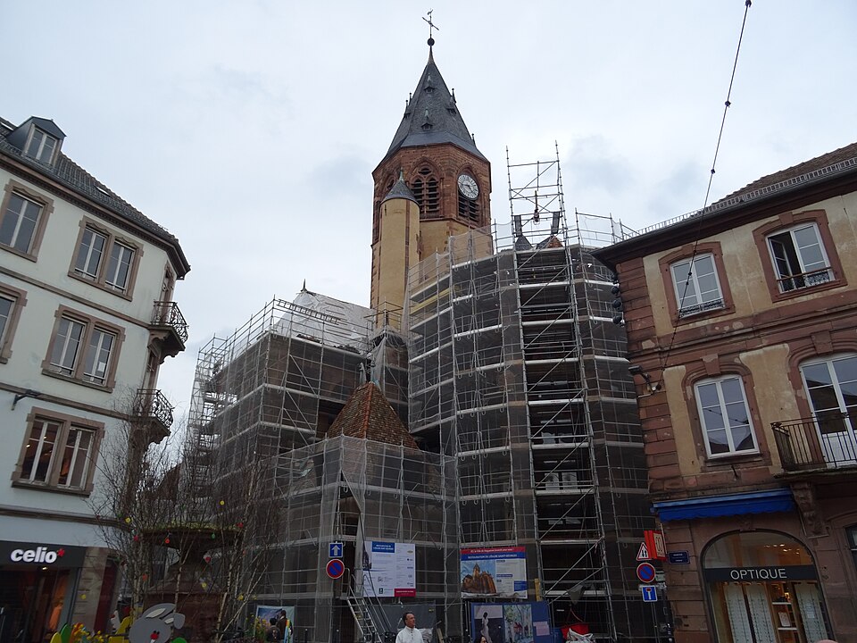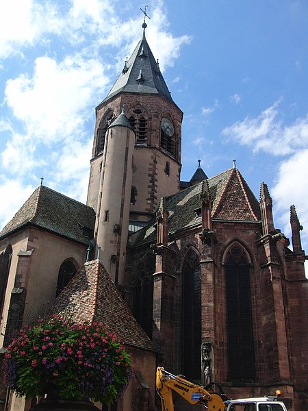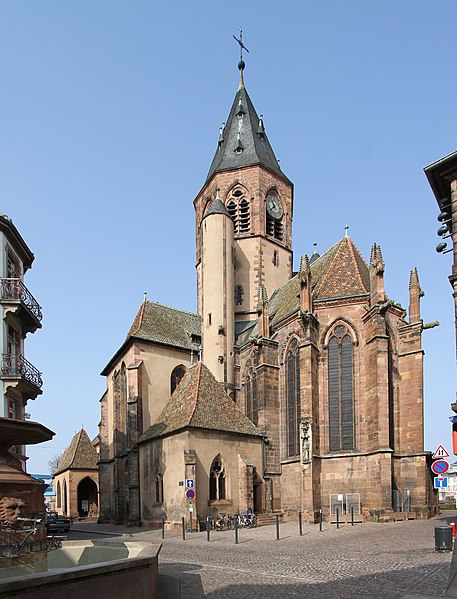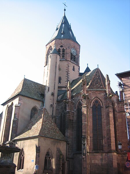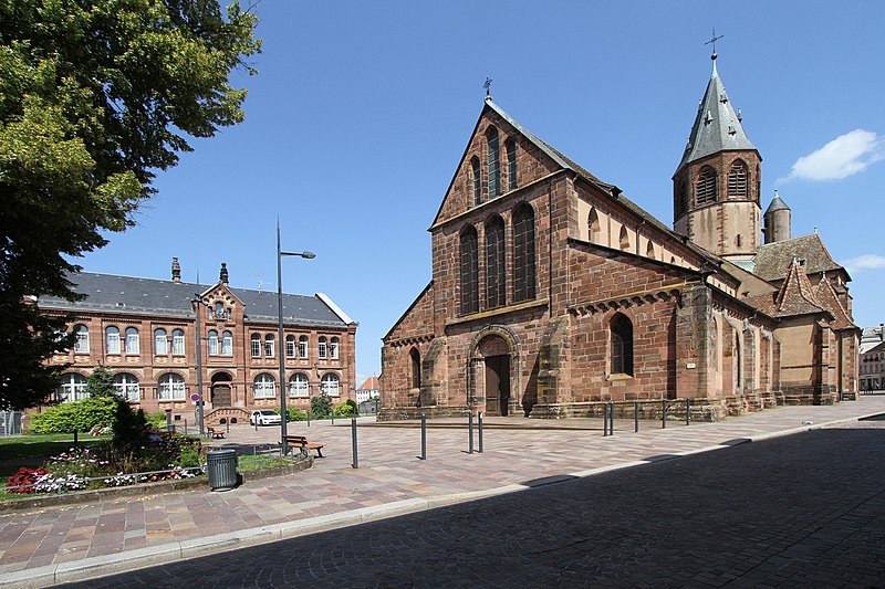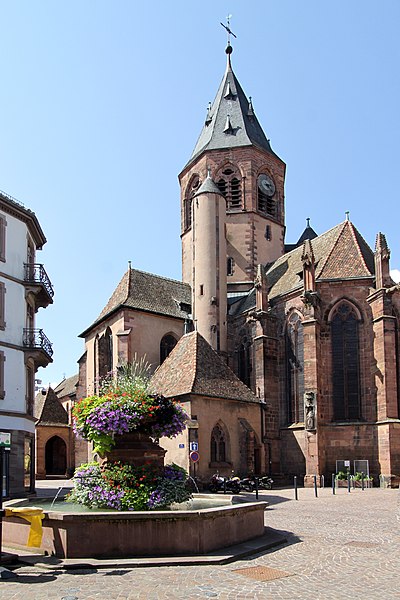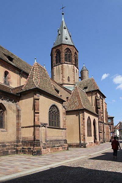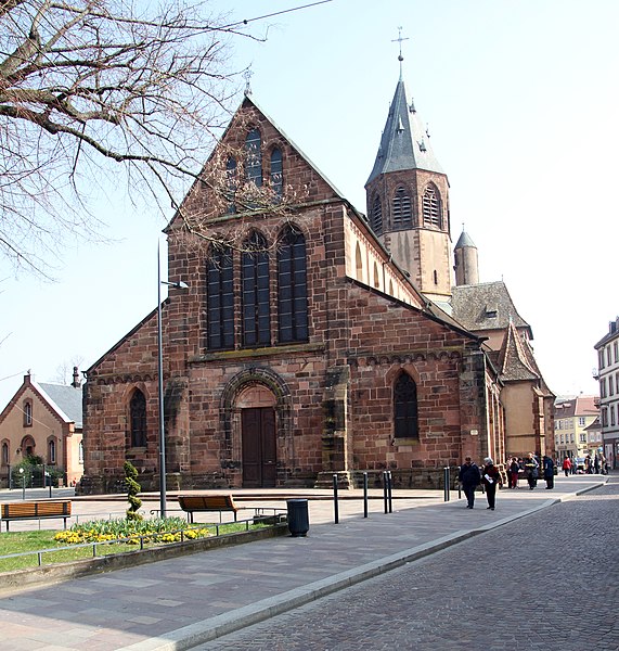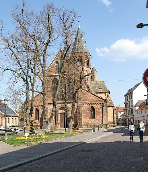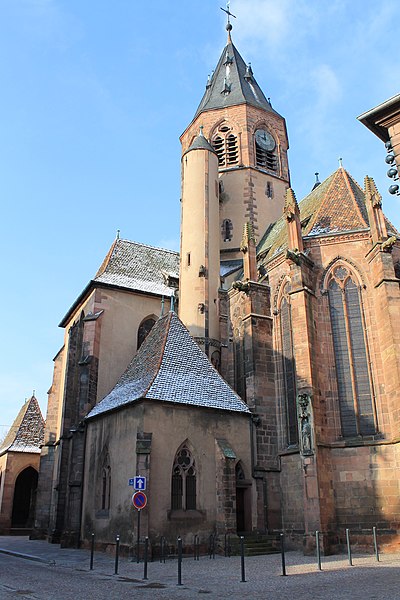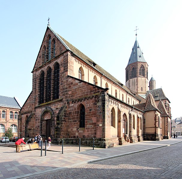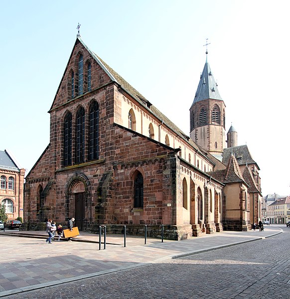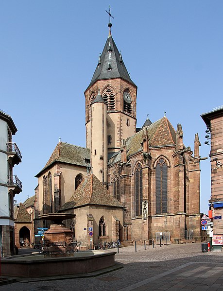 L'église Saint-Georges, située rue Saint-Georges à Haguenau (Bas-Rhin, Alsace), est classée monument historique depuis 1848 et figure parmi les principaux édifices religieux de la ville aux côtés de l'église Saint-Nicolas et de la basilique de Marienthal. La paroisse Saint-Georges est créée en 1143 et la première église romane, autorisée par l'évêque Frédéric le Borgne, est achevée et consacrée à la fin du XIIe siècle ; de cet édifice subsistent notamment deux tourelles d'escalier, la base de la tour, des vestiges de crypte, une abside semi‑circulaire et une partie du bas‑côté sud. Des vestiges de chapelles datées de 1170 et 1184 sont encore visibles dans le bas‑côté sud. Les constructions ont été réalisées en grès des Vosges du Nord et en briques crépies ; la façade occidentale, la partie supérieure de la tour de croisée et le chevet présentent un petit et moyen appareil en pierre de taille. La nef primitifement charpentée à trois vaisseaux est reconstruite vers 1200–1220 ; elle compte dix travées et, à l'extérieur, un soubassement mouluré qui épouse les contours des trois portails romans ainsi que des lésènes et frises de damiers et d'arceaux. Les fenêtres hautes romanes sont conservées dans les sept travées orientales ; à l'intérieur dix arcades en plein cintre, portées par des colonnes à chapiteaux cubiques, ouvrent sur les bas‑côtés. Les piles de l'arc triomphal sont sculptées d'atlantes et de monstres affrontés, seules sculptures conservées de la campagne du premier quart du XIIIe siècle. La charpente de la nef a été refaite en plusieurs campagnes datées par dendrochronologie en 1228, 1229 et 1258. Le transept et une tour clocher octogonale dotée de petites lucarnes sont ajoutés au début du XIIIe siècle ; l'ouverture de la croisée sur les bras s'effectue par une double arcade inspirée de la cathédrale de Strasbourg. Les voûtes d'ogives du transept sont parmi les plus anciennes de l'édifice, leurs clés étant sculptées d'une rose emblématique, de feuillages, d'une tête de feuilles et du Bon Pasteur. L'ancienne tour‑chœur romane est surhaussée et transformée en tour de croisée, achevée en 1268 ; son niveau supérieur est appareillé en grès et percé de grandes baies gothiques, et cinq cloches sont alors suspendues, dont deux datées de 1268 qui subsistent encore. Le chœur gothique et l'abside à pans coupés, réalisés par un atelier apparenté au chantier de la cathédrale de Strasbourg, sont achevés pour la consécration de 1283 ; à l'extérieur les fenêtres du chœur sont entourées de cordons sculptés de feuillages retombant sur têtes d'hommes et d'animaux, et des gargouilles et pinacles ornent les contreforts, qui abritaient des statues déposées en 1913 au musée historique de Haguenau. Le chœur est remanié vers 1360 ; la chapelle Saint‑Jacques est construite en 1496 et la chapelle Saint‑Jean par maître Stuckart en 1517–1519. En 1523, la tour eucharistique et la sacristie sud sont réalisées par Friedrich (Frédéric) Hammer. Le vaisseau central est voûté en 1609 et les voûtes occidentales des bas‑côtés sont reprises en 1611. Au cours du deuxième quart du XVIIIe siècle la sacristie nord est bâtie et l'église est remise « au goût du jour », et une sacristie réservée aux chanoines est ajoutée en 1738 après le transfert du chapitre de Surbourg à Haguenau en 1737. Une importante restauration au XIXe siècle introduit de nouvelles peintures murales, des vitraux et du mobilier néo‑gothique ; les statues des contreforts du chœur sont descendues en 1913 et certaines conservées au musée. L'édifice est gravement endommagé lors des bombardements de 1944–1945 ; la restauration menée entre 1958 et 1963 supprime l'essentiel du décor néo‑gothique et installe des verrières modernes, et la voûte réticulée actuelle remplace l'ancien plafond en bois. De nombreuses marques de tâcherons romanes et gothiques sont encore visibles. Parmi les éléments remarquables du mobilier, la custode (Sakramentshäuschen) de 1523, attribuée à Friedrich Hammer, est une pièce de pierre finement ciselée représentant le buisson ardent ; la chaire à prêcher illustre saint Georges terrassant le dragon, des chandeliers datent du XVIe siècle, un crucifix de 1488 subsiste et l'autel majeur en grès rose des Vosges est l'œuvre de Louis Rudloff réalisée lors de la reconstruction de 1963. Le grand orgue néo‑roman provient de la maison Walcker (buffet de 1867, menuiserie Klem). Le retable du Jugement dernier, dont les volets peints datent de 1496–1497 et sont attribués à Diebold Martin, se trouve dans le transept sud ; le transept nord abrite le retable du Saint‑Sacrement du XVe siècle. Les vitraux contemporains, au nombre de 61 et réalisés par Jacques Le Chevallier entre 1956 et 1969, composent des cycles représentant la Résurrection au centre, les grands prophètes et les évangélistes, les mystères du rosaire et des figures de saints patronaux, tandis que des verrières antérieures de 1845 figuraient des empereurs. Des dispositifs d'étalonnage médiévaux sont encore lisibles sur les contreforts du transept sud et les « griffes du diable » près du Chörel et de la chapelle Saint‑Jacques renvoient à des traditions locales liées à la protection de saint Georges. Sur les cinq cloches coulées à Haguenau en 1268 par Heinrich, deux médiévales subsistent et, traditionnellement, elles sonnent encore à 22 heures pour annoncer la fermeture des portes de la ville ; d'autres cloches ont été fondues aux époques révolutionnaire et pendant la Première Guerre mondiale et remplacées ultérieurement. En 2018 la municipalité et la paroisse ont décidé d'harmoniser le jeu campanaire : une cloche de 1923 a été refondue et trois nouvelles cloches accordées au Sol, au La et au Si ont été coulées en octobre 2018 par les entreprises Bodet et la