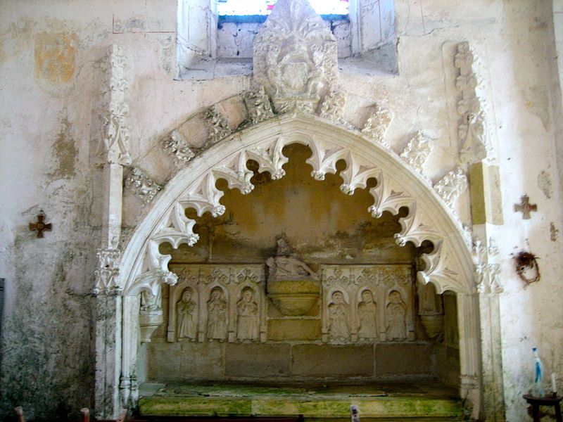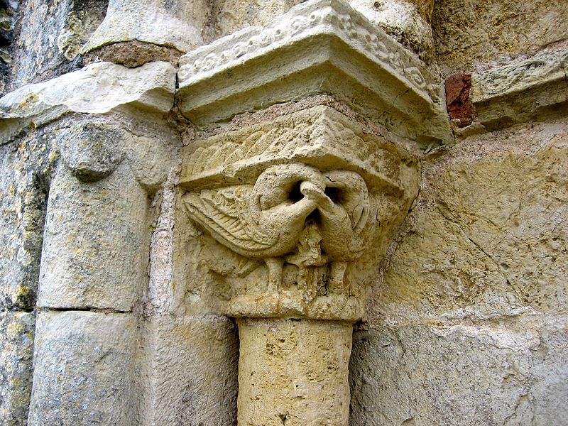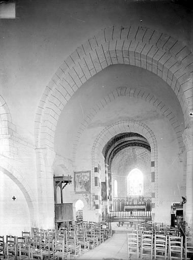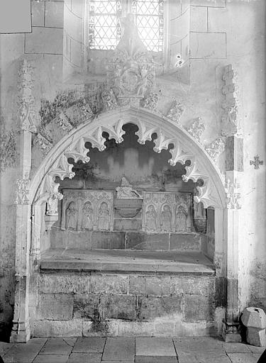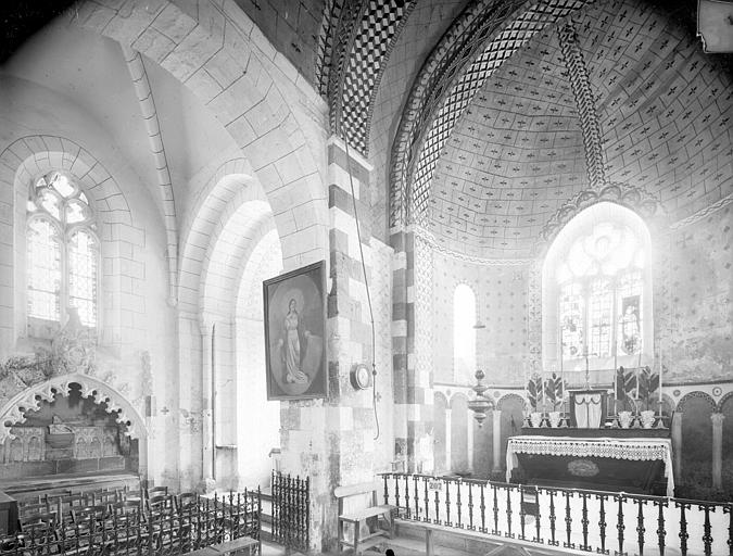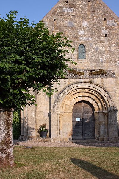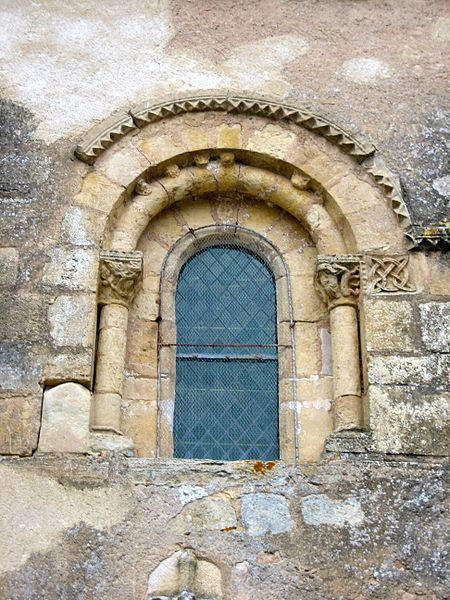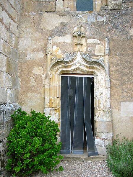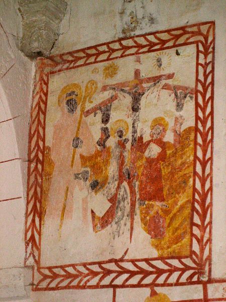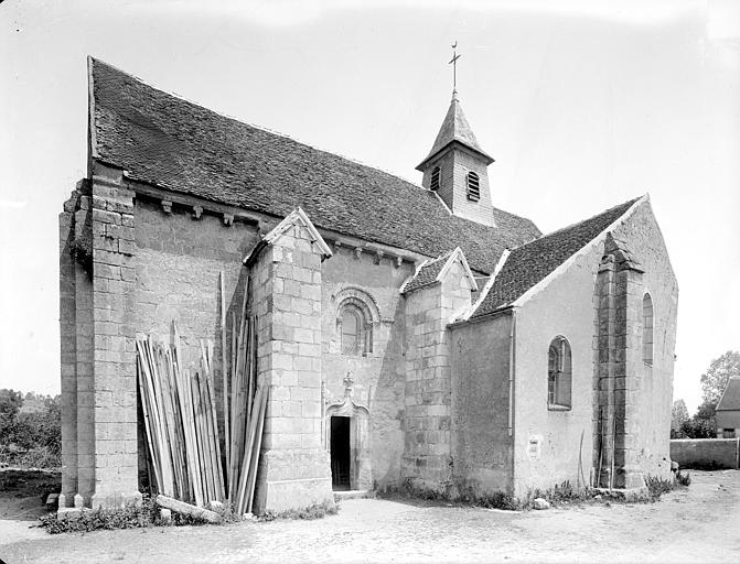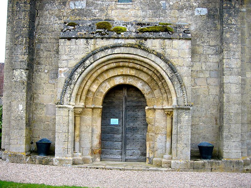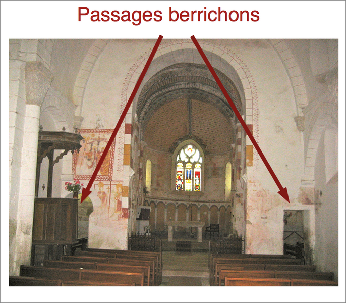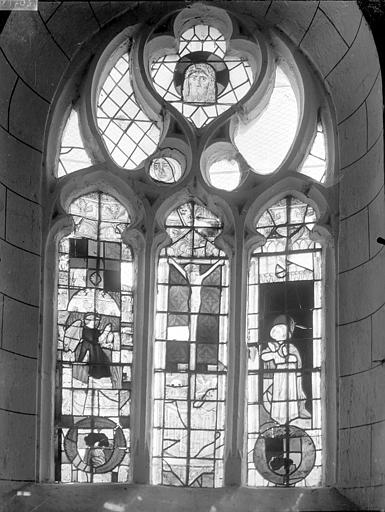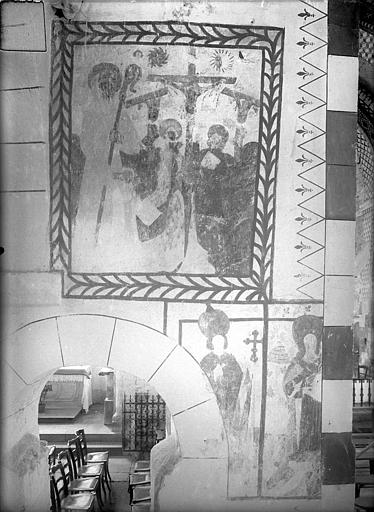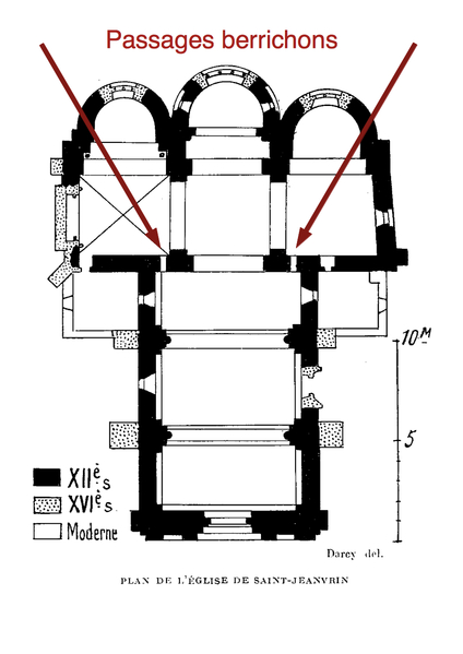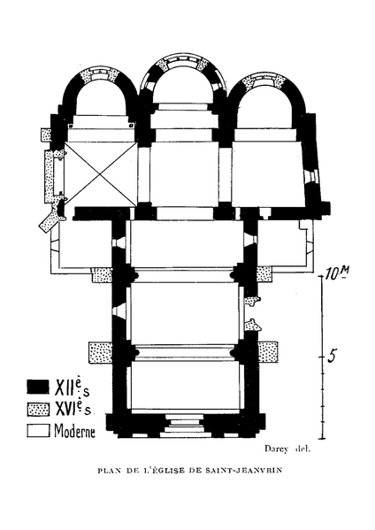 L'église Saint-Georges, anciennement dédiée à saint Janvier, se situe à Saint-Jeanvrin dans le sud du département du Cher. Elle se compose d'une nef de trois travées sans bas-côtés, d'un double transept avec croisée centrale soutenant le clocher, de deux absidioles et d'un sanctuaire en plan demi-circulaire précédé d'une courte travée droite formant le chœur. La nef est couverte d'un berceau ogival à doubleaux du même profil ; le reste de l'édifice présente des voûtes en berceau plein cintre, sauf le transept nord dont la voûte d'ogive en nervures a été refaite au XVe siècle, tandis que les absidioles et l'abside sont voûtées en cul-de-four. Daté globalement du XIIe siècle, l'édifice a subi des transformations au XVe siècle, notamment le renforcement des contreforts de la nef, l'agrandissement des fenêtres des absides, la réfection de la voûte du transept nord et l'établissement d'un tombeau dans le mur nord du transept. L'église dépendait de l'abbaye de Déols et figure dans la bulle du pape Pascal II de 1115 ; elle prit progressivement le vocable de saint Georges. Parmi les interventions postérieures, on relève la reprise des fenêtres de l'abside centrale et des absidioles, le voûtement de la chapelle nord et l'ouverture d'une porte dans le mur sud de la nef au dernier quart du XVe siècle par les seigneurs de Blanchefort. À la fin du XVIIIe siècle le clocher avait disparu et son emplacement était recouvert de tuiles ; il a été reconstruit vers 1852 et les toitures restaurées en 1905, sans correspondre au plan des toitures d'origine. L'édifice est classé au titre des monuments historiques par arrêté du 8 juillet 1911. La façade s'ouvre par un portail en plein cintre sans tympan, logé dans un avant-corps dont les voussures composées de trois rangs de claveaux et de deux gros boudins reposent sur des chapiteaux, dont l'un porte des oiseaux aux cous enlacés. La fenêtre centrale de l'abside, percée à la fin du XVe siècle, conserve un vitrail de la même époque représentant l'archange Gabriel et la Vierge Marie, et porte les armes de la maison de Blanchefort, seigneurs de Saint-Jeanvrin de 1485 à 1606 environ. Dans la nef subsistent une fenêtre de chaque côté ; une seconde fenêtre au sud a été bouchée lors de l'ajout de la sacristie. La fenêtre encore ouverte est soutenue par deux colonnettes aux chapiteaux sculptés de feuillage et de têtes, et sa voussure torique est encadrée, au-dessus, de petites têtes d'hommes ou d'animaux. La chapelle nord abrite un tombeau armorié des Blanchefort qui est sans doute celui de François de Blanchefort, chambellan du roi, mort en 1540 ; il aurait été édifié par son fils Gilbert de Blanchefort, seigneur de Saint-Jeanvrin et baron de Sainte-Sévère, époux de Marie de Créquy, mort en 1580, qui avait longtemps habité à Saint-Jeanvrin. Sur le mur nord-est séparant la nef du transept, une fresque représente une crucifixion : le Christ sur la croix est entouré des deux larrons, la Vierge est à gauche, saint Jean à droite, Marie-Madeleine est agenouillée au pied de la croix, et le soleil et la lune figurent au-dessus. Un grand personnage en habit épiscopal pose la main sur l'épaule d'un donateur agenouillé ; il pourrait s'agir de l'abbé Hubert de Prie, cousin des Blanchefort, et de son patron, l'évêque de Liège Hubert. Sous cette composition, dans un cartouche appartenant à une autre scène, figurent un homme et une femme nimbés tenant une croix. Le transept est relié à la nef par des arcades en plein cintre : le croisillon sud est voûté d'un berceau brisé, tandis que le croisillon nord reçut, au début du XVIe siècle, une voûte d'ogives à quatre branches moulurées reposant sur des culs-de-lampe ornés de masques. Les absidioles présentent des traitements distincts : celle du nord s'ouvre par un arc brisé et est précédée d'une partie droite à triple décrochement dont l'arcade repose sur deux colonnettes d'angle, tandis que celle du sud s'ouvre en plein cintre sans partie droite. Les deux absidioles et l'abside ont des fenêtres remaniées à l'époque flamboyante, reconnaissables à leur tracé en tiers-point et aux motifs de soufflets, mouchettes et quadrilobes sur compartiments tréflés visibles au chevet extérieur. L'élévation latérale sud est soutenue par des contreforts repris au XVIe siècle ; dans la seconde travée, une porte latérale du XVIe siècle en accolade, surmontée d'un chou et flanquée de deux pinacles, ouvre sur le mur sud.