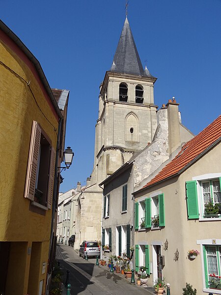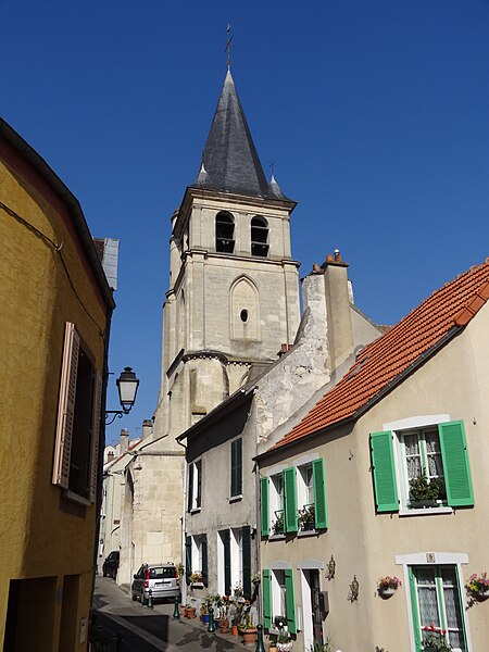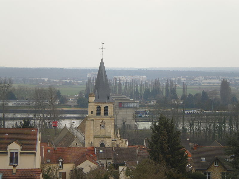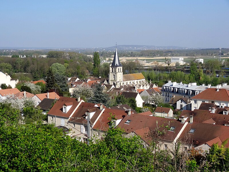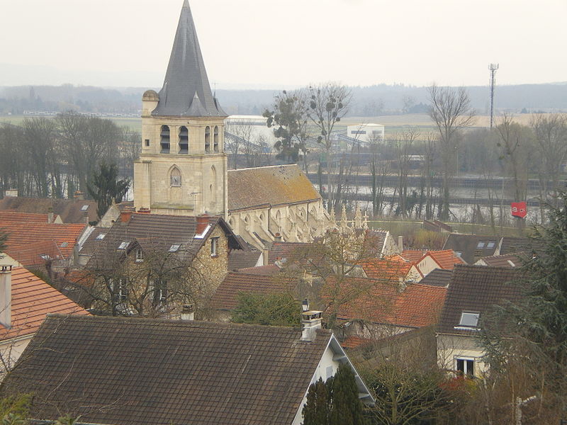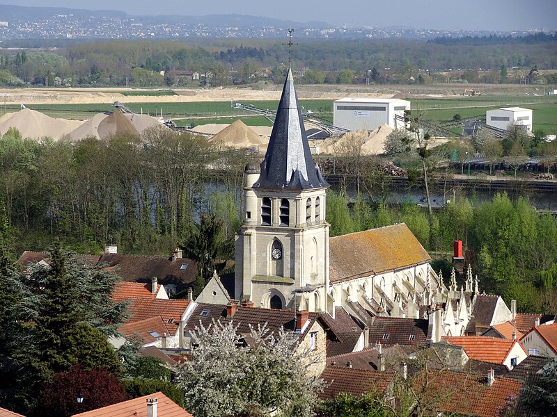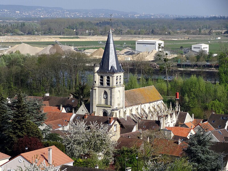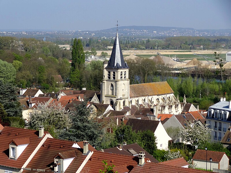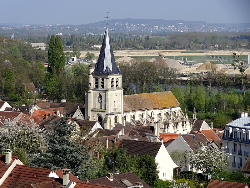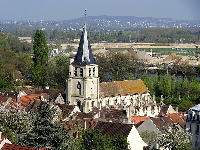 L'église Saint‑Germain d'Andrésy, dans les Yvelines, est une paroissiale dont le noyau gothique s'inscrit entre la fin du XIIe et le premier quart du XIIIe siècle. Bâtie en centre ville sur la rive droite de la Seine, elle s'implante perpendiculairement au quai ; son chevet plat donne sur le fleuve tandis que la façade principale se signale dans une rue trop étroite pour offrir un recul. L'édifice adopte un plan allongé à trois vaisseaux sans transept : une nef centrale voûtée d'ogives, un bas‑coté sud étroit et un collatéral nord de proportions beaucoup plus généreuses. Le collatéral sud est sensiblement plus étroit que le collatéral nord, qui atteint presque la largeur réunie de la nef et du bas‑côté sud mais n'en a qu'environ les deux tiers de la hauteur. L'élévation comporte trois niveaux du côté sud (grandes arcades, triforium, fenêtres hautes) et présente des variations de détail selon les travées. Les voûtes et les profils des nervures diffèrent d'un secteur à l'autre : ogives très archaïques à simples tores dans les travées occidentales du bas‑côté sud, profils à deux tores dans le chœur et la première travée de la nef, profils plus effilés dans le collatéral nord dont une partie a probablement été reprise au XIXe siècle. Le triforium et les ouvertures hautes témoignent d'irrégularités : le triforium du chœur montre des séries d'arcades inégales et certaines fenêtres hautes sont composées d'oculi dont l'authenticité est discutée. La large baie du chevet, aménagée au début du XIVe siècle, occupe presque toute la hauteur et la largeur du mur et remplace un dispositif antérieur. Trois grandes campagnes de construction médiévale se distinguent : les travées occidentales du bas‑côté sud et de la nef relèvent des phases les plus anciennes, le chœur appartient au premier quart du XIIIe siècle, et des percements ou adjonctions ultérieurs interviennent au XIVe siècle puis aux XVIe siècles. À partir de 1517 le bas‑côté sud oriental est rebâti et doté de quatre petites chapelles rectangulaires de style flamboyant, puis, vers 1538, un vaste collatéral nord est ajouté, entraînant la reprise en sous‑œuvre de l'élévation septentrionale. Le collatéral nord, qui conserve des baies en plein cintre avec remplage et des verrières en partie anciennes, présente des proportions robustes, des piliers monocylindriques appareillés et des chapiteaux d'inspiration corinthisante ainsi que des tailloirs et entablements rapportés. La portée importante et la faible élévation de ce collatéral expliquent en partie l'effondrement d'une voûte signalé en 1873 et la reconstruction de voûtes légères, conduite sous la direction de l'architecte Henry Barruel en accord avec l'architecte diocésain Blondel ; certaines voûtes ont été reconstruites selon le procédé Heurteaux et des tailloirs ont été retaillés. D'autres interventions ont été menées au XXe siècle et après‑guerre : chapelles nord‑ouest et sud‑ouest (1958), travaux sur le porche occidental, réouverture d'une baie murée du collatéral nord et démolition d'une maison mitoyenne en 1987. Le clocher présente une structure composite dont les éléments anciens remontent au début du XIIIe siècle tandis que le parement et l'étage de beffroi relèvent d'une mise en œuvre classique ; la cloche de 1605 figure parmi les éléments mobiliers remarqués. L'intérieur offre une grande diversité de sculptures : chapiteaux souvent imaginatifs, supports médiévaux conservés côté chœur, piliers ondulés et culots des phases flamboyantes, ainsi que des clés de voûte et motifs hagiographiques ou décoratifs variés. Le porche occidental, ajouté postérieurement, s'orne de clochetons flamboyants et d'une triple archivolte portée par colonnettes et chapiteaux ; il masque la façade qui conserve des impostes et des éléments de facture ancienne. Le mobilier comprend plusieurs tableaux et verrières protégés : des verrières du XVIe siècle (fragments vers 1520 et ensembles du milieu du XVIe siècle) ont été classées, de même que des vitraux et des panneaux restaurés aux XIXe et XXe siècles, tandis que d'autres verrières modernes datent de 1930, 1958 et des campagnes de 1968–1986. Plus généralement, l'édifice conserve des œuvres picturales classées ou inscrites, des plaques funéraires et un ensemble de vitraux et sculptures qui témoignent des différentes campagnes et restaurations. Inscrite à l'Inventaire en 1925 puis classée monument historique en 1949, l'église Saint‑Germain reste un lieu de culte actif au cœur de la paroisse.