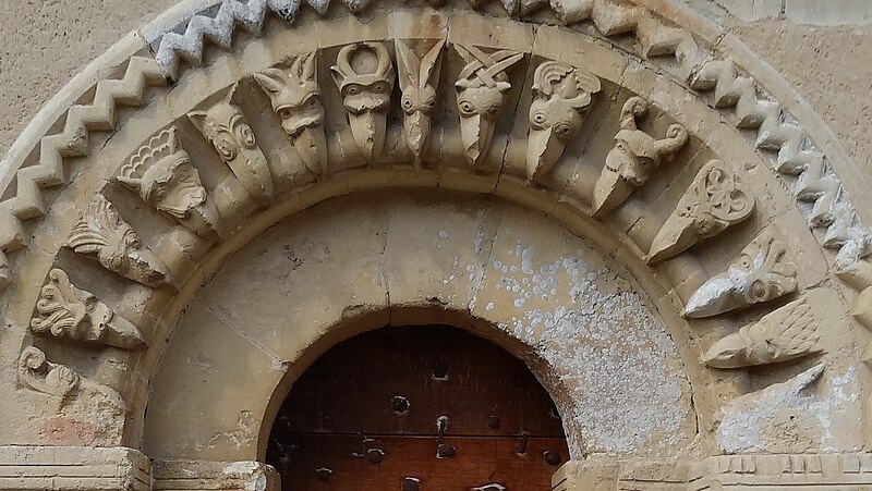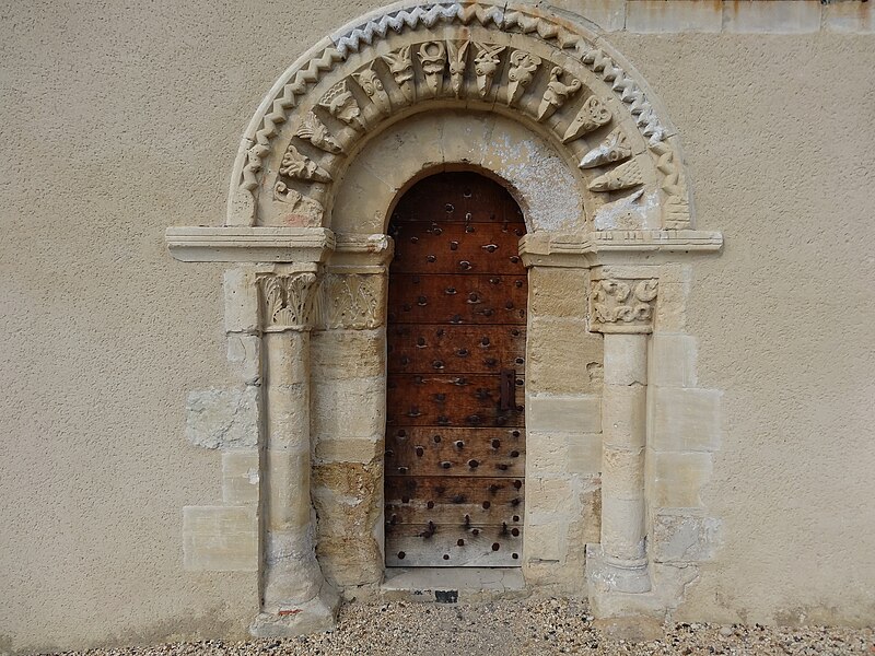 Le mur méridional de la nef, sans contreforts, présente un appareil en feuilles de fougère et s'ouvre sur une porte en plein cintre dont l'archivolte ornée de zigzags repose sur des colonnettes à chapiteaux sculptés, l'un d'entrelacs, l'autre de feuillage. La voussure est décorée de quinze têtes d'animaux fantastiques dont la langue s'enroule autour d'un tore de l'intrados; ce mur comporte aussi quatre fenêtres en plein cintre, dont trois sont modernes et la quatrième, datant de la première moitié du XVIe siècle, possède un chanfrein simple. Le mur septentrional, élevé au XVIe siècle, est flanqué de contreforts saillants et percé de trois baies, l'une flamboyante partagée par un meneau, une autre à arc surbaissé ornée de moulures prismatiques; on y observe les vestiges d'une litre funèbre.