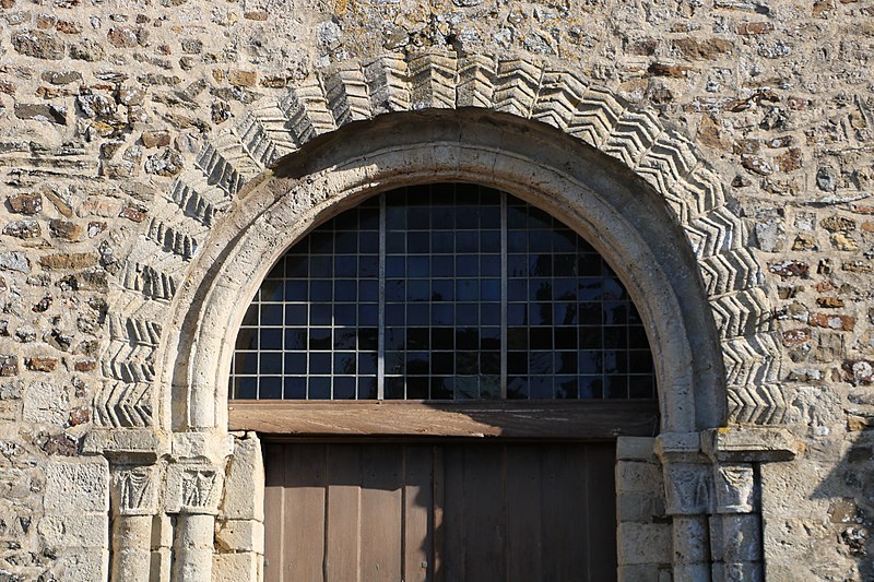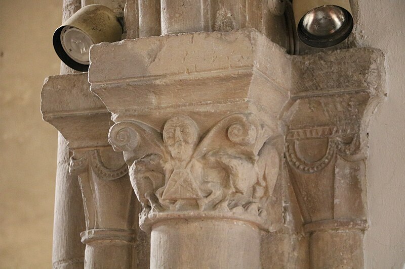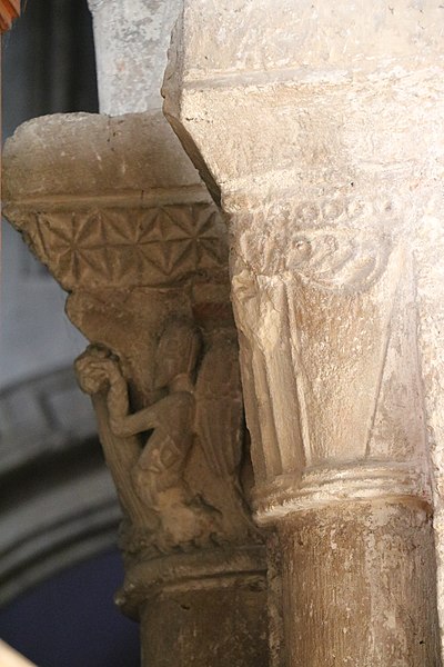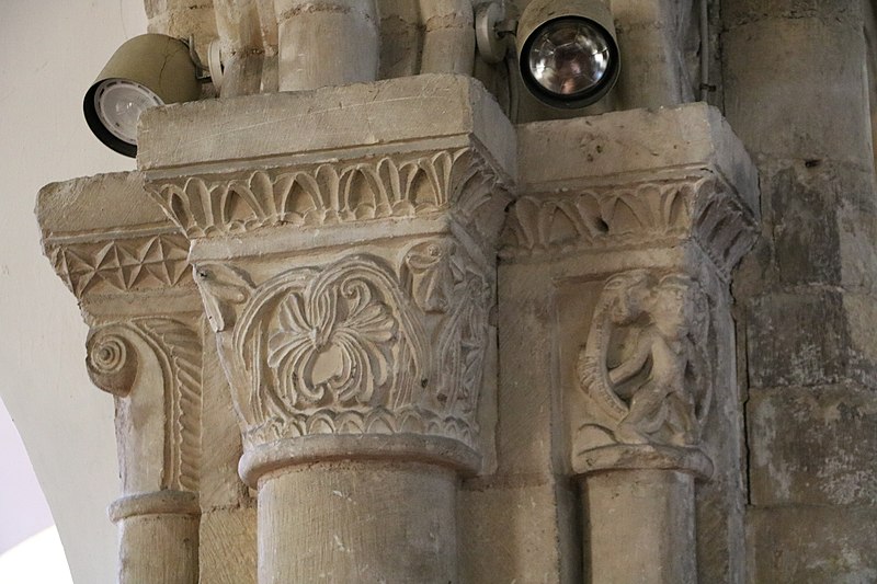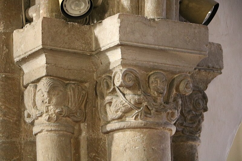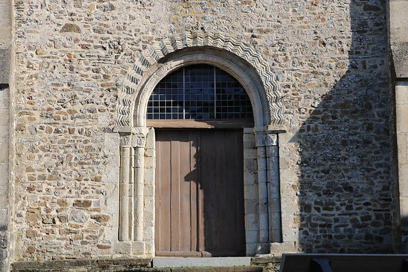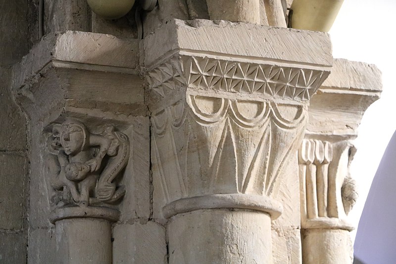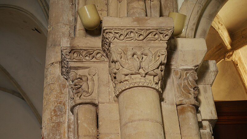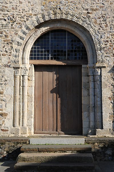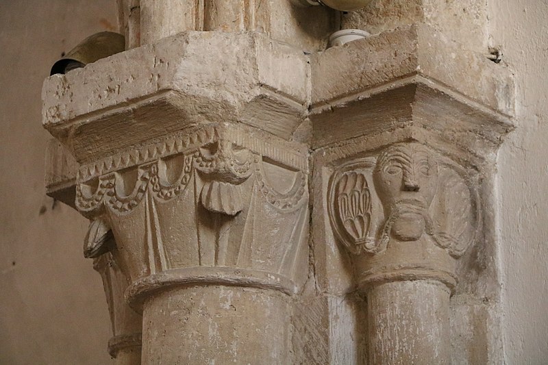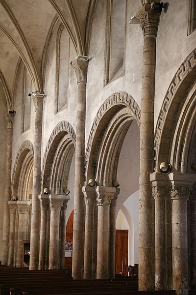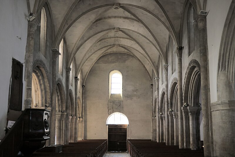 L'église, orientée est-ouest, présente un plan rectangulaire sans transept et deux élévations composées d'arcades et de fenêtres hautes. La nef romane, datée du deuxième quart du XIIe siècle et flanquée de collatéraux, comporte de grandes arcades moulurées et des chapiteaux historiés représentant notamment Daniel dans la fosse aux lions, le baptême du Christ, la punition de l'avare et une scène pouvant évoquer le meurtre d'Abel par Caïn ; on y observe aussi un bestiaire (lions, griffons, dragons, oiseaux, serpents) ainsi que des motifs végétaux et divers décors sculptés. La nef compte cinq travées — quatre de plan barlong et la cinquième, précédant le chœur, de plan carré — qui furent voûtées en croisées d'ogives en 1891, alors que la couverture primitive devait probablement être une charpente à plafond plat. Le porche occidental actuel, construit en 1891, est un pastiche du porche roman conservé dans le bas-côté nord ; le chœur a été refait au XIXe siècle.