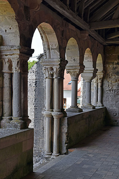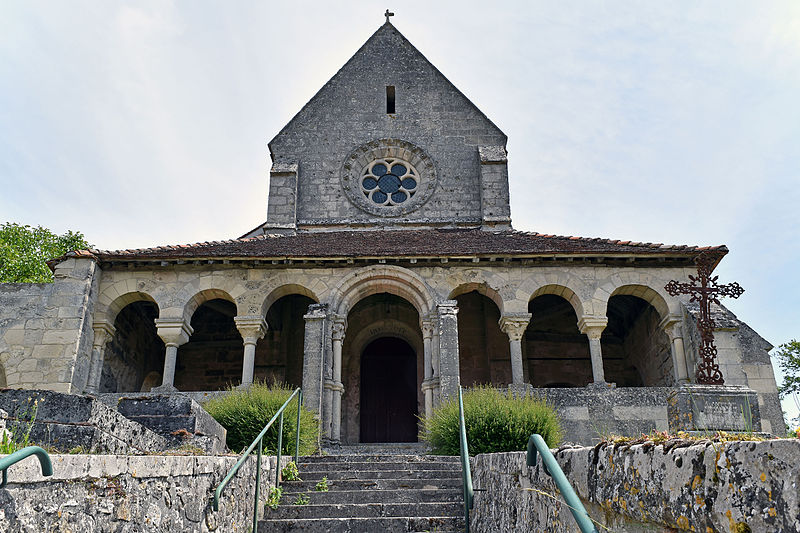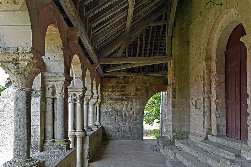 Le porche couvert, placé en avant de la façade au milieu du XIIe siècle, est un édicule indépendant à charpente, ouvert à l'ouest par six arcades à claveaux plats qui encadrent une porte en plein cintre garnie de deux boudins évidés et d'un rang de trous cubiques ; une colonnette centrale, flanquée de cinq fûts de colonnes retenus par des bagues de pierre à mi-hauteur, soutient l'ensemble, tandis que les graciles colonnettes aux bases aplaties portent de larges chapiteaux ornés de feuilles d'arum.