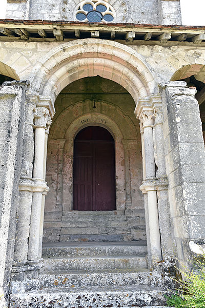 Le portail en plein cintre, contemporain de la nef, présente des claveaux plats soutenus par deux colonnettes et une guirlande de fruits d'arum enlacés par des tiges ; le pignon de la nef porte une rosace à six lobes du XIIIe siècle, entourée de fleurs à quatre pétales.