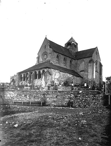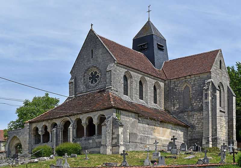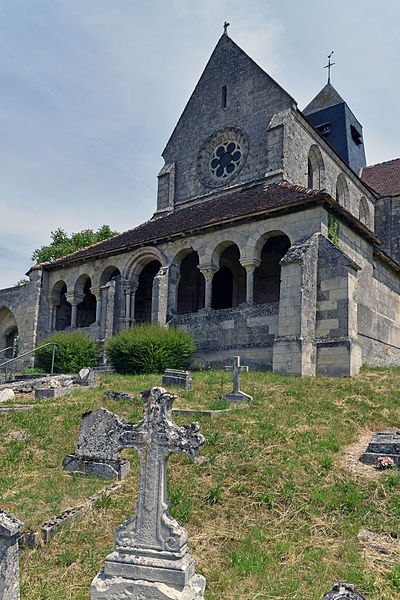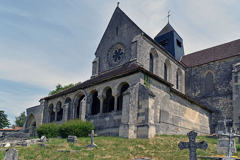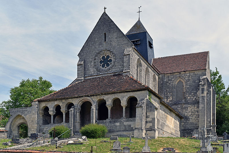 La nef, en trois travées, est datée par l'archéologue Lefèvre-Pontalis des environs de 1125 ; ses arcs en plein cintre retombent sur deux piles rectangulaires retaillées en octogone et ornées de figurines en faible relief comparées à des personnages de fibules mérovingiennes.
