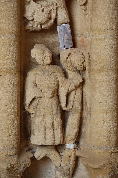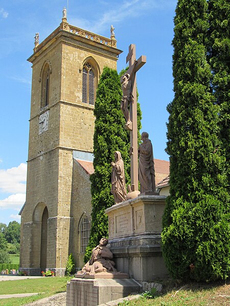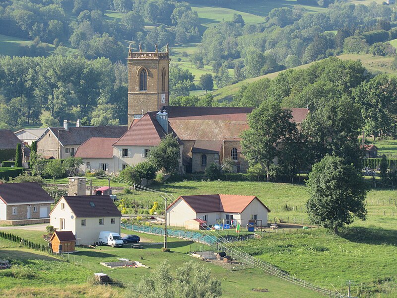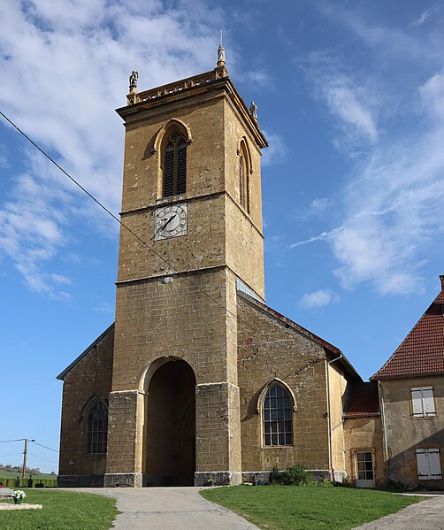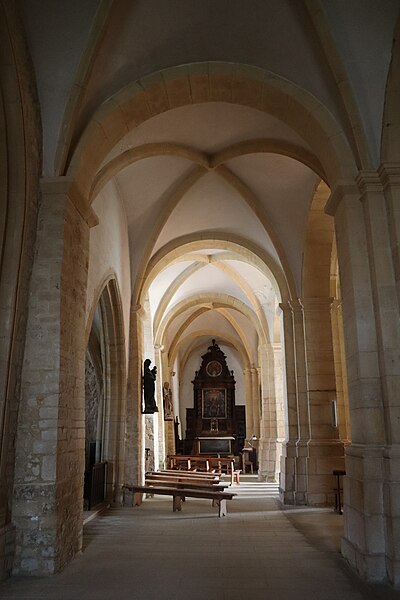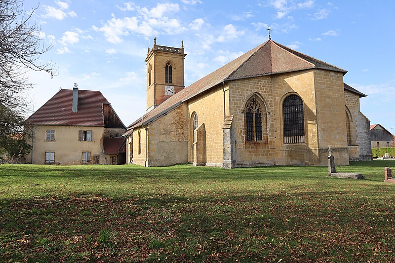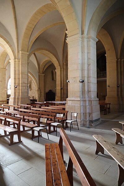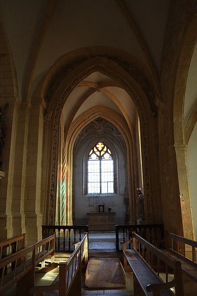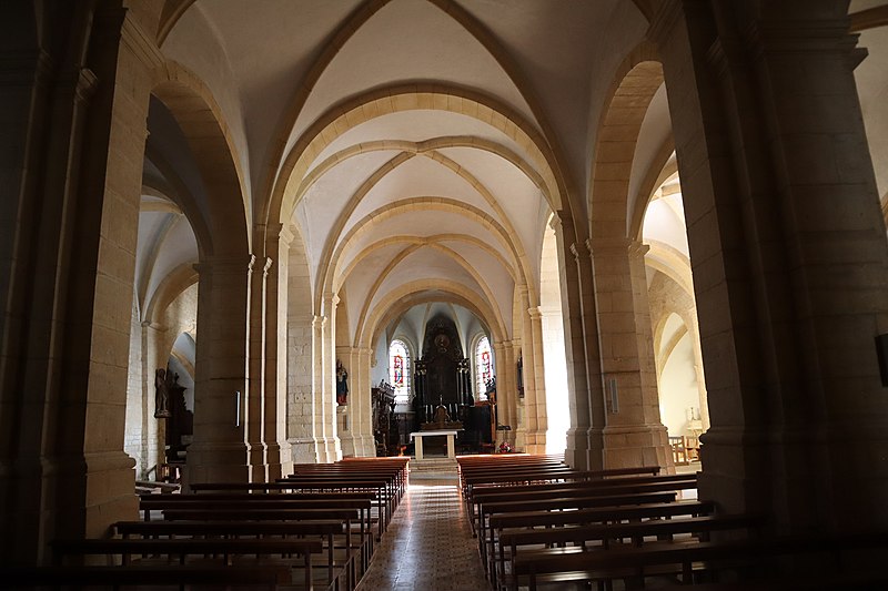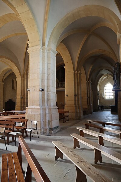 Un prieuré relevant de Cluny est cité en 1083. L'église aurait été reconstruite entre 1430 et 1460, ou vers 1500. La chapelle des Chalon et d'autres se sont greffées sur l'édifice. Ayant subi des destructions au cours des guerres, elle a été en grande partie reconstruite dès avant 1647 et jusqu'en 1665, en conservant les chapelles périphériques et le portail inclus dans le porche d'une tour de clocher. Un incendie en 1839 entraîna la réfection de la toiture et du sommet du clocher dans un style néogothique. Précédée d'un clocher‑porche flanqué de deux chapelles, l'église présente une nef à collatéraux bordée de chapelles latérales, un chœur d'une travée et une abside à pans accompagnés de deux chapelles. L'ensemble est voûté d'ogives ; des piliers et des pilastres toscans portent les arcs de la nef, tandis que les anciennes chapelles offrent des variantes de voûtement et de supports.