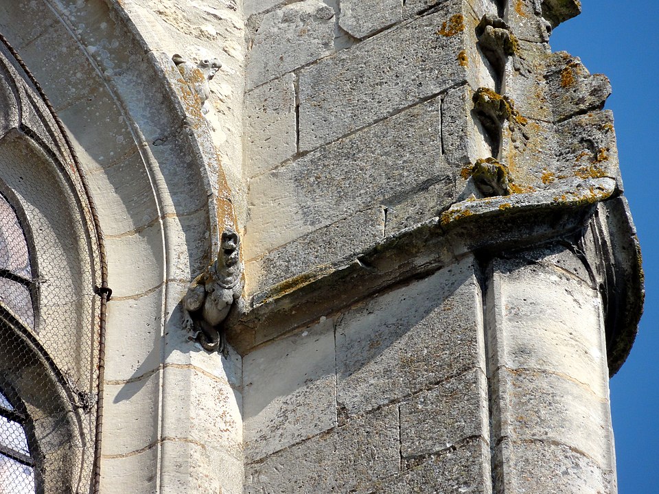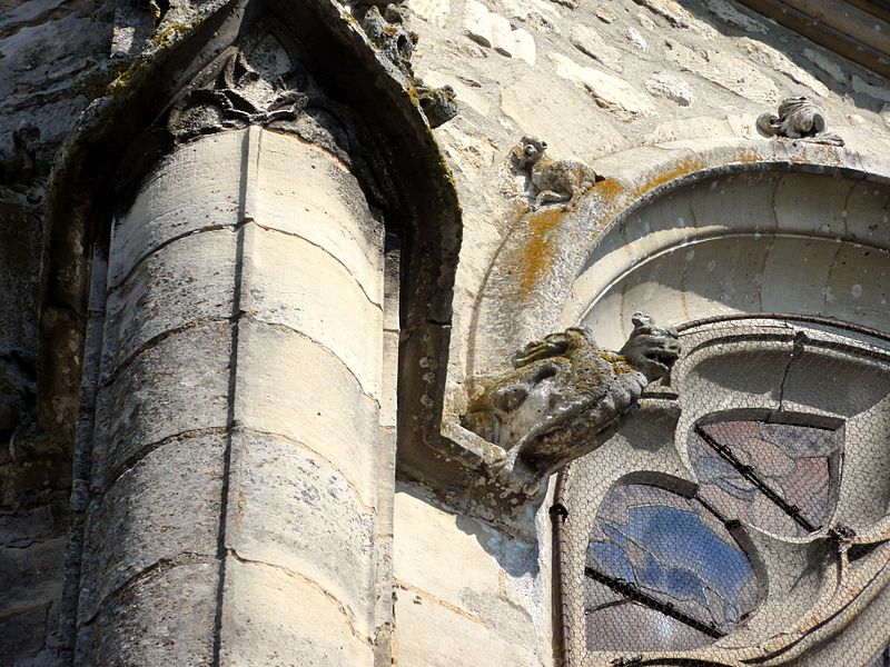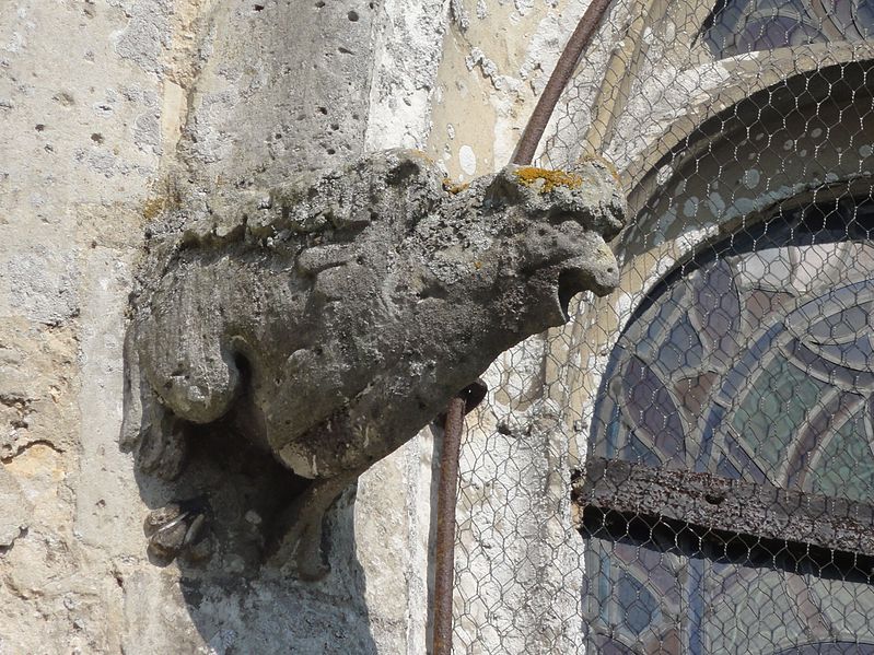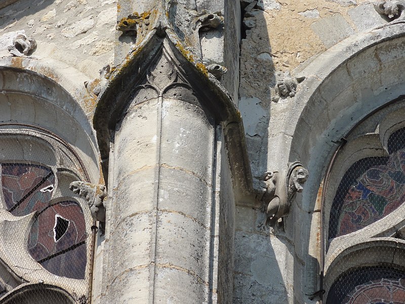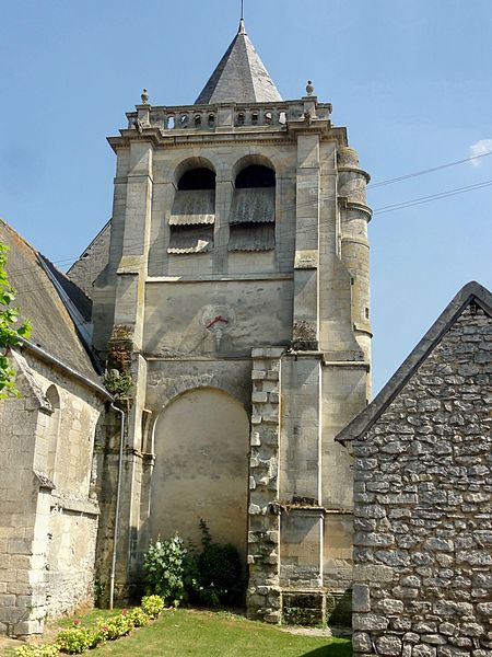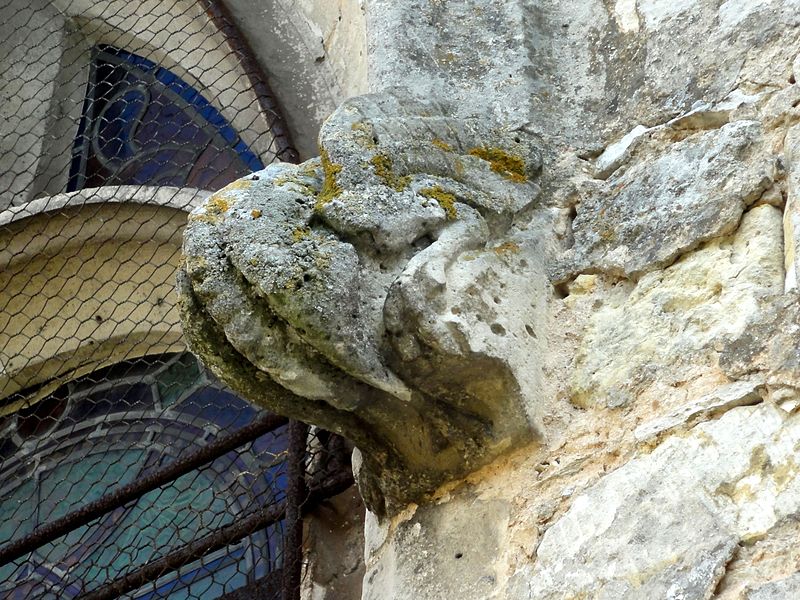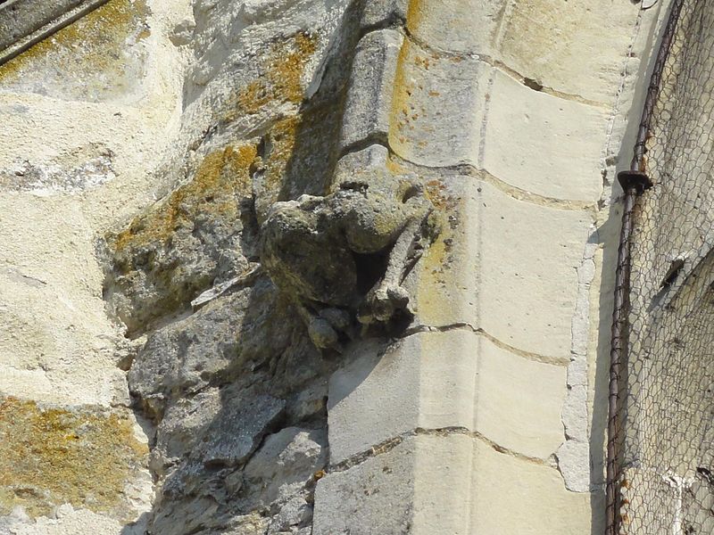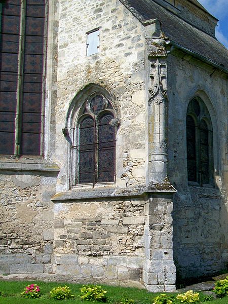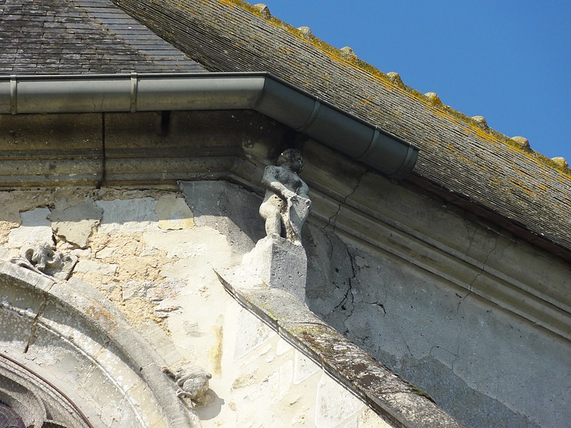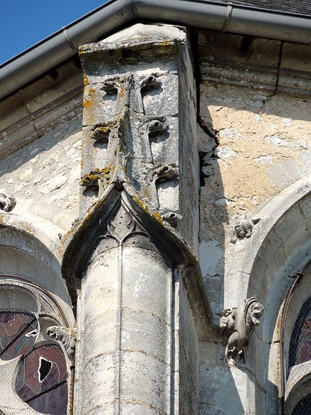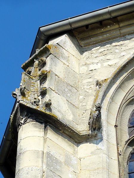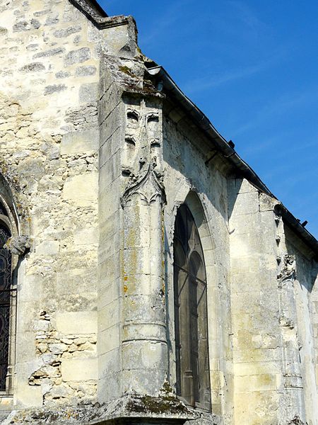 À l'extérieur, le chevet et les contreforts présentent une ornementation flamboyante faite d'arcatures, d'accolades garnies de crochets, de chimères et d'animaux fantastiques, tandis que l'appareil des murs reste inégal. Le clocher, élevé en moellons et pierres de taille, présente un étage de beffroi ajouré de baies en plein cintre, une corniche à denticules, des gargouilles sculptées et une flèche octogonale en charpente couverte d'ardoise.
