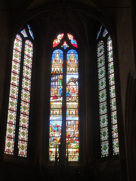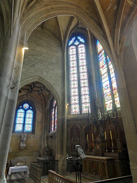 Le chœur, plus élevé et plus travaillé, adopte un rythme de travées alternant une travée profonde et des travées courtes afin d'éviter la monotonie ; ses nervures prismatiques et ses piliers ondulés participent à une composition recherchée, même si certains détails présentent des maladresses d'exécution. Les fenêtres du chevet associent arc brisé et formes en plein cintre dans le remplage, contraste qui peut traduire une interruption du chantier ou des influences stylistiques multiples.