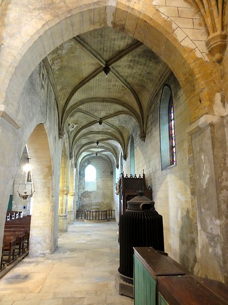 L'église n'est pas strictement orientée et présente un plan dissymétrique composé d'une nef de quatre travées avec un unique bas-côté au nord, d'un chœur de trois travées terminé par un chevet à trois pans, ainsi que de collatéraux clos en chevet plat. La première travée du chœur correspond à l'ancienne croisée du transept et a une hauteur comparable à celle de la nef, tandis que les deux travées orientales et l'abside dépassent nettement en hauteur. La nef est couverte d'une fausse voûte en berceau brisé, le bas-côté d'ogives aplaties et les parties orientales d'ogives véritables ; certaines voûtes comportent des liernes et tiercerons qui enrichissent le dessin des voûtes.