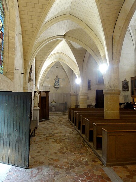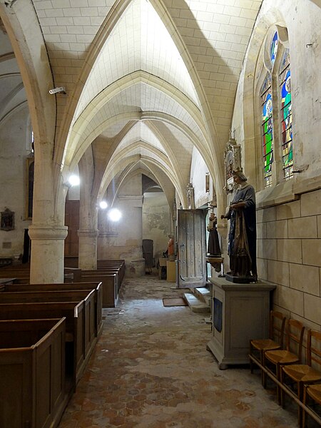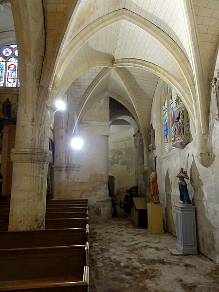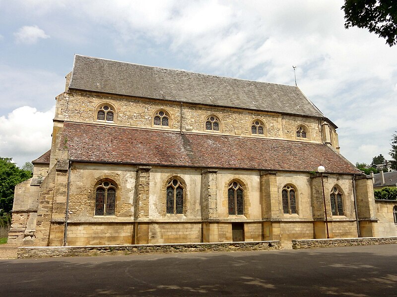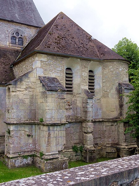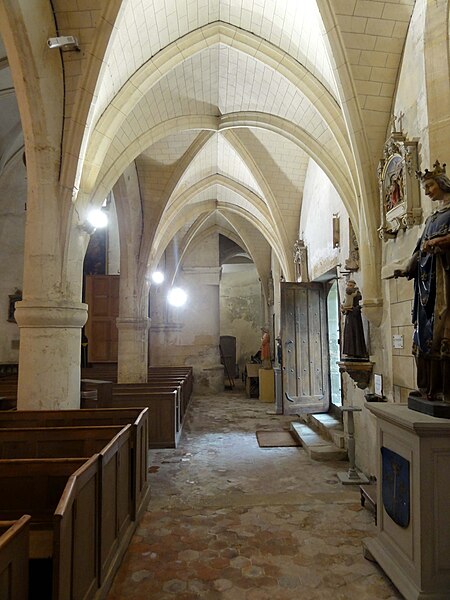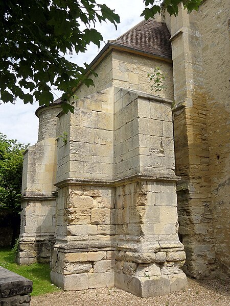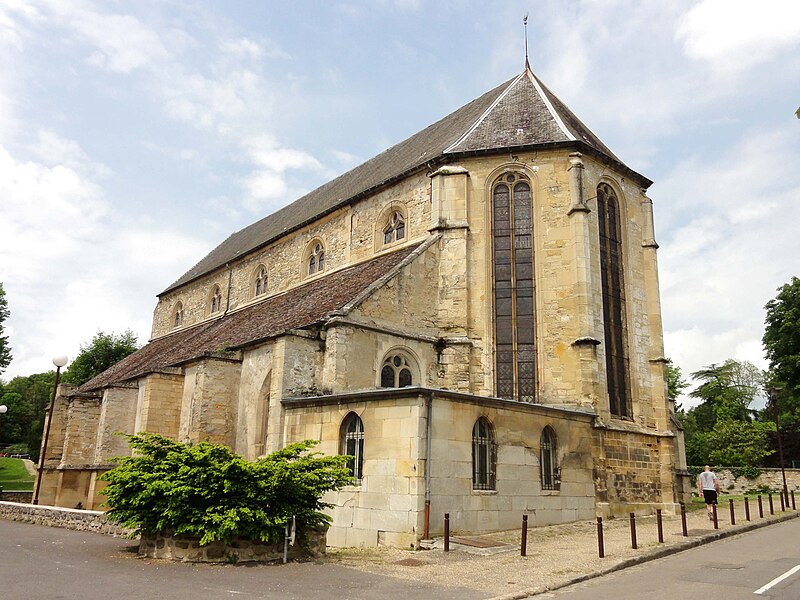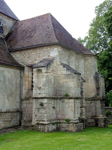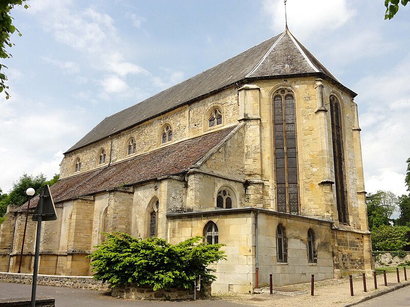 L'église Saint-Germain de Mézy-sur-Seine est bâtie sur l'emplacement d'un premier édifice du XIe siècle et la paroisse est mentionnée dans les sources en 1190. Elle a fait l'objet de plusieurs campagnes de construction : les parties basses du clocher datent du XIIIe siècle et l'édifice a pris sa forme actuelle au milieu du XVIe siècle, comme l'atteste l'inscription de consécration de 1554. L'abbé Richard Gatel puis Nicolas de Pardieu, seigneur de Mézy, ont entrepris la reconstruction du chœur et du chevet. Incendiée et partiellement détruite pendant la guerre de Cent Ans, l'église a été presque entièrement rebâtie à partir des années 1540 dans un gothique flamboyant rustique où les influences de la Renaissance se limitent à la modénature du chœur et au remplage de certaines fenêtres. L'ensemble est construit en pierre et moellons calcaires et couvert en ardoise. Le plan associe un vaisseau central élancé, un chevet polygonal à trois pans et deux bas-côtés qui butent contre deux chapelles latérales à chevet plat ; une sacristie a été ajoutée entre l'abside et le bas-côté sud. Les voûtes sont majoritairement d'ogives dont les nervures retombent sur les piles des grands arcs et sur des colonnes engagées à l'entrée de l'abside. L'ordonnancement des élévations latérales, avec un étage de fenêtres hautes, conserve probablement des dispositions héritées de l'édifice antérieur, et les grandes arcades semblent correspondre à des arcades du début du XIIIe siècle retaillées. L'intérieur se distingue par la belle ampleur du vaisseau central, dont la hauteur atteint environ le double de la largeur, et par des fenêtres hautes relativement petites inscrites dans les lunettes des voûtes. De nombreux éléments restent sobres : piliers monocylindriques, profils simples des grandes arcades et absence de sculpture attendue. Le chœur, voûté dès l'origine, présente des grandes arcades à modénature plus travaillée ; l'arc-doubleau retombe sur un faisceau de trois colonnes et l'abside à trois pans adopte un remplage de type Renaissance à deux formes en plein cintre surmontées d'un oculus. La voûte de l'abside apparaît toutefois trop surbaissée et en décalage avec les autres parties. Les bas-côtés, d'une largeur traditionnelle, conservent des voûtes d'origine dans leurs travées orientales ; les travées antérieures reçoivent des voûtes légères remontant aux années 1870, travaux menés à l'initiative du curé de l'époque, qui ont aussi entraîné des remaniements de fenêtres et la pose de vitraux. L'église n'a jamais été entièrement achevée : le clocher n'a pas été élevé au‑delà de sa souche mais abrite un beffroi en charpente et une cloche, et le portail occidental reste dépourvu d'ornementation. À l'extérieur, l'édifice est en grande partie en moellons, la pierre de taille étant employée pour les contreforts, chaînages, pourtours de baies et corniches ; la pierre tendre a provoqué des phénomènes d'érosion, notamment au clocher. Les contreforts présentent des dispositions variées — polygonaux aux angles de l'abside, larges et plats à l'intersection abside/nef, absents sur les murs gouttereaux du vaisseau central — et une corniche moulurée du XVIe siècle subsiste sur le chœur et le bas-côté nord. Parmi les trois portails, seul celui du nord est décoré mais inachevé ; la souche du clocher se signale par des contreforts massifs et une niche à statue fruste. L'église, implantée perpendiculairement à la rue du Château avec son chevet donnant sur la voie, est dégagée de constructions mitoyennes ; l'ancien cimetière et le portail principal se trouvent au nord, un terrain municipal et un parking avec portail secondaire se situent au sud. Inscrite au titre des monuments historiques par arrêté du 19 juillet 1926, l'église dépend aujourd'hui de la paroisse de Meulan et accueille des messes dominicales un dimanche sur cinq à 9 h. Le mobilier comprend trois éléments classés au titre des objets : une statuette de la Vierge à l'Enfant du XVIIe siècle et quelques ornements liturgiques du XIXe siècle en tapisserie à point, conservés en mairie, ainsi que la plaque commémorative de la consécration de 1554 scellée au début de la nef ; l'inscription gravée en caractères gothiques et rehaussée de barbotine rouge rappelle la date, la dédicace par Étienne Paris, évêque suffragant, et les indulgences promises aux fidèles.
