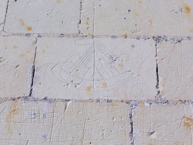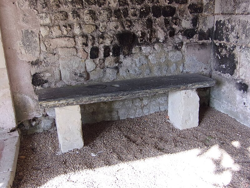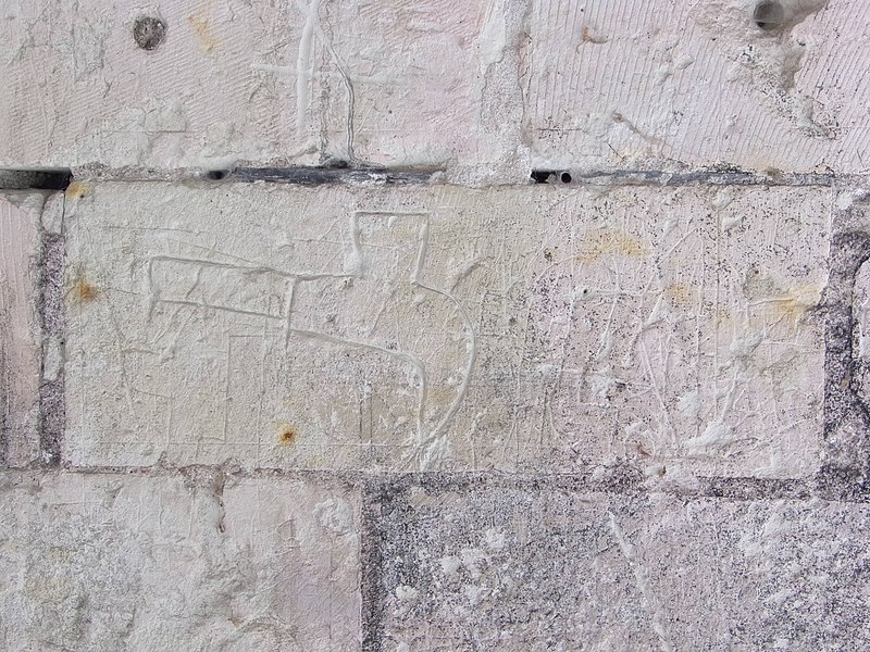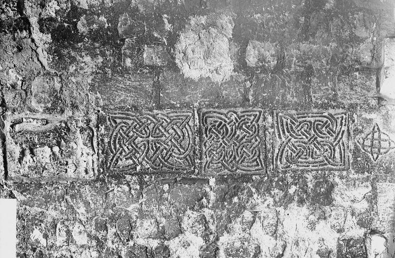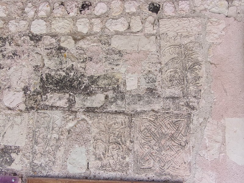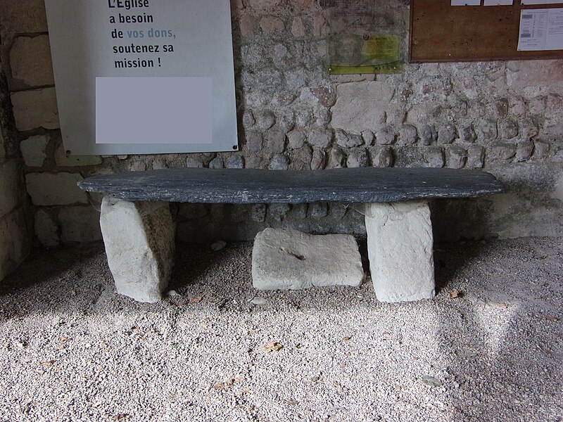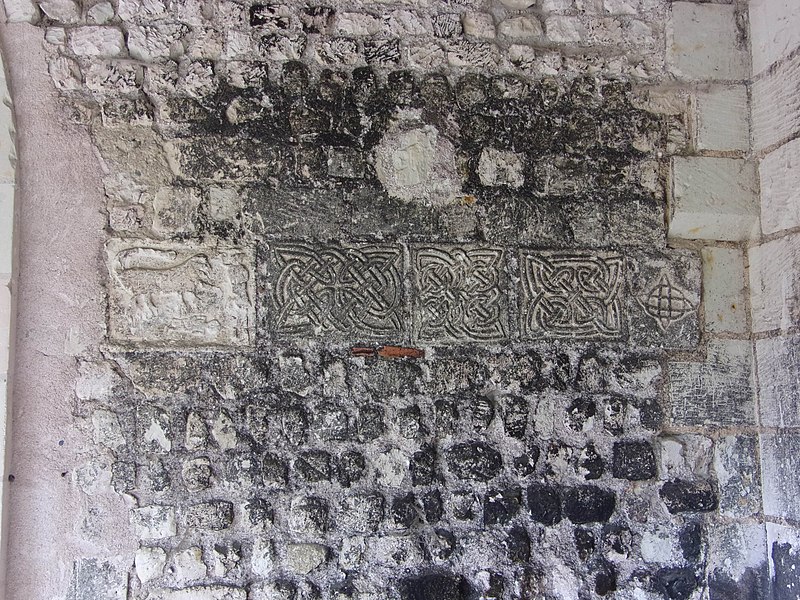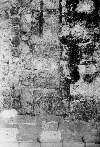 Les blocs remployés encadrant l'entrée sont gravés d'entrelacs, de palmes et d'un lion, éléments qui correspondent probablement à des métopes de corniche ou à des décors de façade. Le mur nord de la nef porte de nombreux graffiti, certains représentant des bateaux et d'autres des outils de vignerons. De part et d'autre du portail, deux pierres d'attente des morts — dalles d'ardoise reposant sur des supports en pierre — témoignent d'un usage liturgique lié à la bénédiction des cercueils avant les offices. Enfin, deux retables, deux tableaux d'autel et deux statues sont protégés en tant qu'objets au titre des monuments historiques.