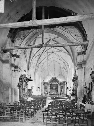 Les deux travées orientales de la nef sont voûtées et conduisent à un chœur sans transept, de même largeur que la nef, terminé par un chevet plat percé de deux baies en plein cintre. Le clocher, adossé à la seconde travée au nord, est de plan carré ; son beffroi est percé d'ouvertures sur les quatre faces et il s'élève en une flèche en pierre.