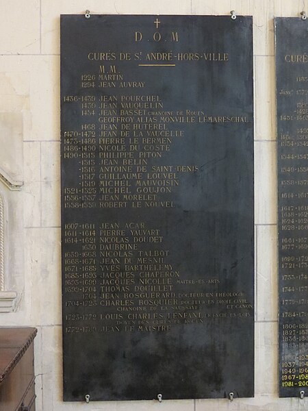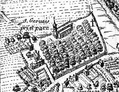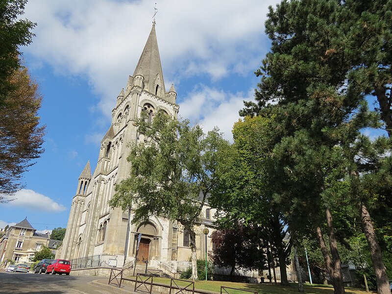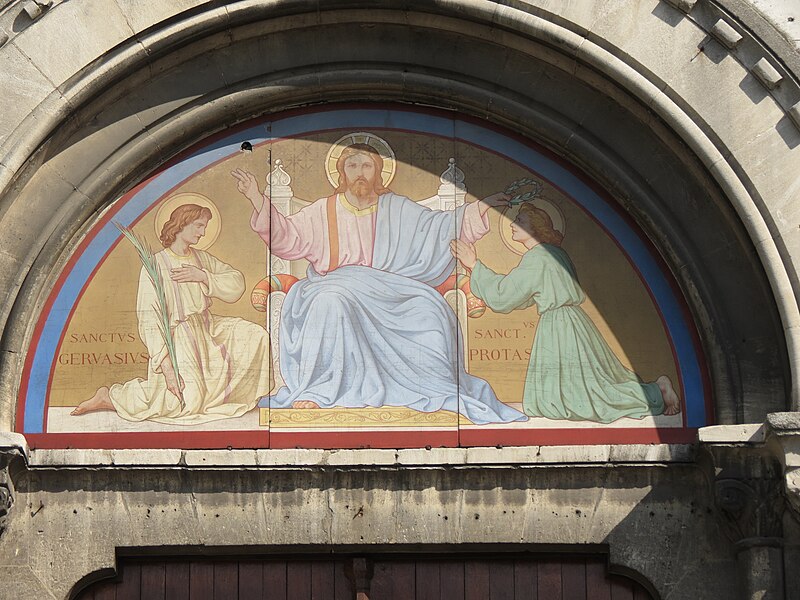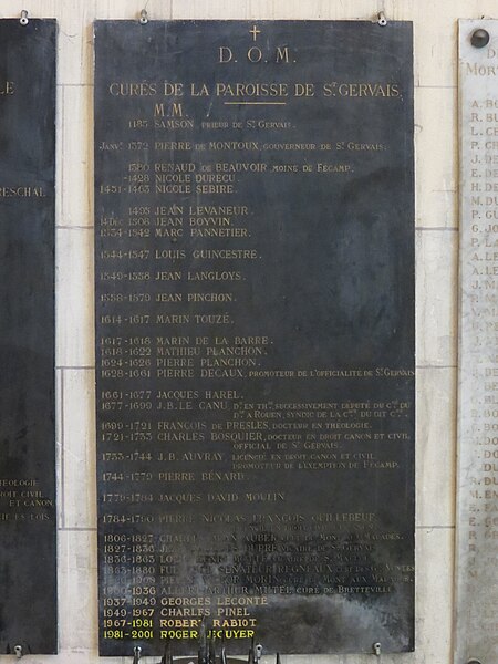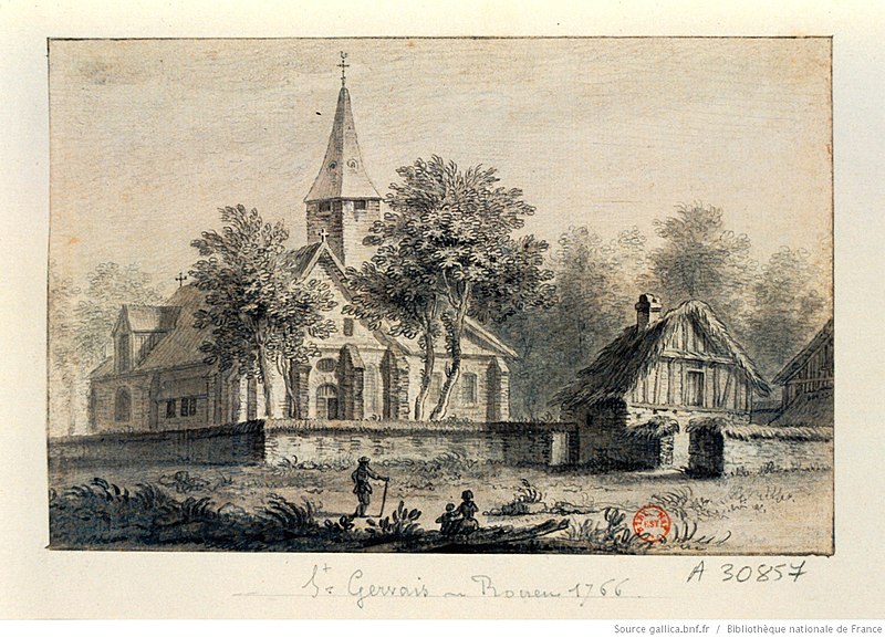 L’église Saint-Gervais de Rouen se situe place Saint-Gervais et rue Claude-Groulard ; l’édifice actuel date du XIXe siècle, avec des travaux signalés entre 1868 et 1874 sous la direction de l’architecte Martin Pierre, une reconstruction en 1868–1869 étant aussi attribuée à Martin et Marical. Sous le chœur subsiste une crypte rectangulaire antérieure à l’an mil, traditionnellement considérée comme la sépulture des premiers évêques ; un grand cimetière antique et paléochrétien s’étendait jusqu’à la rue du Renard, ancienne voie romaine, et de nombreux sarcophages y ont été retrouvés, dont deux sont exposés dans l’église. La crypte fait l’objet d’un classement au titre des monuments historiques par la liste de 1840. L’édifice primitif fut donné par Richard II de Normandie à l’abbaye de Fécamp en 1020 ou 1026 puis transformé en prieuré en 1066. Le prieuré servit de résidence ducale : Guillaume le Conquérant y passa les derniers jours de sa vie et y mourut le 9 septembre 1087. Saint Thomas de Canterbury y séjourna lors d’une maladie, et le lieu reçut également les visites des rois Henri II d’Angleterre et Louis VII de France. Le prieuré subsista jusqu’au XVe siècle ; l’église fut démolie en 1418 avant le siège des Anglais pour empêcher qu’elle serve de refuge, puis rebâtie en 1434. L’édifice subit des mutilations pendant les troubles civils et religieux de 1560 et 1562 ainsi que lors du siège de Rouen par Henri IV en 1591 ; il fut restauré ou partiellement reconstruit en 1595 par François Lachausse. Le clocher, détruit en 1606, fut reconstruit en 1673 puis détruit à nouveau en 1683. À la Révolution, l’église fut conservée comme succursale en 1791, fermée en 1793, rouverte en 1806 et rétablie comme église paroissiale en 1846. Charles Marie Bouton réalisa un dessin de la crypte en 1823. L’édifice comprenait initialement une nef et un collatéral au sud ; un nouveau collatéral nord fut construit en 1838 par Laquerriere et le collatéral sud agrandi en 1846 par Cheruel. L’église fut finalement détruite, à l’exception de la crypte, puis reconstruite à la fin du XIXe siècle. La fresque du chœur est due au peintre Savinien Petit : un panneau central décoré d’une croix est entouré de six panneaux représentant saint Thomas Becket, saint Mellon, saint Gervais, saint Protais, saint Victrice et saint André. Le 12 mars 1876, l’édifice fut endommagé par un ouragan. L’église possède un orgue construit par Cavaillé-Coll en 1889, dont Pierre Labric a été le titulaire.