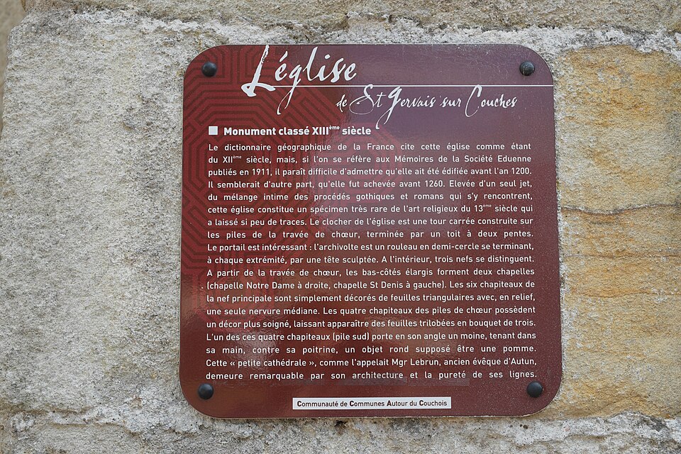 L'église Saint-Gervais de Saint-Gervais-sur-Couches, située en Saône-et-Loire (Bourgogne-Franche-Comté), est un édifice de style gothique primitif édifié entre 1200 et 1260. Classée au titre des monuments historiques par un arrêté du 30 août 1911, elle conserve une architecture et un mobilier remarquables. L'édifice comprend une nef de quatre travées flanquée de collatéraux étroits, un transept et une travée de chœur à chevet plat. Sa silhouette trapue associe granit et calcaire et s'affirme par d'imposants contreforts. Le clocher, à deux niveaux et éclairé de baies géminées, est couvert d'un toit en bâtière et abrite deux cloches fondues en 1824. Sur la façade nord, une pierre est sculptée d'un visage énigmatique. Au sud, une croix et une pierre tombale reposant sur des pattes de lion rappellent l'ancien cimetière ; au nord, une croix commémorative ceinturée de chaînes porte le nom d'Anne Monnot et a été érigée le 30 décembre 1857. Au fond du chœur, au‑dessus de l'ancien autel, se trouve un retable peint sur panneau de bois daté du XVe siècle, classé parmi les objets des monuments historiques en 1914, encadré par les statues de saint Gervais (à gauche) et de saint Protais (à droite) placées dans des niches à coquille. L'édifice, consacré, dépend du diocèse d'Autun et relève de la paroisse Notre‑Dame‑de‑la‑Drée, siégeant à Épinac, qui en est affectataire au titre de la loi de 1905 ; il demeure, huit siècles après sa construction, un lieu de culte catholique. Parmi les études consacrées à la commune figure l'ouvrage de Louis Ligeron, Saint‑Gervais‑sur‑Couches jusqu'en 1789, éditions Les Amis de l'église de Saint‑Gervais, 2011 (ISBN 978-2-7466-4-073-3).