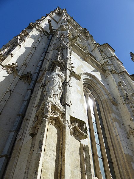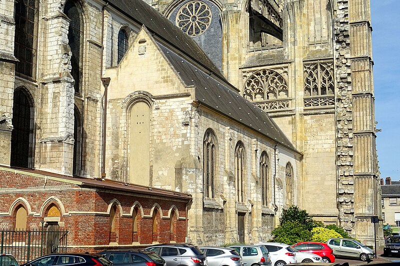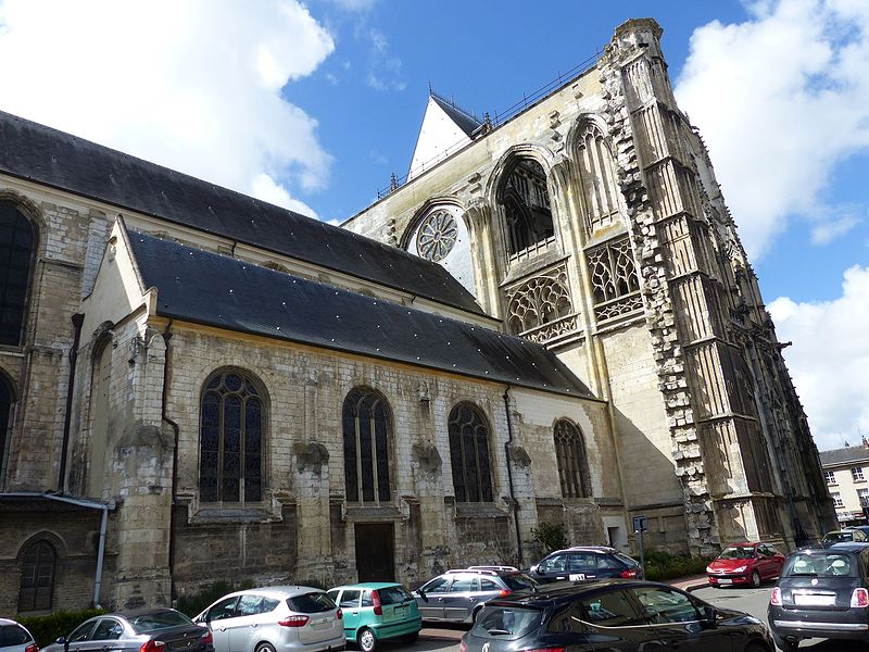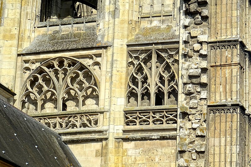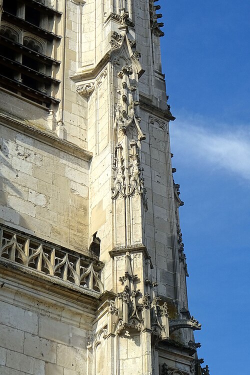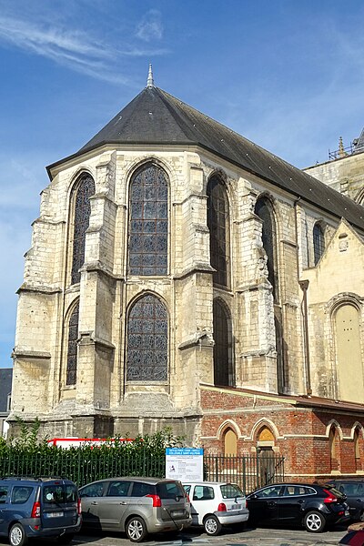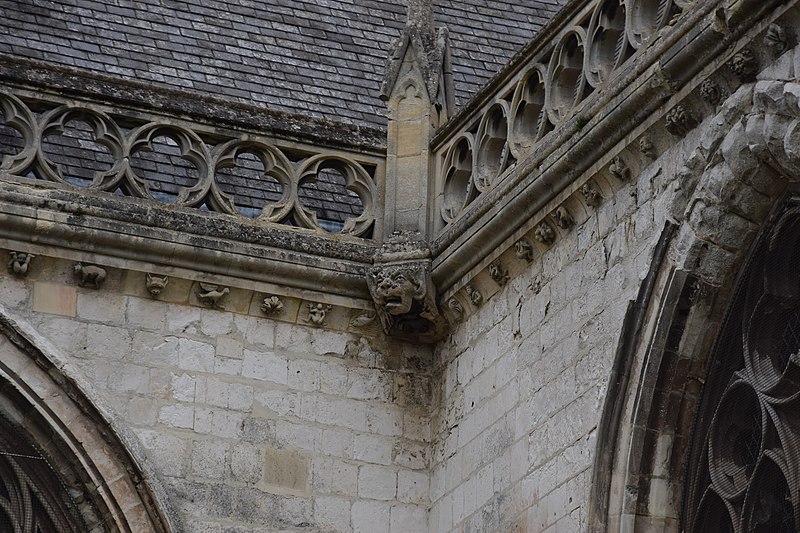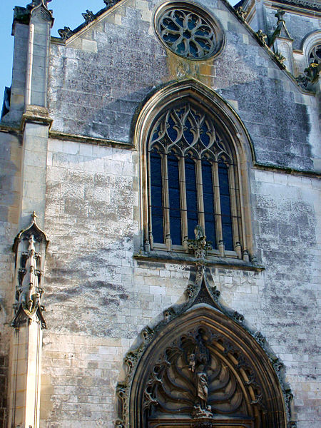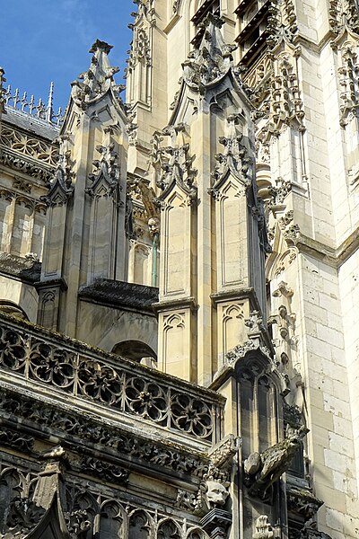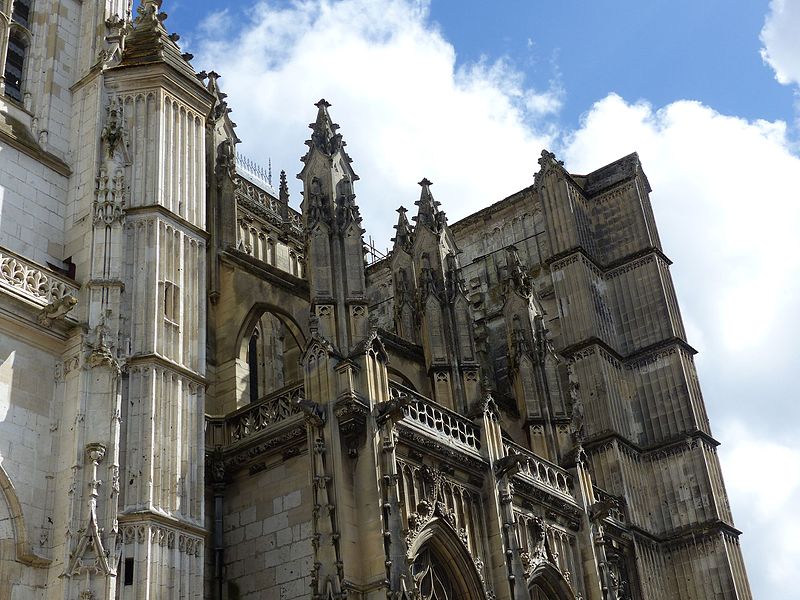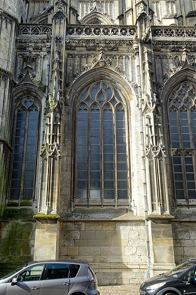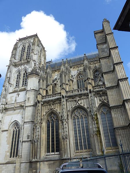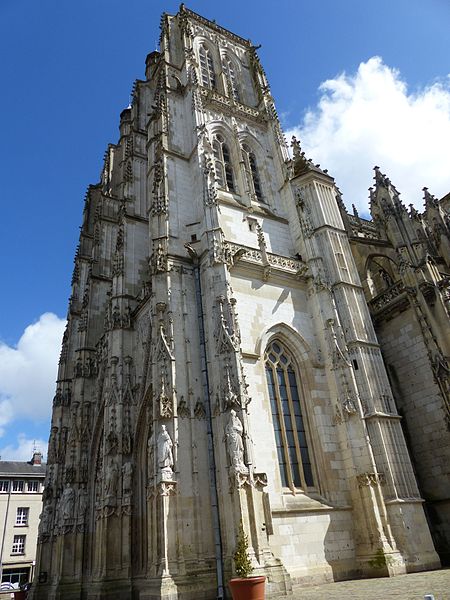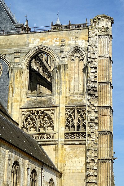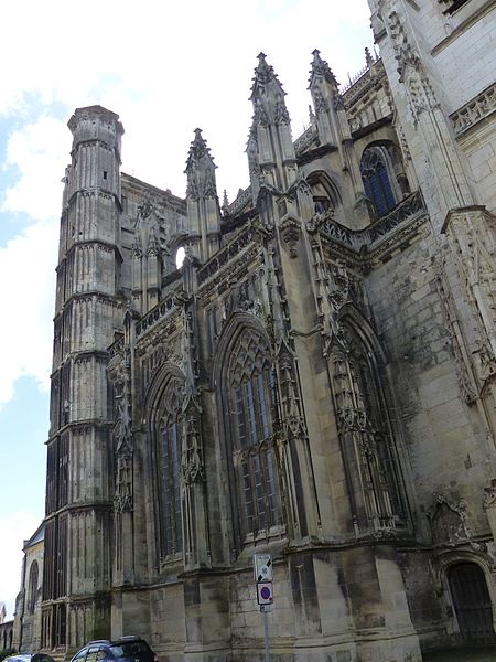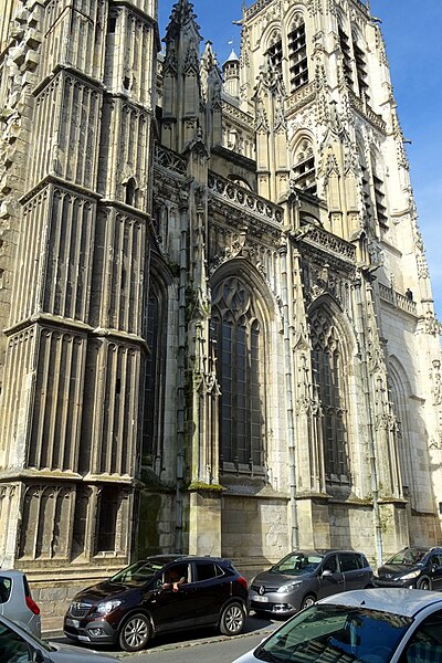 Les façades latérales sont renforcées par des piles et des arcs-boutants pour la première partie de la nef ; les murs ouest du transept, inachevés, conservent un décor flamboyant, alors que la partie orientale prolongée au XVIIe siècle et le chœur, renforcés par des contreforts, présentent un style plus sobre.