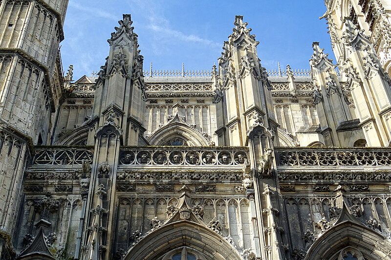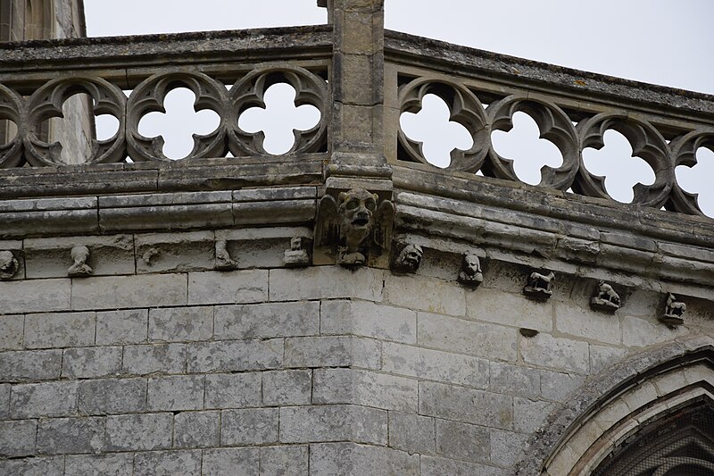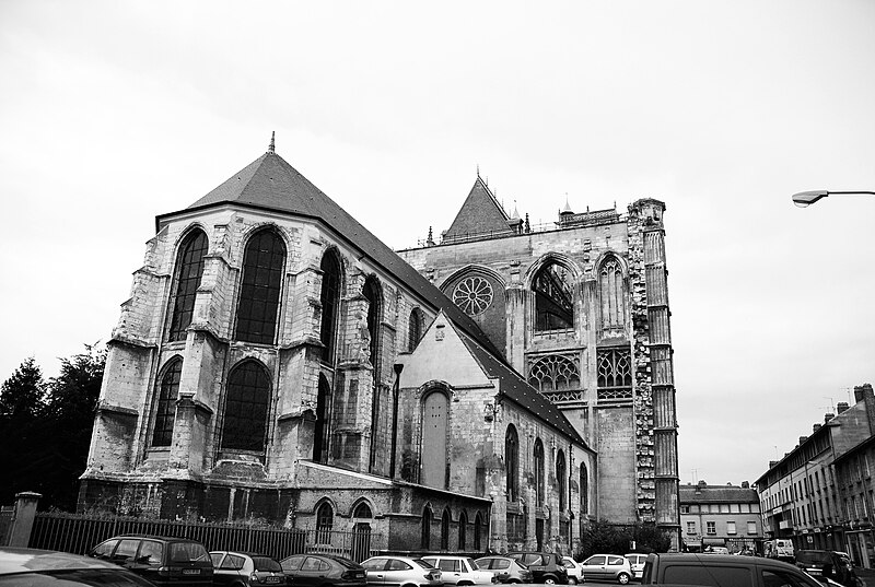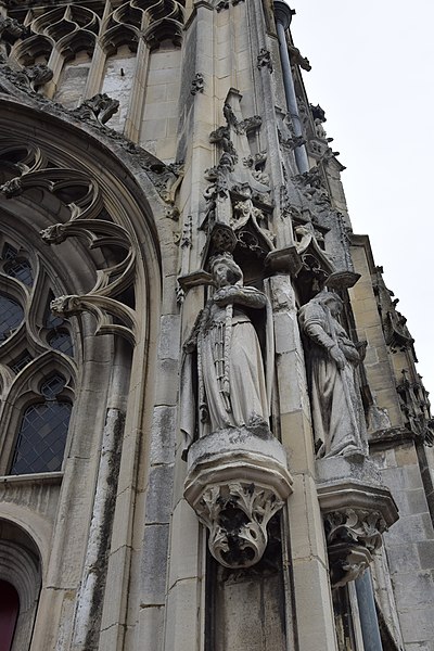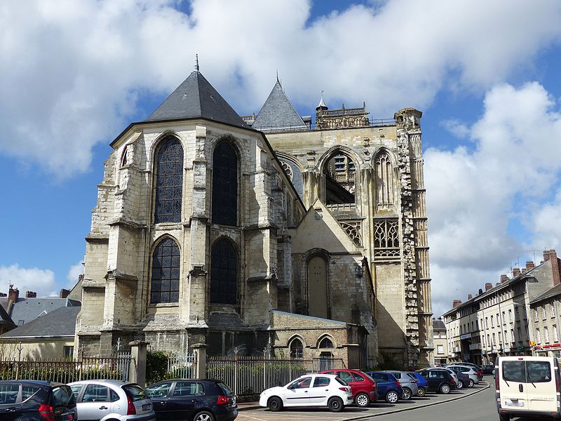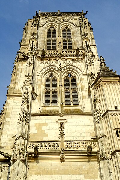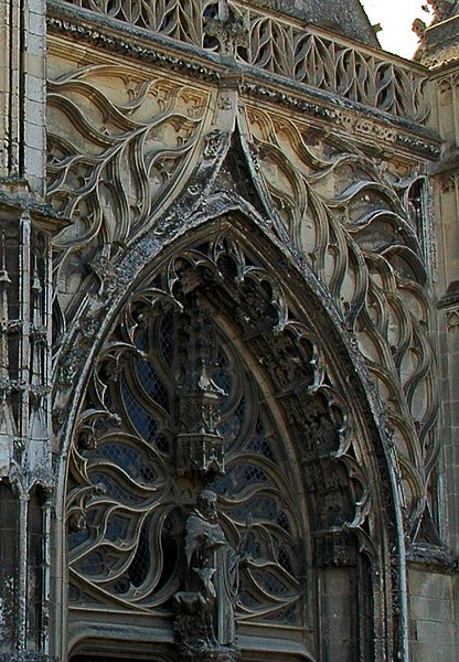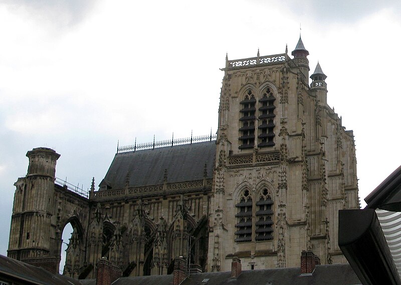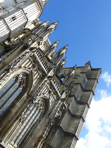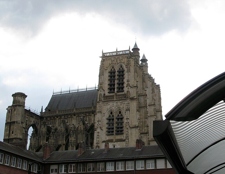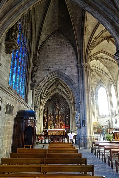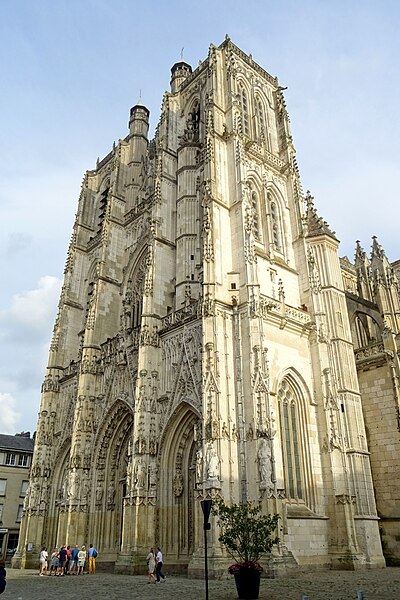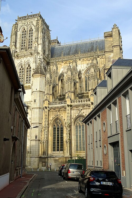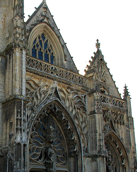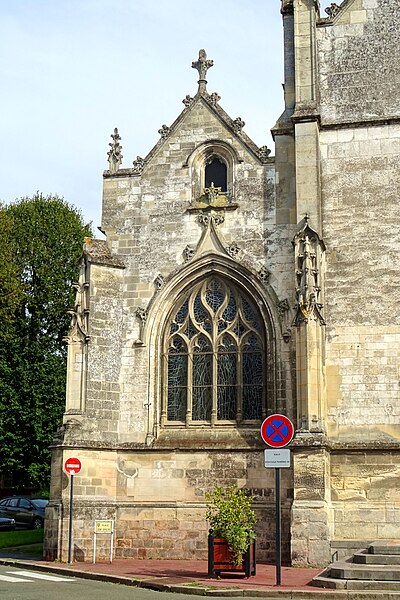 Les façades latérales sont renforcées par des piles et des arcs-boutants pour la première partie de la nef ; les murs ouest du transept, inachevés, conservent un décor flamboyant, alors que la partie orientale prolongée au XVIIe siècle et le chœur, renforcés par des contreforts, présentent un style plus sobre.