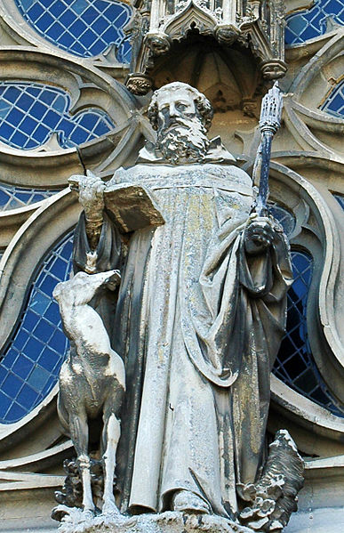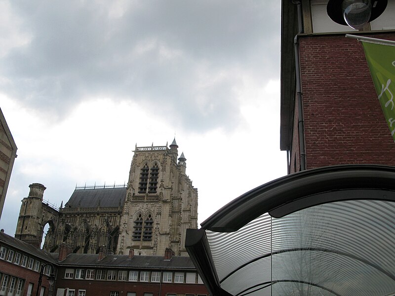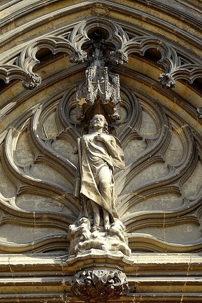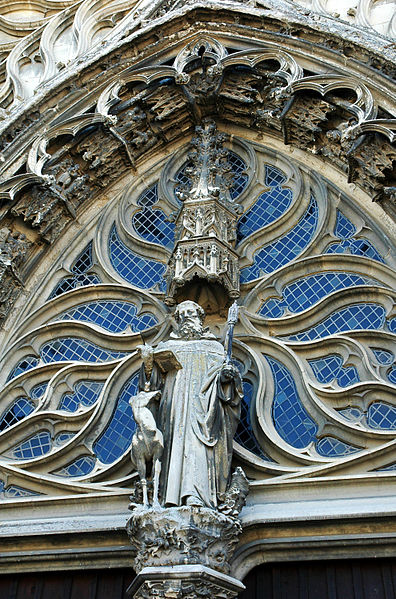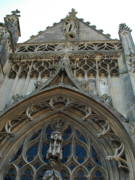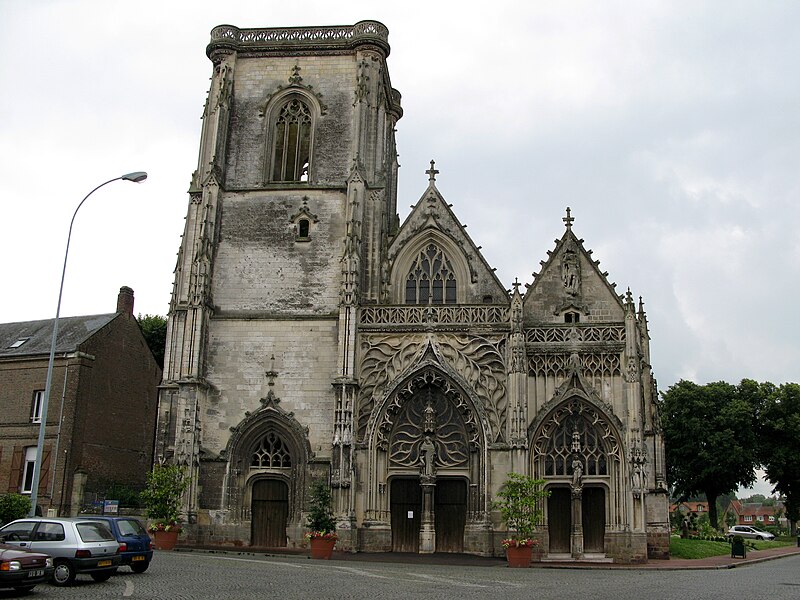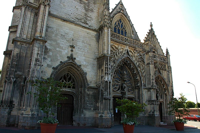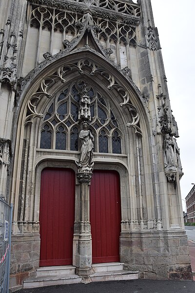 La façade principale, élevée sur trois étages et encadrée par deux tours hautes de 55,80 m, comporte trois portails donnant accès aux trois nefs ; une grande baie éclaire la nef centrale et le pignon sculpté, surmonté de la Trinité, domine l'ensemble. La sculpture abondante autour des portails reflète la dévotion des corporations contributrices plutôt qu'un récit unique : on y reconnaît notamment saint Vulfran, saint Nicolas, saint Firmin et saint Germain l'Écossais, des scènes de la vie du Christ sur les voussures et des scènes de la vie de la Vierge et des apôtres sur les vantaux en bois. Le portail nord présente la légende de saint Eustache au tympan, tandis que le portail sud porte des statues de l'Assomption et d'autres figures en costumes Renaissance, réalisées en 1501 par Pierre Lheureux et offertes par la corporation des merciers.