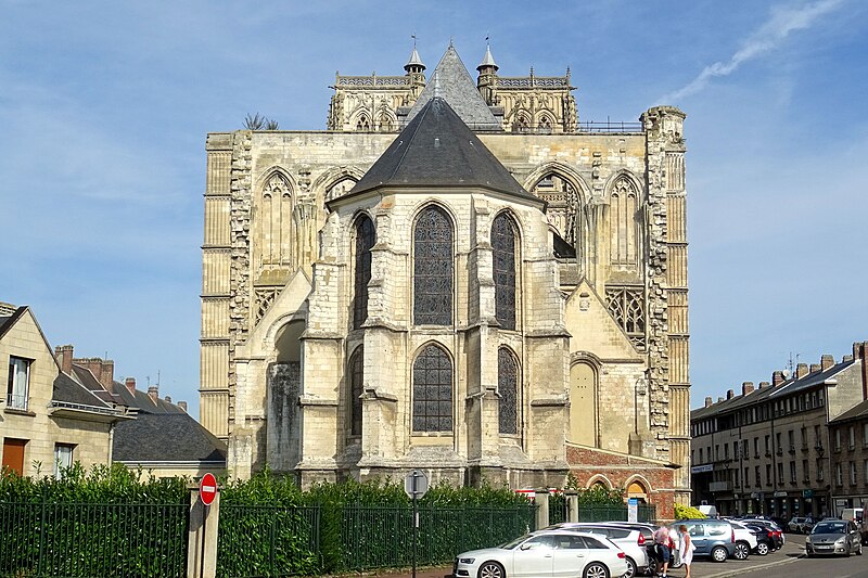 Le chapitre, appuyé financièrement par le roi, le comte du Ponthieu et la ville d'Abbeville, chercha à faire de Saint-Vulfran la plus belle église du Ponthieu et fit appel à Jean Crétel, maître maçon de Tours-en-Vimeu, nommé pour diriger les travaux en 1520 ; les pierres provenaient des falaises de Beaumetz et de Pont-Rémy. Les conflits, notamment les guerres de religion et les invasions espagnoles, ainsi que des difficultés financières, interrompirent le chantier : les fondations du chœur avaient été commencées en 1573, la confrérie des merciers obtint la reprise des travaux en 1621 et le chœur fut finalement achevé entre 1661 et 1663, les trois verrières supérieures de l’abside ayant reçu des vitraux en 1691.