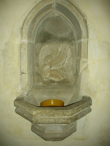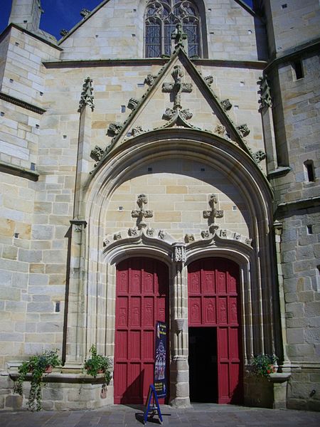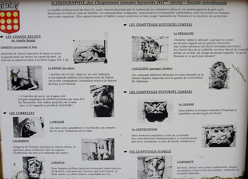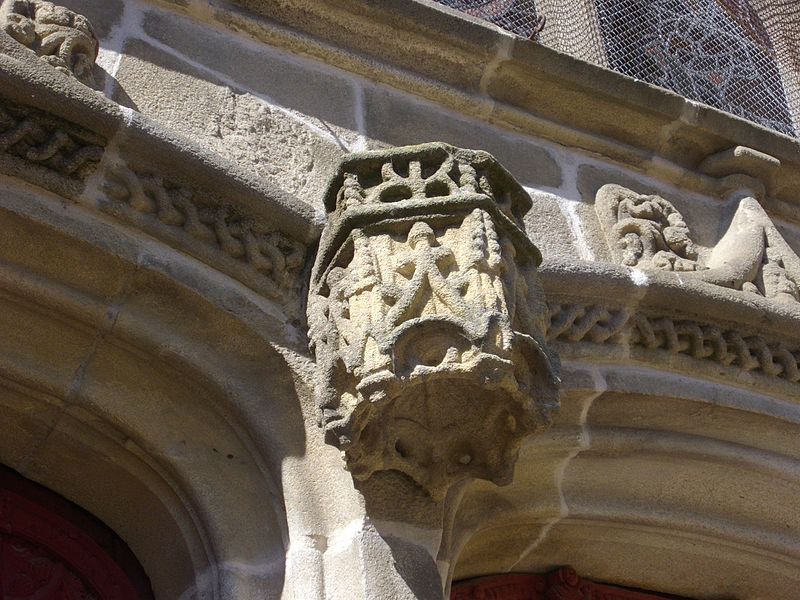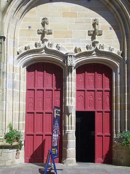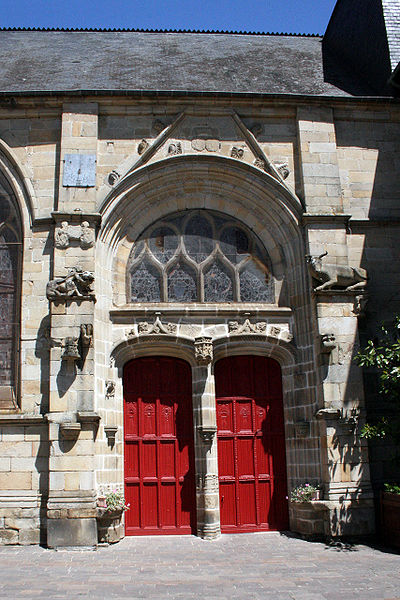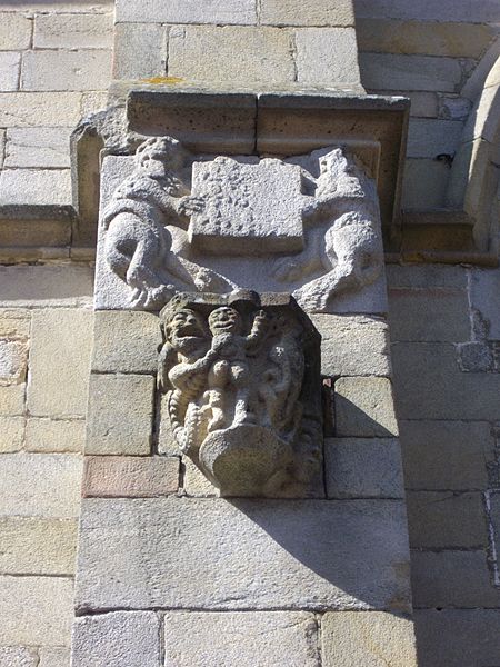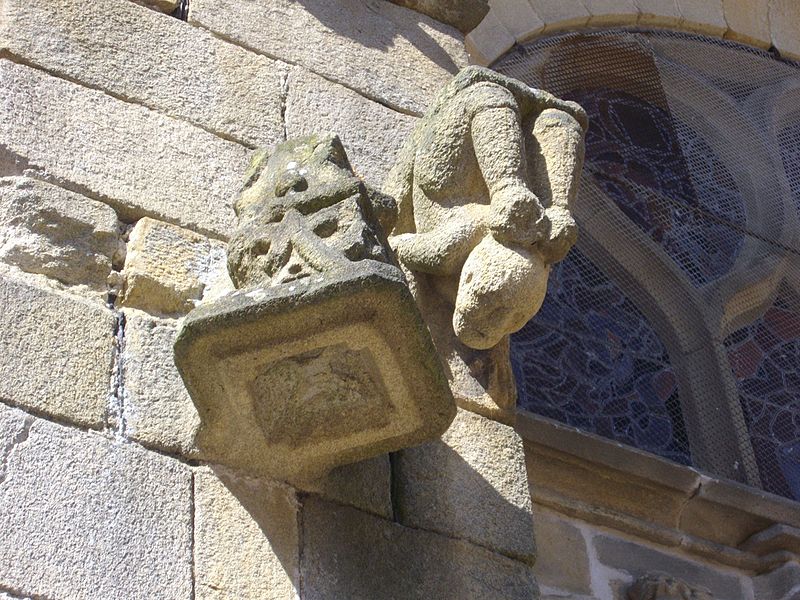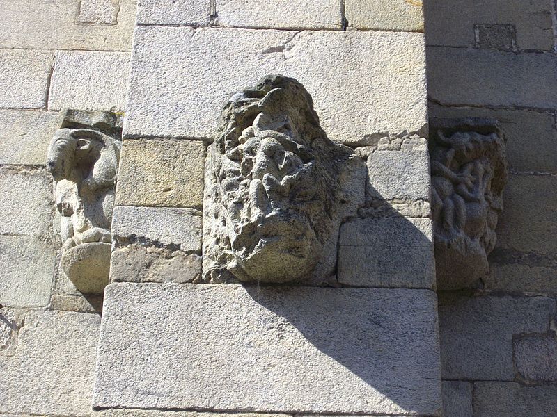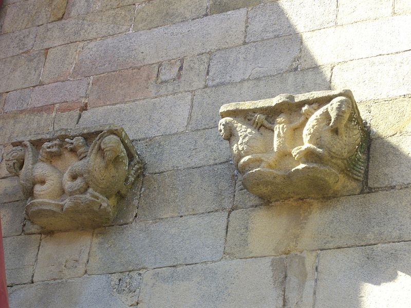 De nombreux éléments sculptés en réemploi, issus des parties disparues de l'édifice roman, sont visibles sur le mur sud de la nef : neuf chapiteaux, cinq modillons et deux reliefs, au registre varié comprenant animaux fantastiques, représentations des vices, atlantes et têtes, dont le style rapproche ces œuvres de Saint-Sauveur de Dinan et de Merlevenez sous influence poitevine. Deux sculptures en ronde-bosse encadrent le portail sud — le combat de Samson et du lion et un bœuf dont l'authenticité est discutée — et, d'après leur style, ces réemplois ont été datés entre 1160 et 1200 et pourraient provenir d'un grand portail occidental de même inspiration que celui de Saint-Sauveur de Dinan. Deux autres têtes barbues en réemploi, insérées au chevet et dans l'absidiole, présentent un style protogothique s'apparentant aux statues du portail royal de la cathédrale de Chartres.