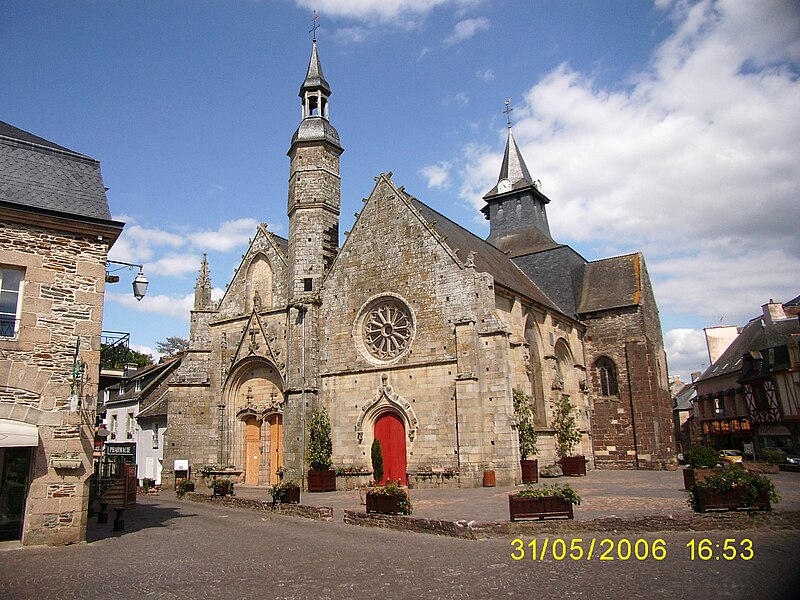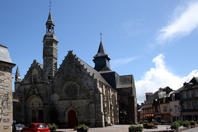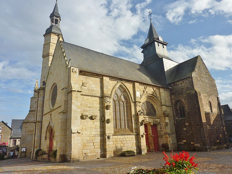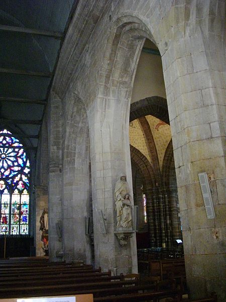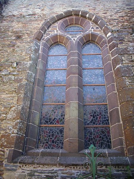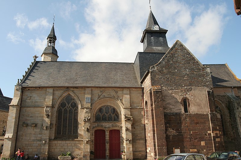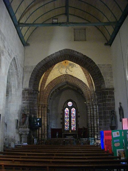 Les parties romanes conservées, exécutées en grès rouge, contrastent par leur couleur et leur matériau avec les extensions postérieures ; elles se distinguent à l'extérieur par des contreforts peu saillants et des fenêtres de faible dimension. La croisée porte un clocher carré surmonté d'une flèche en ardoise refaite au XIXe siècle. À l'intérieur, la partie romane de la fin du XIIe siècle est couverte de voûtes bombées tendues par des ogives plates, influence visible des cathédrales de Saint-Malo et d'Angers ; la croisée est rythmée par quatre grands arcs brisés à double rouleau qui retombent sur des piles cruciformes à colonnes engagées, et les chapiteaux sont ornés de feuilles lisses et de crochets d'angle, témoignant d'une transition entre roman et gothique. Trois des quatre compartiments de la voûte de la croisée conservent des peintures figurées attribuées au XIIIe siècle représentant notamment un félin unicorne, un éléphant de combat et un centaure.