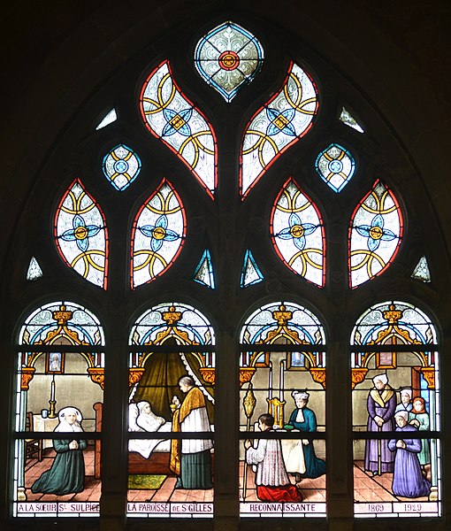 L'église Saint-Gilles se trouve à Saint-Gilles-Croix-de-Vie, dans le département de la Vendée. Une première église fortifiée, édifiée au IXe siècle pour les moines de Saint-Michel-en-l'Herm ou de Saint-Gilles-du-Gard, a été détruite pendant les guerres de Religion, à l'exception du clocher et du côté droit de la nef. Le bas-côté nord et le clocher ont été inscrits au titre des monuments historiques le 29 octobre 1926. Reconstruite en 1883, l'église a fait l'objet de restaurations en 1903 puis en 1977. Dans le bas-côté nord se trouvait un vitrail du XVIIe siècle, titré « Victoire de Louis XIII sur l'armée de Benjamin de Rohan de Soubise près de Saint-Gilles – 16 avril 1622 », qui a été classé en 1927 puis déclassé. L'édifice conserve aussi une copie de La Vierge au lapin de Titien, peinte en 1900 par Charles Atamian (1872-1947) et donnée par la famille de l'artiste en avril 1993. Un chemin de croix composé de quatorze tableaux et d'une fresque sur plaque de lave a été réalisé en 1979 par l'artiste local Henry Simon. Les photographies disponibles montrent les façades, le chevet et le clocher, des gargouilles, des vues intérieures (nef, autel, bas-côtés nord et sud), ainsi que plusieurs vitraux et œuvres peintes, notamment « Le B.P. Momfort quittant notre port s'embarque pour la mission de l'île d'Yeu », « A la sœur St Sulpice, la paroisse de Saint Gilles reconnaissante » et la scène de la victoire de Louis XIII évoquée ci‑dessus.