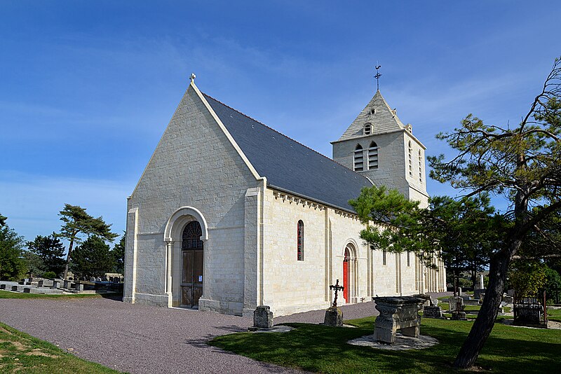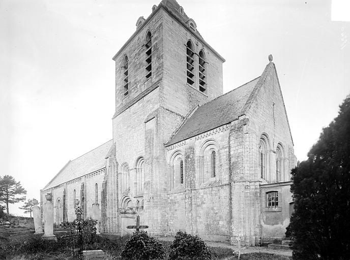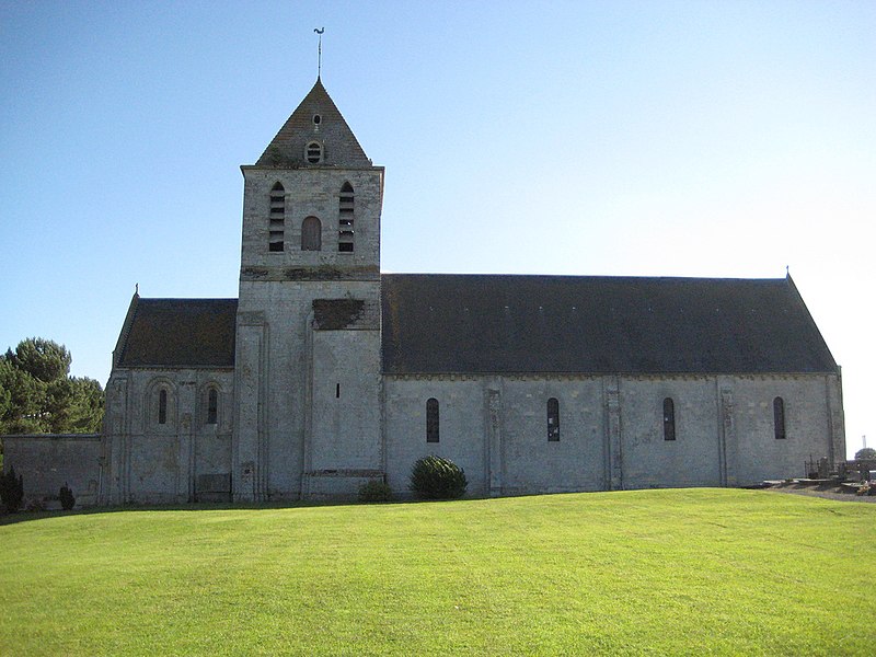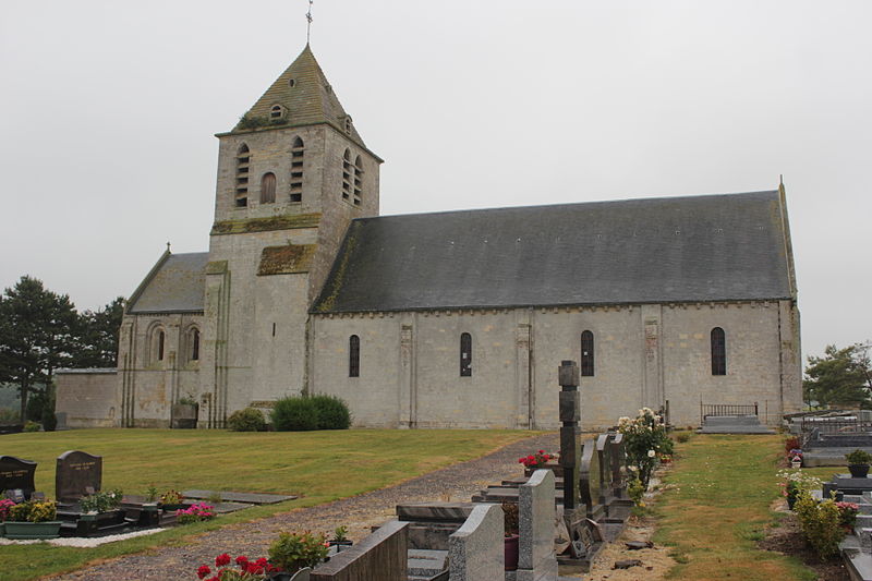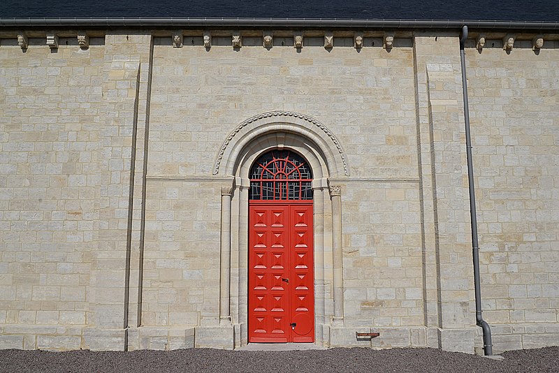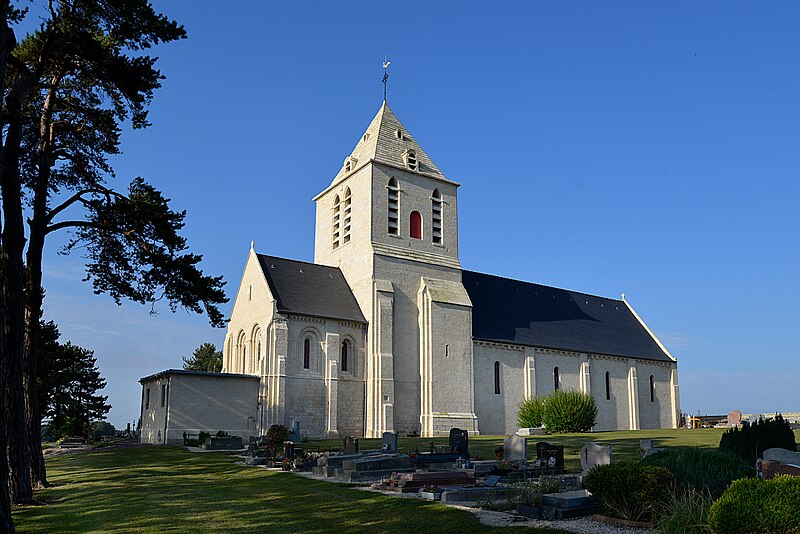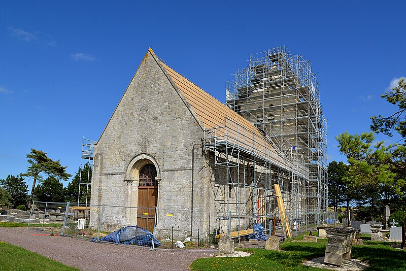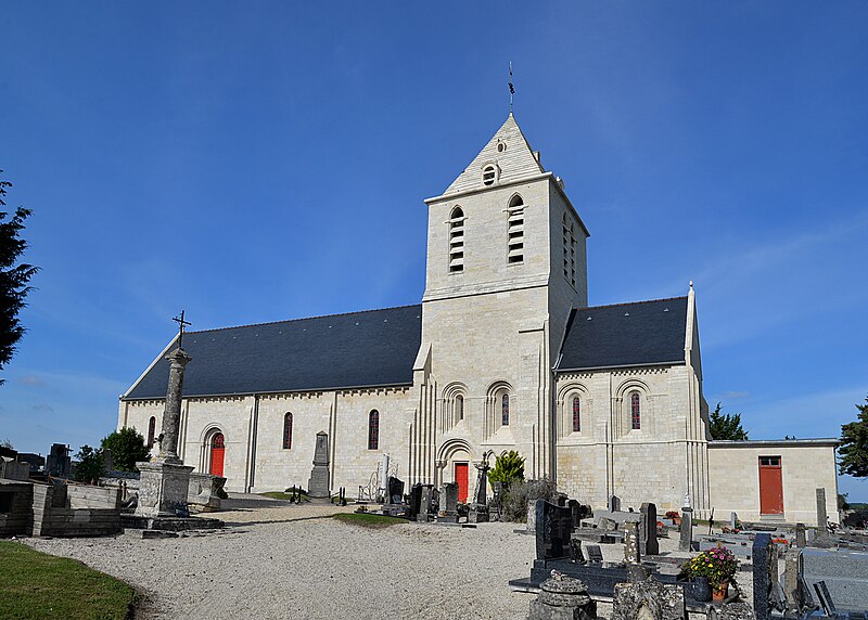 L'église Saint‑Hilaire se dresse sur la commune de Cairon, dans le Calvados; construite sur une butte à l'extérieur du village, elle domine le bourg. Datant du début du XIIe siècle, l'édifice a été inscrit au titre des monuments historiques le 16 mai 1927. Selon Arcisse de Caumont, la tour et le chœur relèvent du style ogival, tandis que la nef conserve des caractères romans. La partie supérieure de la tour, surmontée d'une pyramide à quatre pans, est moderne. L'église a conservé de beaux modillons ainsi que des fenêtres ornées de colonnettes et de modillons trilobés. Le coq du clocher a été restauré et reposé le 4 septembre 2020. Des photographies présentent l'édifice sous différents angles — vues sud et nord‑est — et montrent le portail, les colonnettes, la partie supérieure du mur avec quelques modillons, la nef et le chœur; certaines images datent de la rénovation de 2020.