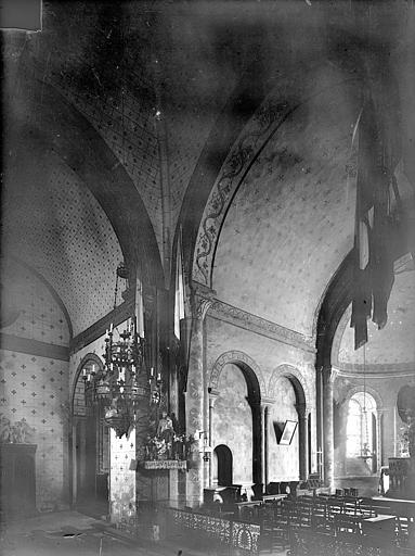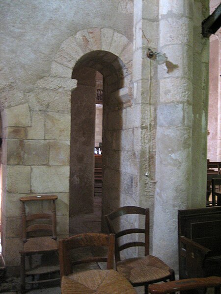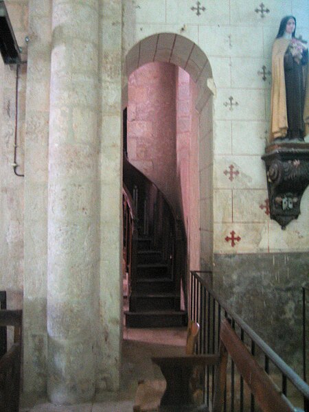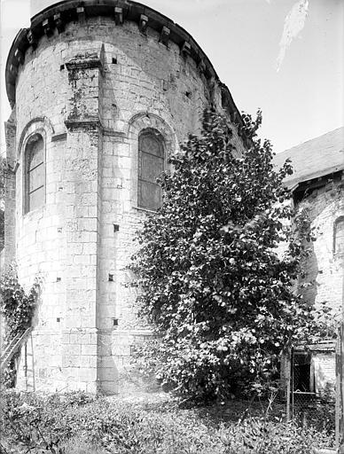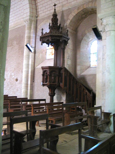 Le clocher est de plan carré, renforcé par des contreforts aux angles, et mêle des éléments romans et gothiques. La crypte, située sous le chœur, est accessible par deux escaliers dont les ouvertures s'ouvrent dans chacun des transepts ; chaque escalier débouche sur un couloir qui forme un vestibule d'entrée de part et d'autre de la crypte. La crypte proprement dite est organisée en trois nefs ; les deux nefs latérales constituent des bas-côtés qui, à l'ouest, sont réunis transversalement par une galerie située en arrière des deux travées principales. Chaque travée principale est divisée en deux par une colonne qui porte les arcs latéraux. Les trois nefs et leurs dépendances sont couvertes de voûtes en berceau plein cintre surbaissé, parallèles au grand axe de l'édifice. Une voûte moderne, composée de croisées d'ogives en plâtre, remplace la coupole qui surmontait autrefois le carré du transept. On relève également la présence d'un escalier de la crypte et d'un passage berrichon.