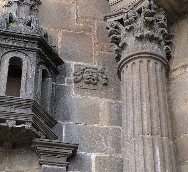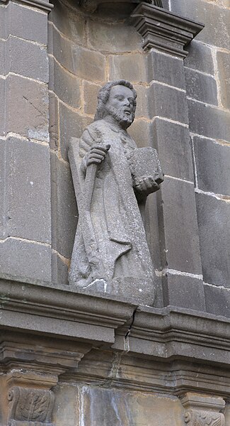 La façade de l'église, telle que l'a décrite Henri Waquet, se développe en plusieurs niveaux. Au rez-de-chaussée s'ouvre une large arcade en plein cintre, encadrée par deux colonnes corinthiennes cannelées et soutenant un entablement d'inspiration antique ; au-dessus se dresse un attique orné de trois niches à coquilles et de colonnettes, surmonté d'un fronton triangulaire. Un second attique, plus bas, porte un pignon dont les rampants, à courbe concave, sont doublés d'une balustrade, et l'ensemble est couronné par un lanternon à dômes et colonnettes. Aux angles, de robustes contreforts posés obliquement et subdivisés par de fortes moulures sont décorés de niches, petites arcades, modillons, pilastres et lanternons.