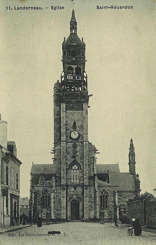 L'église Saint-Houardon est une église catholique située sur le côté léonard de Landerneau, dans le Finistère. Une première église se dressait sur la rive de l'Elorn ; elle a été reconstruite au XVIe siècle et enrichie en 1604 d'un porche méridional. Entre 1858 et 1861, l'édifice des XVIe et XVIIe siècles a été démonté puis reconstruit au centre-ville d'après les plans de l'architecte diocésain Joseph Bigot, les travaux étant exécutés successivement par les entrepreneurs Nestour, puis Laville et Jean-Louis Le Naour pour le clocher, l'opération ayant été financée par Napoléon III. Le clocher du XVIe siècle a été remployé et porte la date de 1856 ; le porche sud, d'époque XVIIe, a également été remployé. Le portail et la tour ont été classés monuments historiques le 4 août 1916.