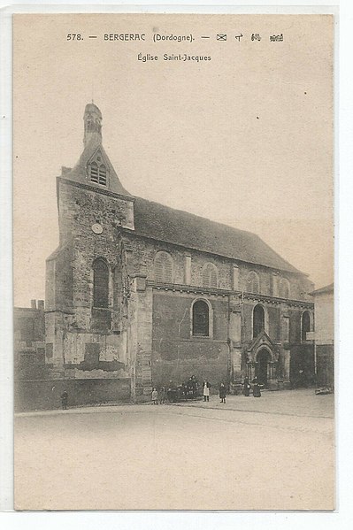 L'église Saint-Jacques, située dans le cœur historique de Bergerac (Dordogne), dépend du diocèse de Périgueux. Elle est dédiée à saint Jacques en raison de sa position sur le chemin de Saint-Jacques de Compostelle et fait partie de la paroisse Saint-Jacques-en-Bergeracois, qui regroupe les anciennes paroisses de la ville et des communes voisines. Une première chapelle Saint-Jacques est mentionnée en 1088 dans une bulle du pape Urbain II ; elle aurait été fondée par les moines de l'abbaye de Saint-Florent près de Saumur, installés à Bergerac au prieuré Saint-Martin. Les soubassements actuels remontent au XIIe siècle. L'édifice fut détruit par les Anglais en 1345 après la bataille de Bergerac ; une nouvelle église fut achevée en 1377, année où les consuls et jurats prêtèrent serment de fidélité au duc d'Anjou en présence du connétable Bertrand Duguesclin. Au début du XVIe siècle l'église fut agrandie, avec un nouveau clocher et un chœur. Pendant les guerres de religion, la ville passa au protestantisme et, en 1553, l'église fut pillée et partiellement détruite ; seul le clocher-tour au-dessus du chœur, percé d'un œil-de-bœuf, résista, les démolisseurs réutilisant des pierres pour construire des remparts. À la fin du siècle les religieux revinrent ; le prieur racheta les ruines et les releva en 1620 en vue de la visite de Louis XIII en 1621, puis les remparts furent démolis. L'édifice prit son aspect actuel à partir de 1685 grâce aux dons de Louis XIV, du prieur Jean Duffau et des consuls, la reconstruction s'appuyant sur les premières fondations. Selon le plan adopté, l'église présente un plan carré à trois nefs (vaisseau central et deux collatéraux), une toiture d'ardoises pour le clocher, des tuiles plates pour le reste et un clocheton ; les façades et le portail datent de la fin du XVIIe siècle et du début du XVIIIe siècle. Le clocher-mur qui termine le bas-côté sud appartient au XVe siècle, tandis que le clocher-tour abritant le chœur est du XVIe siècle. En 1672, la communauté des vingt-quatre prêtres de Saint-Martin fut rattachée à la Mission et au séminaire de Périgueux. Sous la Révolution, l'église fut fermée et le culte interdit. Les décors et les voûtes datent de 1870 ; l'intérieur a été en partie vidé au début des années 1970 pour se conformer à la nouvelle interprétation du concile Vatican II. L'édifice a été inscrit au titre des monuments historiques le 28 décembre 1974. Il abrite un orgue Cavaillé-Coll de 1877, classé au titre des objets des monuments historiques en 1993 et restauré en 2014. La messe dominicale y est célébrée le dimanche soir à 18 h 30. On peut observer l'église depuis le bas de la place Pélissière ; son clocher-tour, son œil-de-bœuf et son intérieur constituent les principaux éléments remarquables.