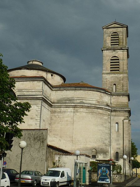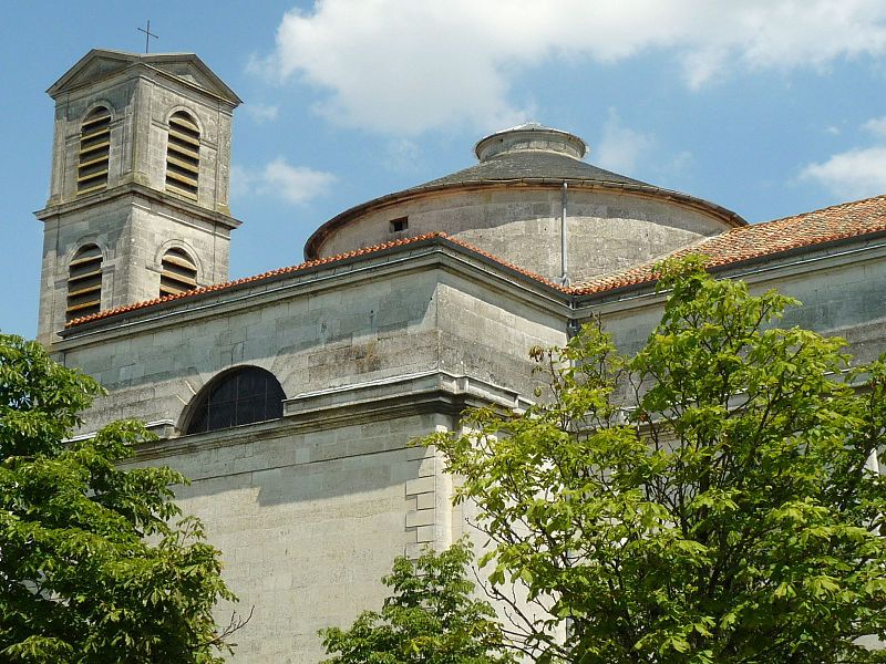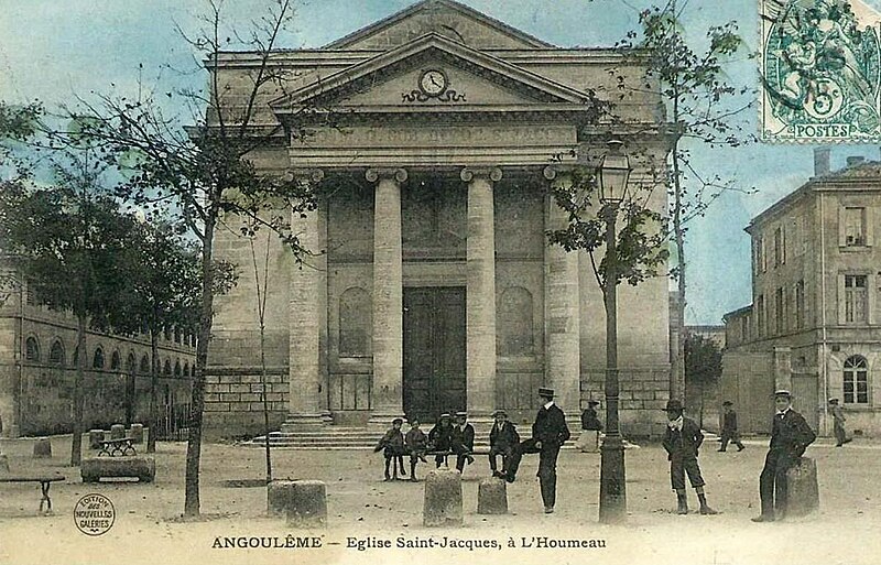 L'église Saint-Jacques de Lhoumeau est l'église paroissiale du faubourg de l'Houmeau à Angoulême, dans le département de la Charente et le diocèse d'Angoulême ; elle est inscrite au titre des monuments historiques depuis 2001. Elle est dédiée à Jacques le Majeur, figure du pèlerinage à Saint-Jacques-de-Compostelle. Une église antérieure, relevant de l'abbaye de Saint-Cybard et liée au pèlerinage jacquaire, remontait à 1110 ; elle avait un plan en croix et se trouvait à l'est de l'édifice actuel. Le bâtiment néo-classique actuel a été édifié entre 1840 et 1843 par Paul Abadie père pour remplacer l'ancienne église qui menaçait ruine. L'architecte a conservé la nef unique, le plan en croix latine et l'abside semi-circulaire, mais le nouvel édifice n'est pas orienté. Il est construit en pierre de taille calcaire ; la couverture associe tuile creuse et zinc pour la coupole et le clocher. Le plan comprend une croix latine précédée d'un porche ; le carré du transept est couvert d'une coupole surhaussée, pourvue en son centre d'un oculus sous un lanternon. L'abside en hémicycle est couverte d'un cul-de-four ajouré d'un oculus, et le clocher rectangulaire attenant à l'abside compte trois étages. Deux sacristies sont disposées le long des bras du transept. Le porche principal, élevé sur quatre marches, repose sur quatre colonnes ioniques et s'achève par un fronton triangulaire bordé de modillons ornés de rosaces ; il abrite la porte d'entrée flanquée de deux niches contenant des statues réalisées par Pajot. Deux portes latérales, précédées d'un emmarchement, donnent également accès à l'église sous un porche au fronton soutenu par deux colonnes. L'ensemble de l'édifice est couronné d'un étage d'attique au-dessus d'une corniche saillante. L'architecture, de style néo-classique, fait référence aux temples grecs par la colonnade et les frontons, caractéristique des réalisations de Paul Abadie. La décoration intérieure, entièrement peinte, a disparu lors des bombardements de 1944 qui ont endommagé l'édifice. Des travaux de reconstruction d'une partie de l'église ont été entrepris en 1960 et achevés trois ans plus tard. L'orgue, construit en 1787 par Schwaerdt pour le couvent des bénédictines de Saint-Ausone, a été attribué à Saint-Jacques lors de la Révolution et installé en 1803 ; il a été restauré en 1847 par Leymarie et Trouillet, agrandi par Aristide Cavaillé-Coll en 1892, épargné en 1944 et réinstallé dans la tribune. Il a fait l'objet d'une restauration récente et a été inauguré en décembre 2024. En août 2020, l'évêque d'Angoulême a confié l'église à la communauté de l'Oratoire de saint Philippe Néri en projet de fondation, qui devrait s'y installer définitivement en juin 2026. Des vues montrent l'église depuis les remparts d'Angoulême, le fronton et la colonnade, le clocher et l'abside, la nef ainsi qu'une statue de saint Matthieu.