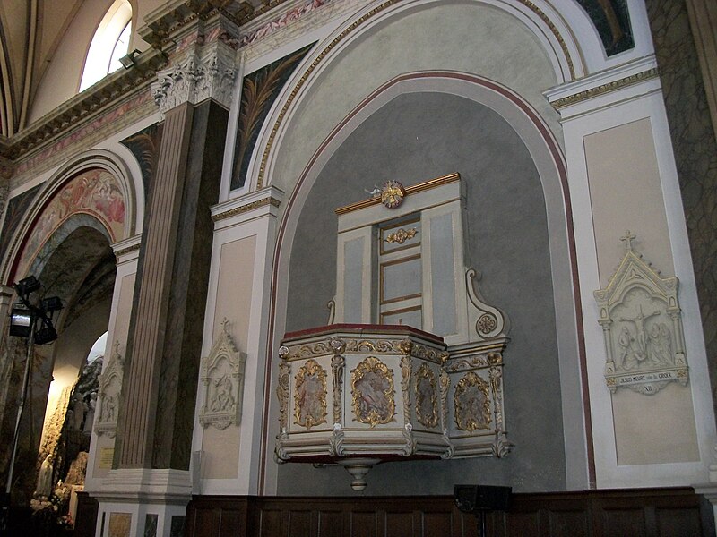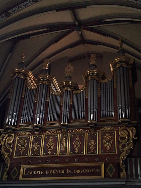 L'orgue actuel, daté de la première moitié du XIXe siècle, est un instrument de transition dit romantique ; ses jeux de fonds et ses jeux de récit et d'anches favorisent à la fois la méditation et l'accompagnement du chant. Le buffet, richement décoré, porte une inscription latine tirée d'un psaume évoquant la louange par l'orgue. L'instrument a fait l'objet d'achats et de transformations au XIXe siècle (notamment en 1838, 1845, 1858, 1865 et 1886) puis d'une restauration complète de 1989 à 1991 ; la partie instrumentale est classée au titre d'objet depuis 1979 et le buffet est inscrit depuis 2006. De chaque côté de l'orgue se trouvent deux tableaux, à gauche un évêque (saint Germier ou saint Exupère), à droite la treizième station du chemin de croix.