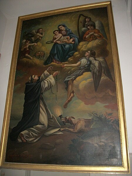 La chapelle Saint Dominique présente, sur son autel, deux statues en marbre de Notre‑Dame du Rosaire remettant le rosaire à saint Dominique, un tableau peint par Antony Guiraud en 1855 représentant la Vierge entourée d'anges et saint Dominique recevant le rosaire, ainsi qu'une plaque commémorative pour les morts de la ville de Cazères. La chapelle Saint Antoine de Padoue contient, au fond, l'entrée du baptistère.