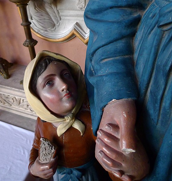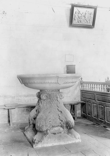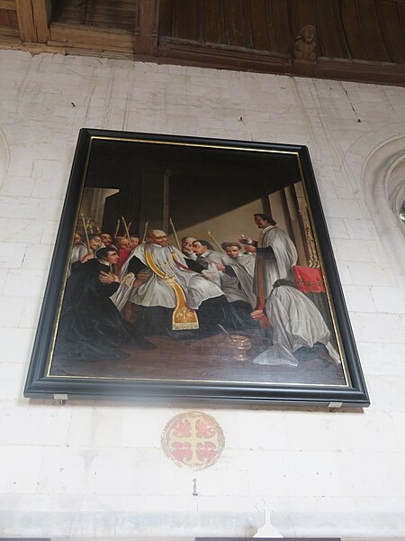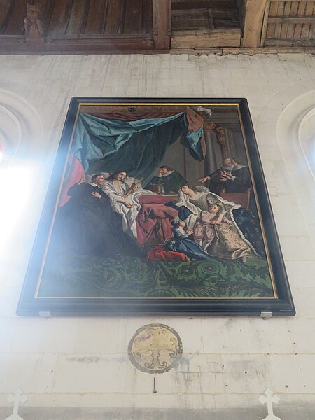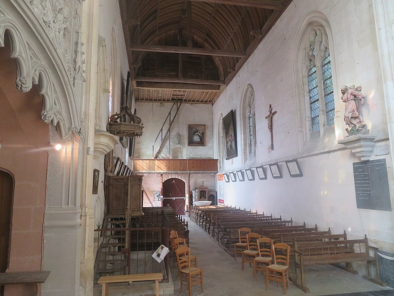Dans la nef se trouvent la chaire d'où Vincent de Paul prêcha et les fonts baptismaux ; la vasque en marbre de Carrare porte la chaîne et les armes de la famille de Lannoy et repose sur un socle en pierre locale décoré de feuilles d'acanthe. Trois tableaux du XIXe siècle, copies d'œuvres disparues de Jean-François de Troy et de Jean Restout d'après des estampes de 1737, représentent des épisodes de la vie de Vincent de Paul ; ces peintures, probablement issues du collège lazariste de Montdidier et données au curé de Folleville en 1913, ont été classées monuments historiques en 2010. Le chœur conserve une piscine sculptée portant les monogrammes de Raoul et Jeanne de Lannoy et, au-dessus du maître-autel, un crucifix accompagné d'un groupe sculpté représentant la Vierge et saint Jean l'Évangéliste. La fenêtre axiale a partiellement conservé un vitrail de la Crucifixion du XVIe siècle restauré au XIXe siècle, et deux vitraux ont été posés dans les baies voisines par l'atelier Courageux à l'automne 2022 et au printemps 2023. Derrière le maître-autel, un grand enfeu flamboyant, aujourd'hui vide, abritait une mise au tombeau transportée par Philippe-Emmanuel de Gondi à l'église Saint-Jean de Joigny ; l'entablement est sculpté d'anges portant les instruments de la Passion et du Christ ressuscité apparaissant à Marie-Madeleine.
