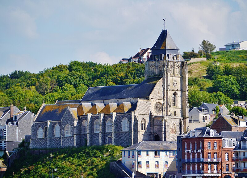 L'église Saint‑Jacques, église catholique du Tréport (Seine‑Maritime), est classée au titre des monuments historiques en 1840. Au début du XIe siècle, le comte d'Eu détourna la Bresle pour étendre le port, ce qui fragilisa l'église. Elle ne résista pas aux intempéries et s'effondra en 1360. Le bâtiment fut reconstruit, mais fut ensuite rasé par les Anglais et les Huguenots. La troisième reconstruction aboutit dans la seconde moitié du XVIe siècle et l'église s'installa définitivement sur le coteau, à côté de l'abbaye Saint‑Michel. Elle présente des façades en damier de grès sombre et de silex, typiques de la région. L'intérieur se distingue par des clés de voûte pendantes du XVIe siècle et par un chemin de croix en terre de Sienne. Un escalier de 73 marches, côté port, mène à l'édifice. Le portail, abrité par un porche en grès, révèle un travail soigné. Le pilastre qui sépare les deux portes, où se trouve un bénitier très ancien, porte une statue de la Vierge. Au sud du portail s'élève une tour du XVIe siècle dont le sommet inachevé est surmonté des statues d'un évêque et de saint Jean l'Évangéliste. L'édifice mesure environ 44 mètres de long, 19,60 mètres de large et 15 mètres de haut ; ses clés de voûte sont remarquables. Le chœur est fermé depuis 1857 par une balustrade de style du XVIe siècle. Toutes les fenêtres, récemment restaurées, sont ornées de vitraux provenant des ateliers de M. Lusson à Paris, notamment celles du sanctuaire et de la chapelle de la Vierge. La chapelle à droite du chœur contient un ancien maître‑autel et un retable en bois sculpté. La petite chapelle de la Vierge, à gauche de la nef, abrite un bas‑relief représentant la Vierge portant le Christ mort (pietà) et d'autres personnages liés à la Passion. On peut notamment observer la nef, la façade sud, le mur en damier, le portail principal à l'ouest et la pietà.