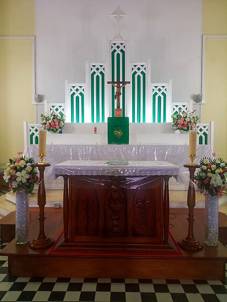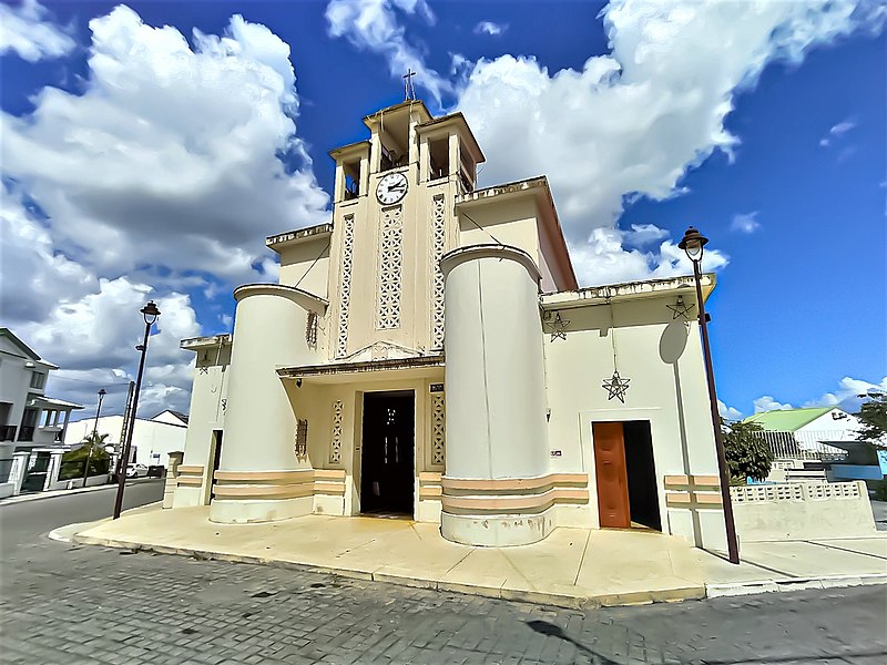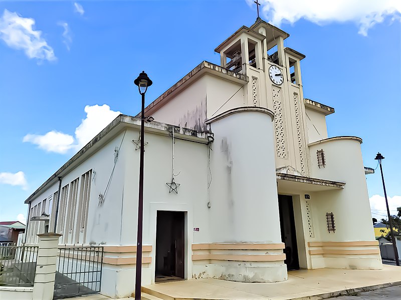 Bâtie dans un style Art déco marqué d'influences soudanaises, l'église présente un parti architectural caractéristique d'Ali Tur. La façade est dominée par deux gros cylindres de part et d'autre du porche, inspirés d'un texte de Le Corbusier (1923) sur les silos à grain d'Amérique du Nord, en particulier ceux du port de Montréal, et envisagés comme un retournement d'absides. Le corps de l'édifice suit un rythme ternaire avec une nef centrale et deux nefs latérales, chacune accessible par un portail. La façade très ajourée comporte trois bandes de claustras verticaux assurant la ventilation naturelle, surmontées de trois clochetons et d'une horloge. Les nefs latérales sont équipées de huit groupes de hautes persiennes en bois disposées en triades sur toute leur longueur, avec au sommet une série de claustras laissant entrer la lumière et favorisant la ventilation. Le sol est recouvert d'un carrelage de couleurs — rouge sombre et noir sur fond beige — dont le dessin délimite les espaces de circulation et de recueillement. L'église comprend un autel.