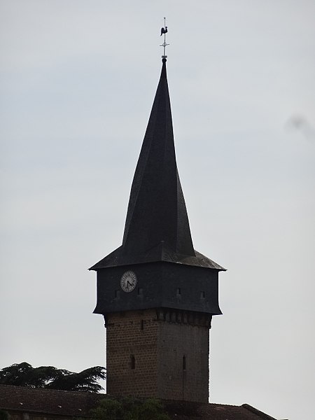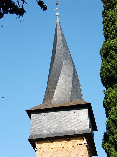L'église est surtout connue pour son clocher tors, terminé par une flèche hélicoïdale. Le clocher, accolé au pignon qui s'ouvre par une porte en arc brisé, présente un fragment de pierre tumulaire enchâssé dans le mur près de la porte ; sur la façade nord subsiste, près d'une porte latérale, un encadrement de porte du XIVe siècle. De plan carré, le clocher comporte un étage supérieur en léger débord et est couvert d'une pyramide surmontée d'une haute flèche octogonale dont les arêtes inférieures s'inclinent de gauche à droite d'un huitième de tour tandis que les arêtes supérieures restent droites ; elle est couverte d'ardoises et atteint 50 mètres de hauteur. La tradition locale attribue le torsement de la flèche aux vents, mais sa construction semble avoir été volontaire. La charpente, qui avait souffert de réparations hâtives après la Seconde Guerre mondiale, a conduit à la reconstruction de la flèche en 1971.