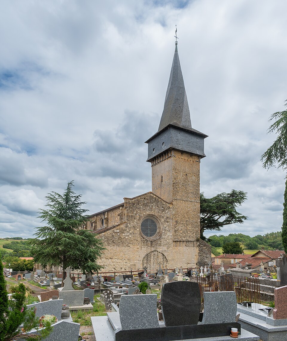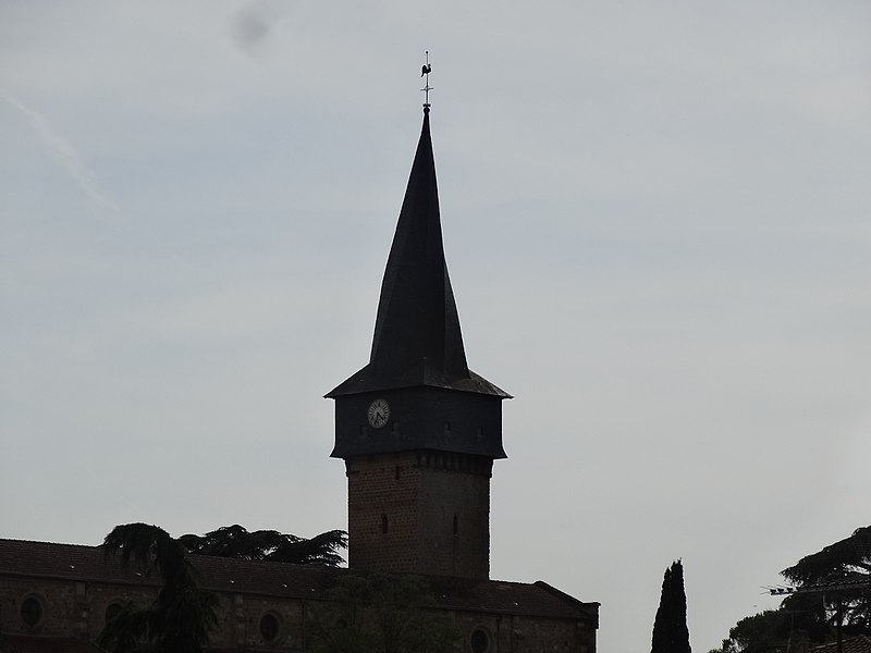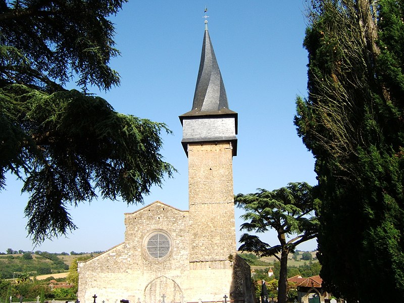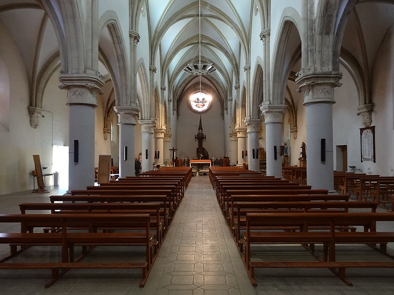 L'intérieur comporte une nef divisée en six travées, voûtée d'arêtes croisées et flanquée de deux collatéraux, éclairée par des oculi en partie haute ; les bas-côtés présentent des fenêtres ogivales. La nef mesure 48 mètres de long, 17,50 mètres de large et 18 mètres de haut sous clef. Le mobilier conserve des éléments anciens : des stalles d'origine du XVIe siècle, partiellement récupérées après avoir été vendues légalement à des antiquaires en 1926 à la suite d'une campagne menée par le duc de Trévise et Gilbert Brégail, la majeure partie se trouvant désormais à l'église Saint-Michel de Mauvezin ; on relève aussi un lutrin du XVe siècle et, dans la sacristie, une pietà des XVIIe–XVIIIe siècles. Quelques objets de l'édifice sont référencés dans la Base Palissy. Des vues photographiques montrent le pignon est, la charpente et l'inscription à l'entrée de l'église.